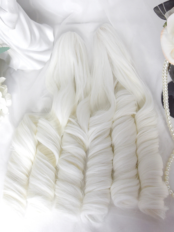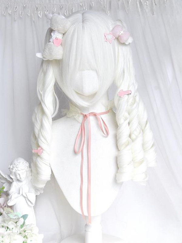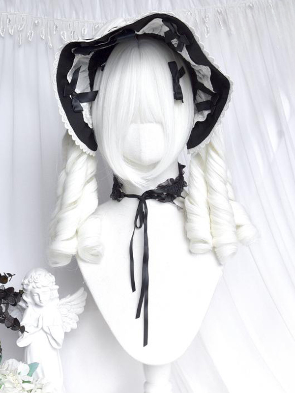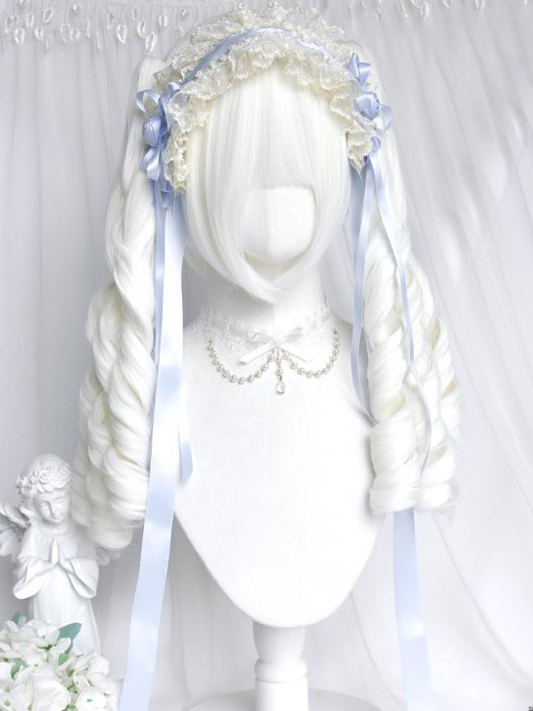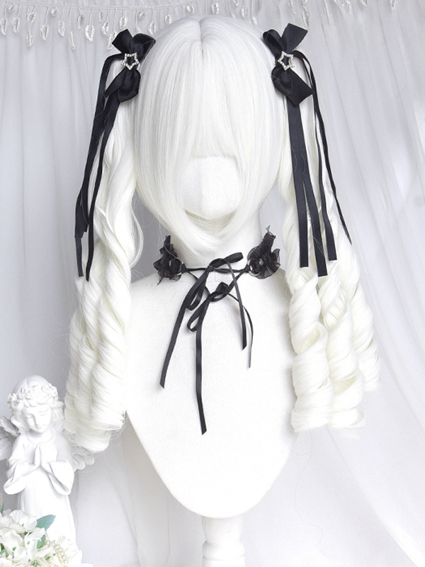 Peluca Lolita con lazos de fibra resistente al calor dos coletas rizadas y flequillo accesorios Lolita blancos