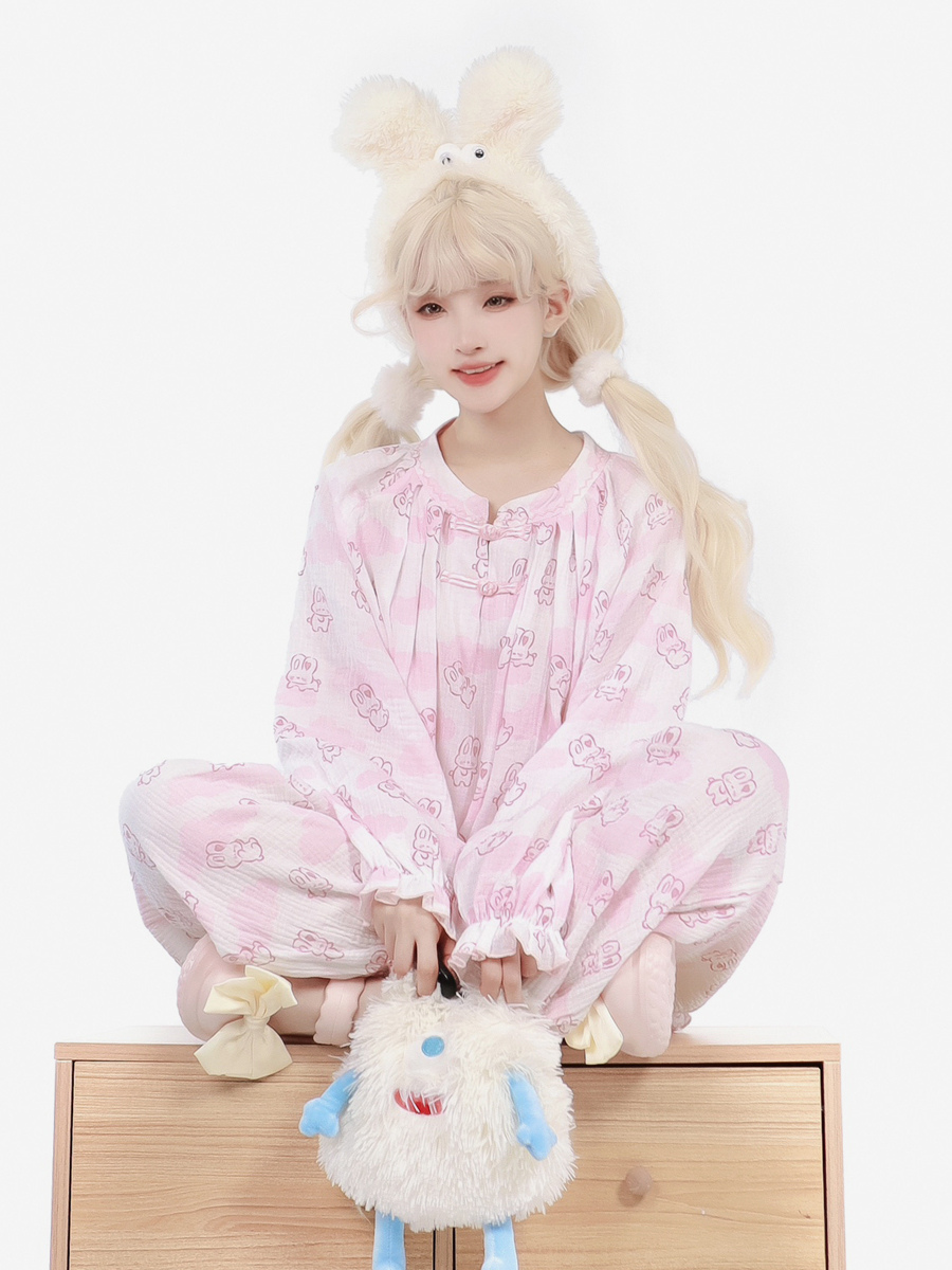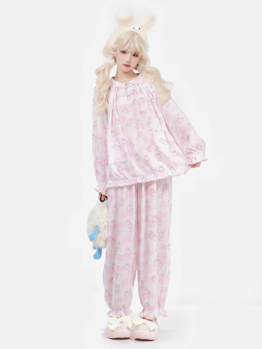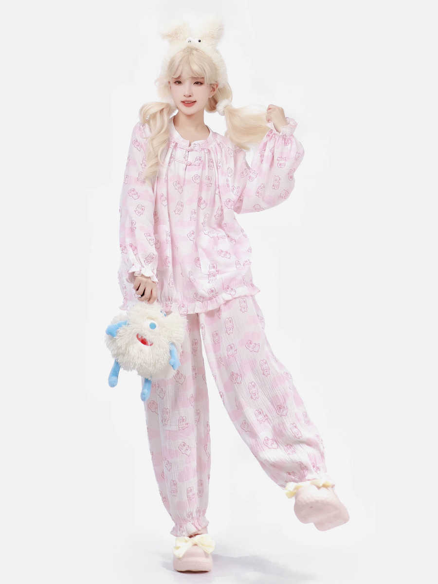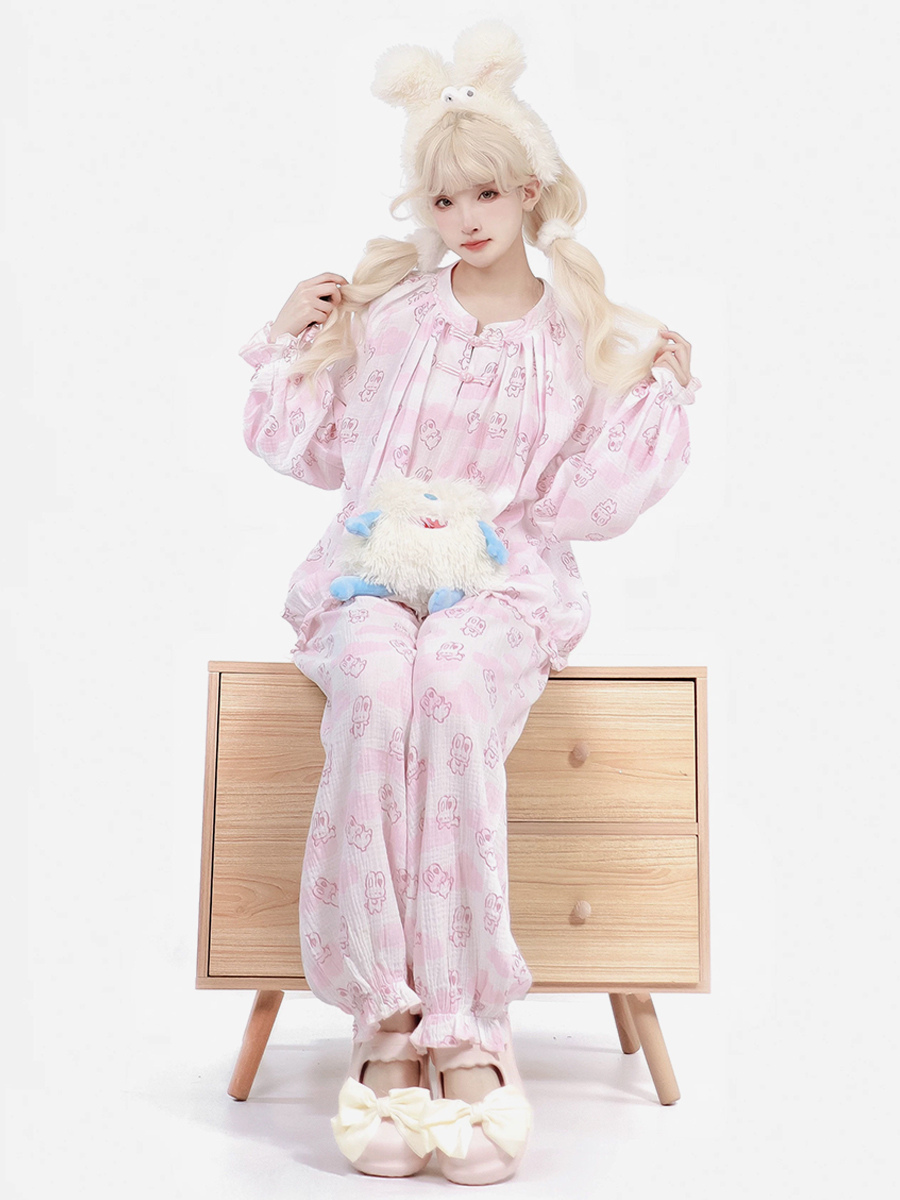 Pijamas Kawaii Ropa de dormir para el hogar Especiales Lolita Rosa Interior Cuello joya Volantes Mangas acampanadas Mangas largas Tops dulces Pantalones Conjuntos