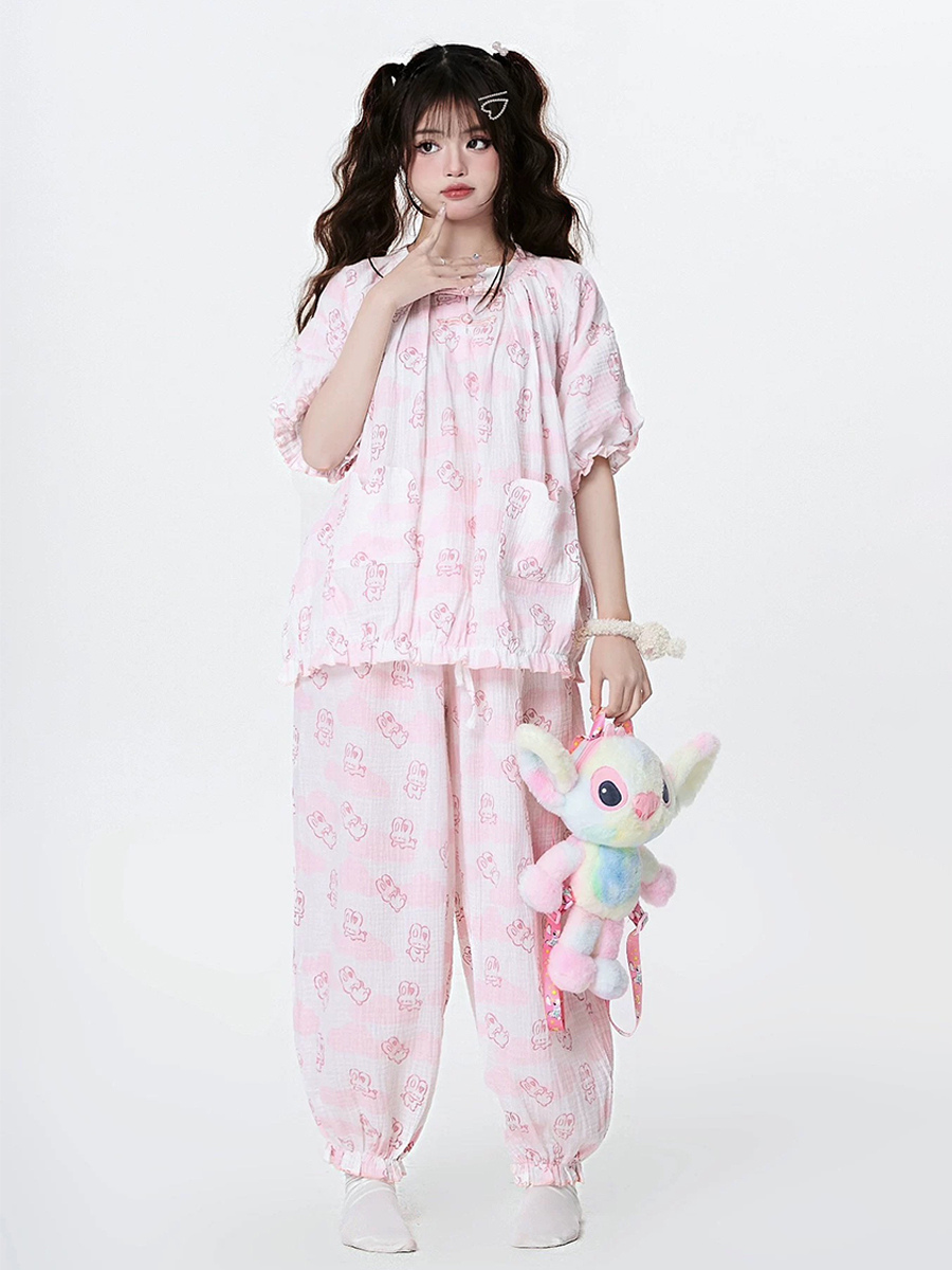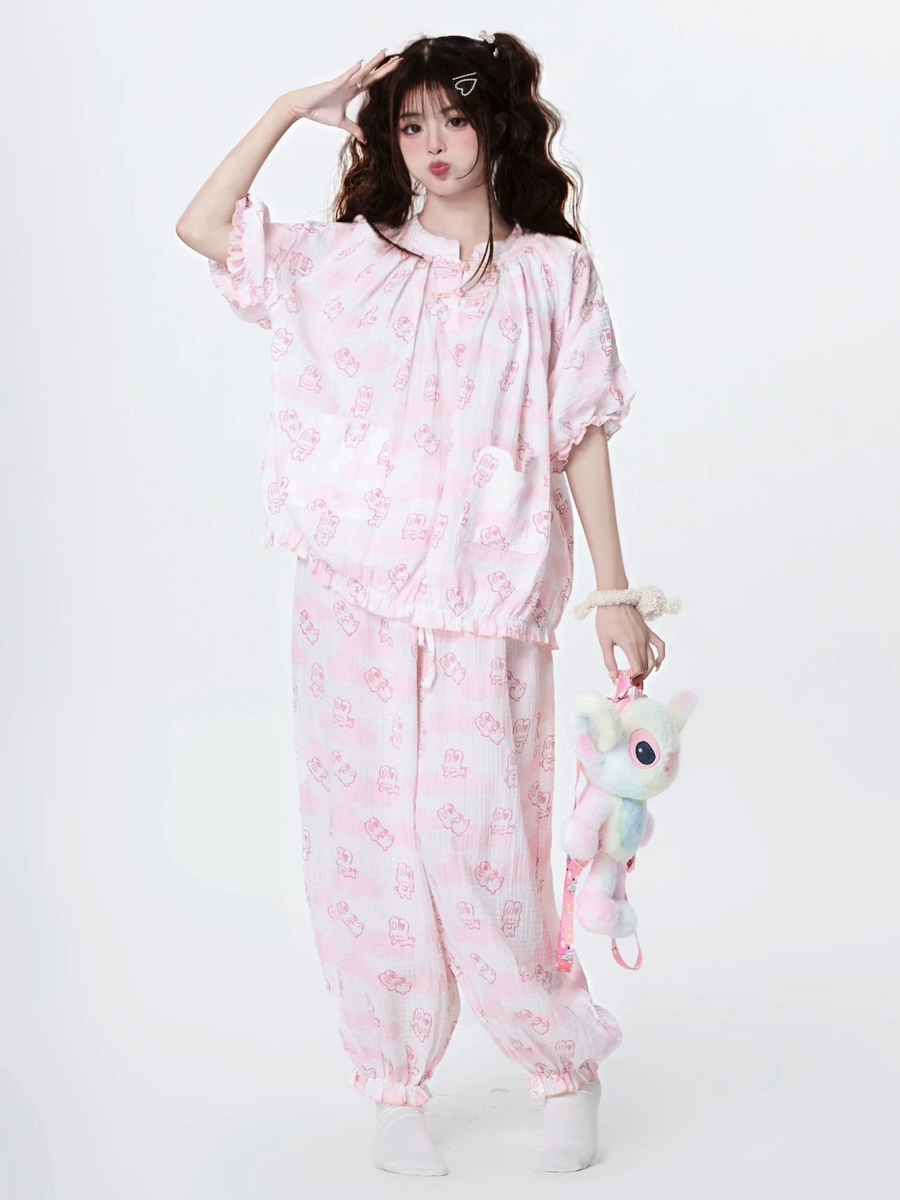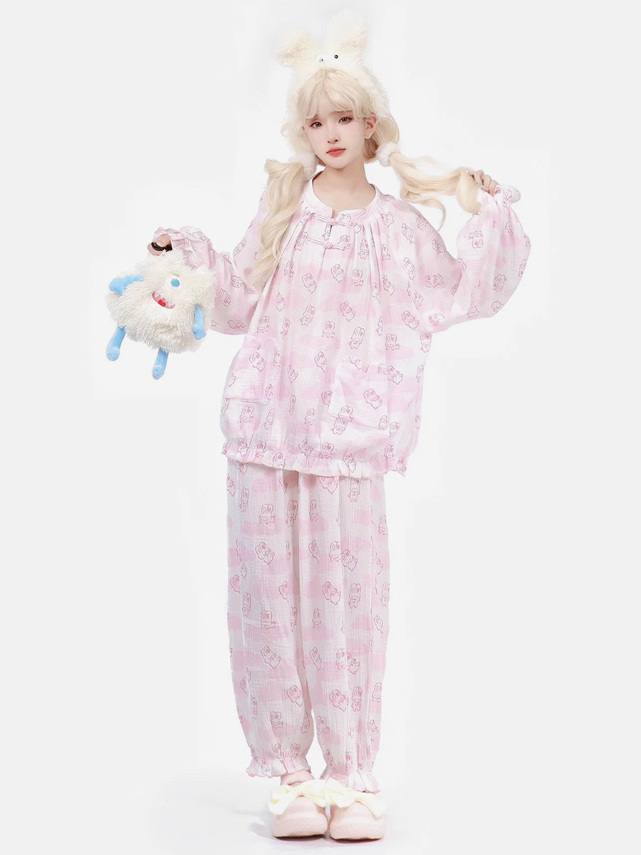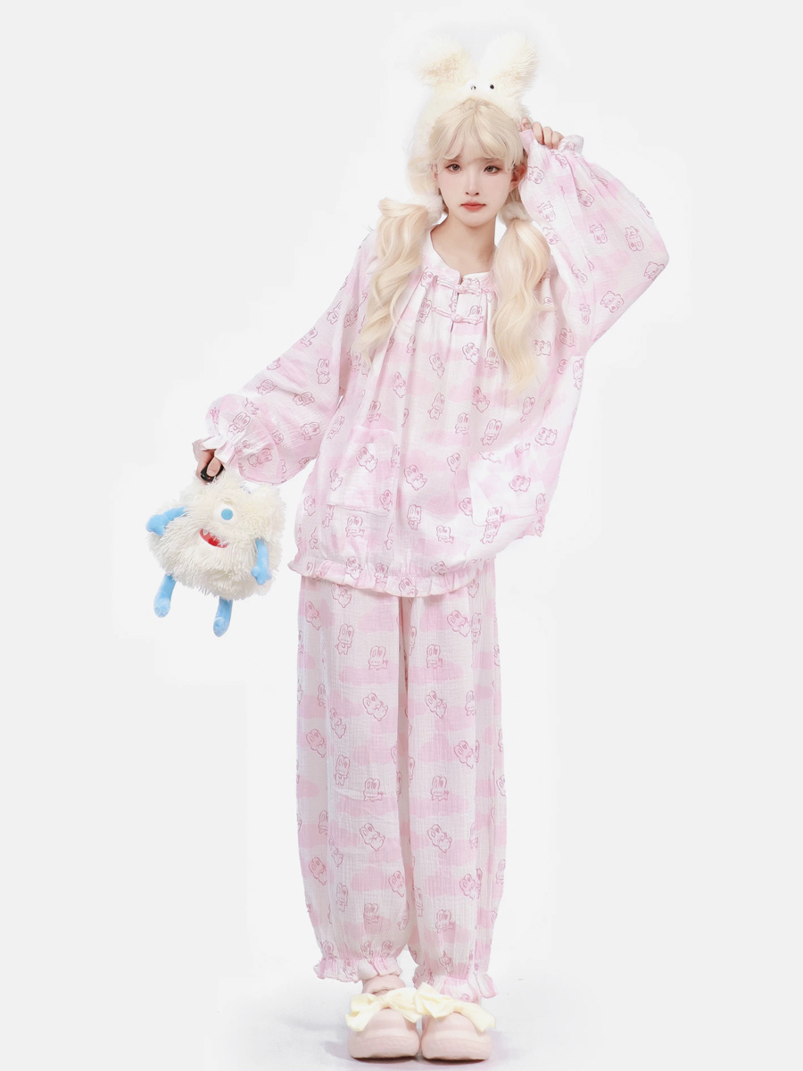 Pijamas Kawaii Ropa de dormir para el hogar Especiales Lolita Rosa Interior Cuello joya Volantes Mangas acampanadas Mangas largas Tops dulces Pantalones Conjuntos