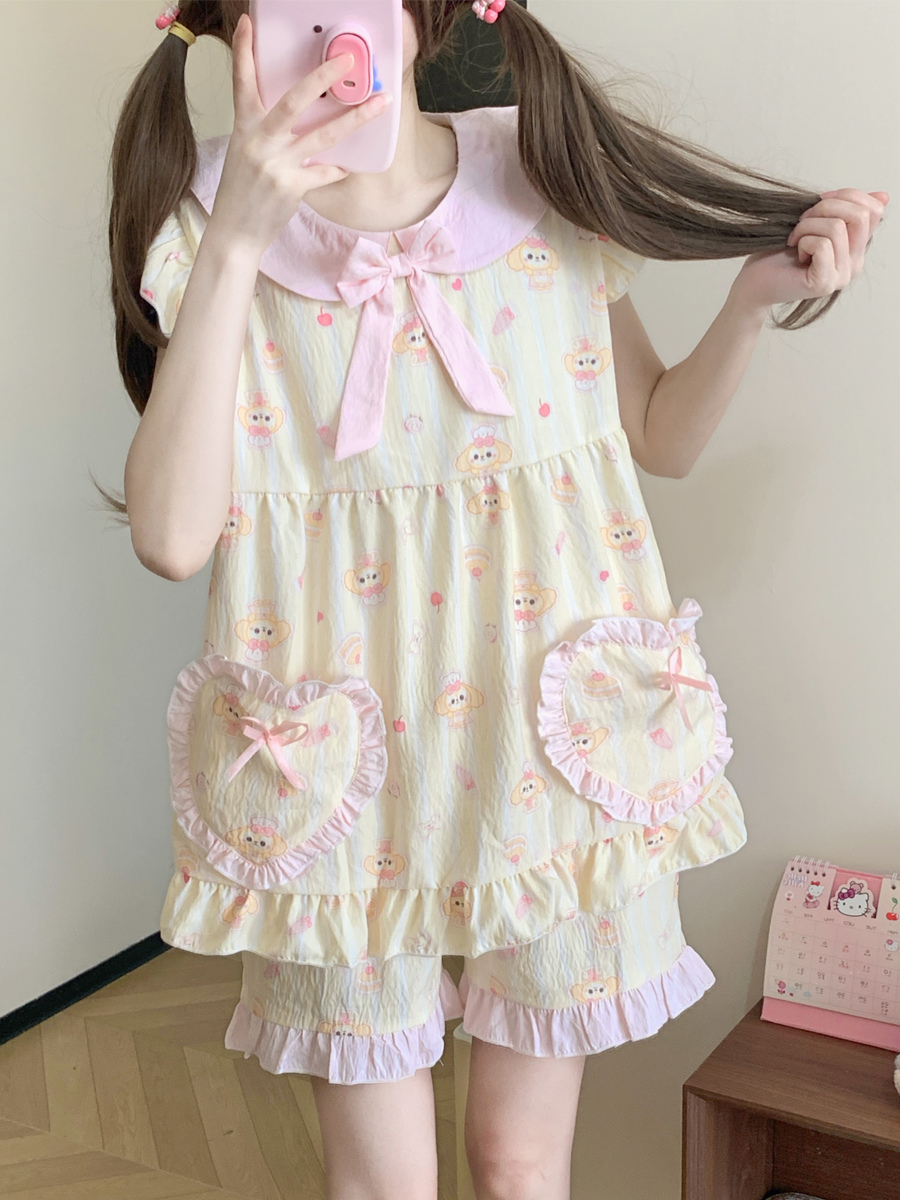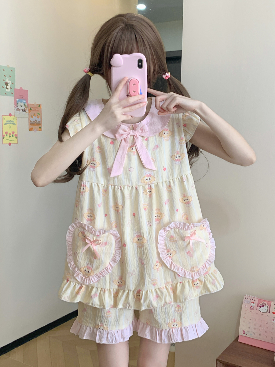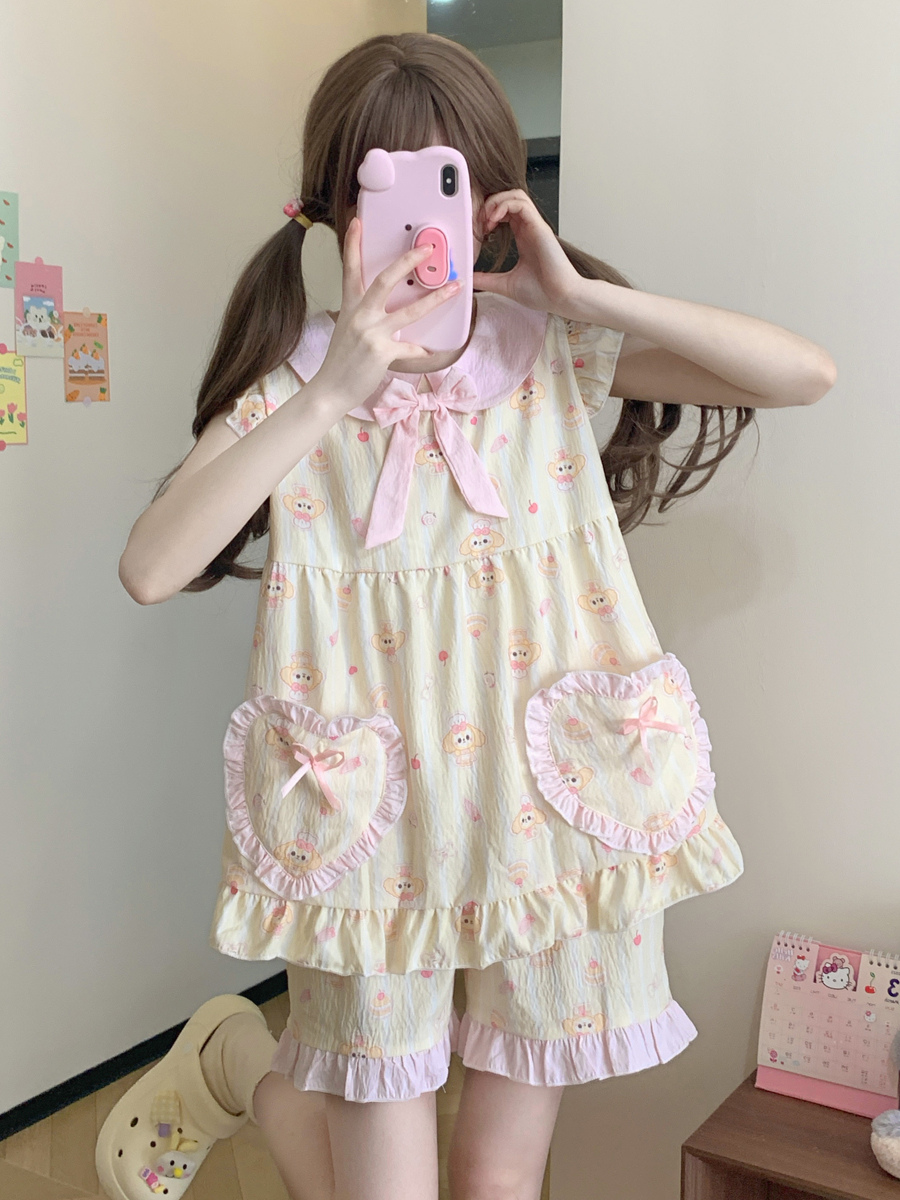 Pijamas Kawaii Sweet HomeWear especiales de Lolita color beige para interior cuello Peter Pan lazos mangas abullonadas tops pantalones conjuntos de pijamas.