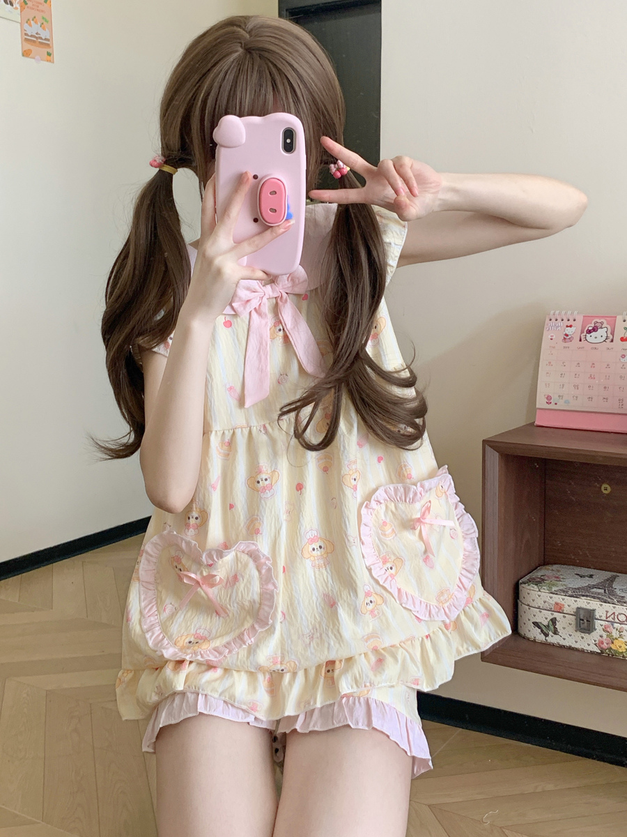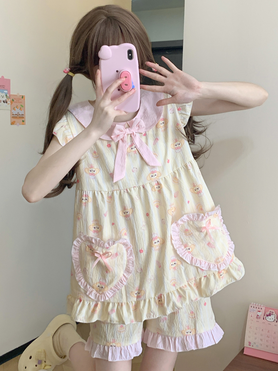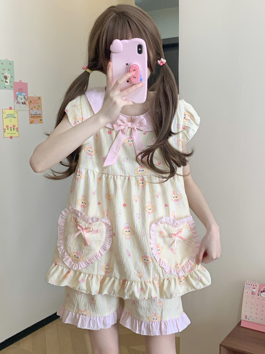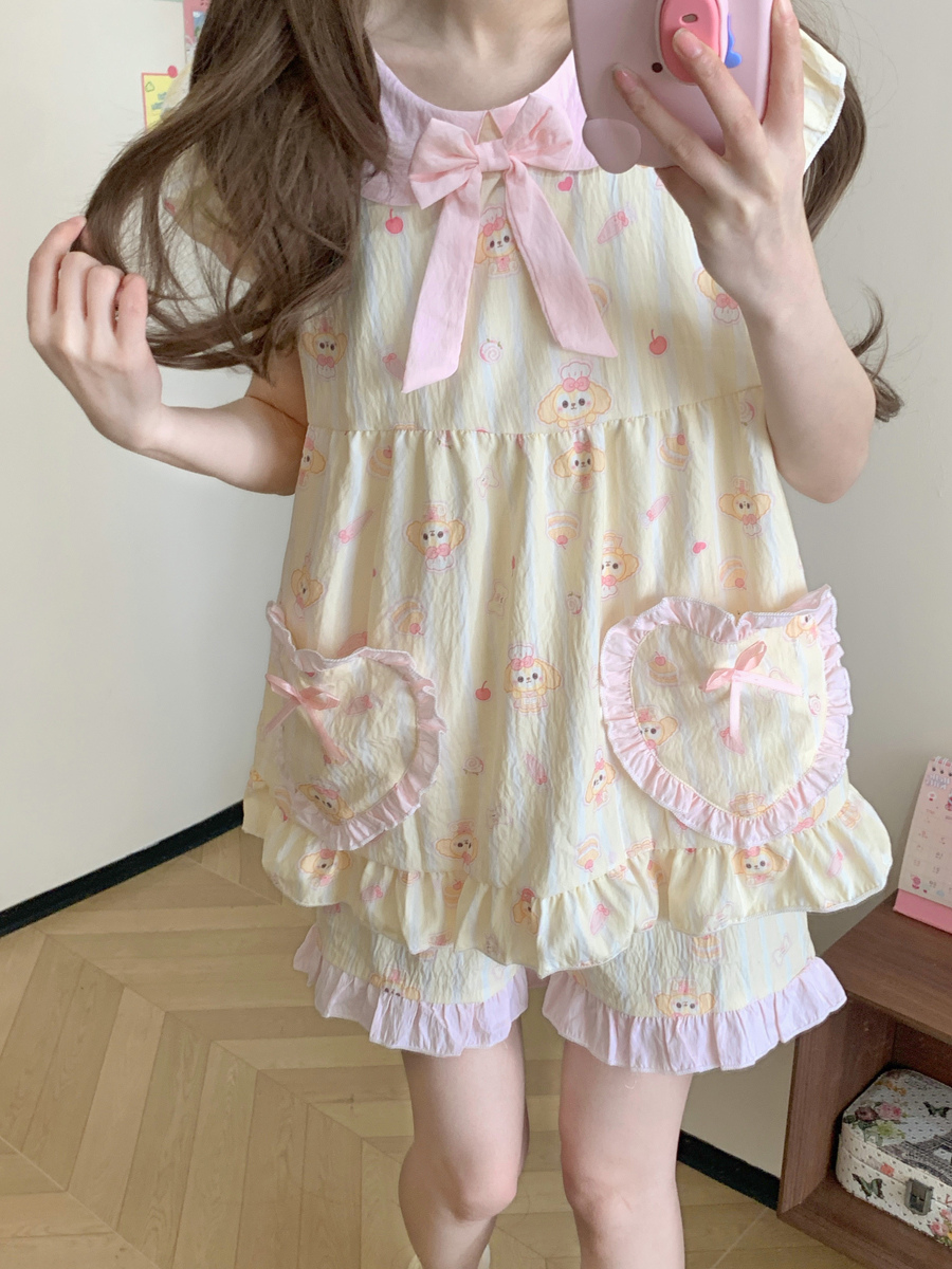 Pijamas Kawaii Sweet HomeWear especiales de Lolita color beige para interior cuello Peter Pan lazos mangas abullonadas tops pantalones conjuntos de pijamas.
