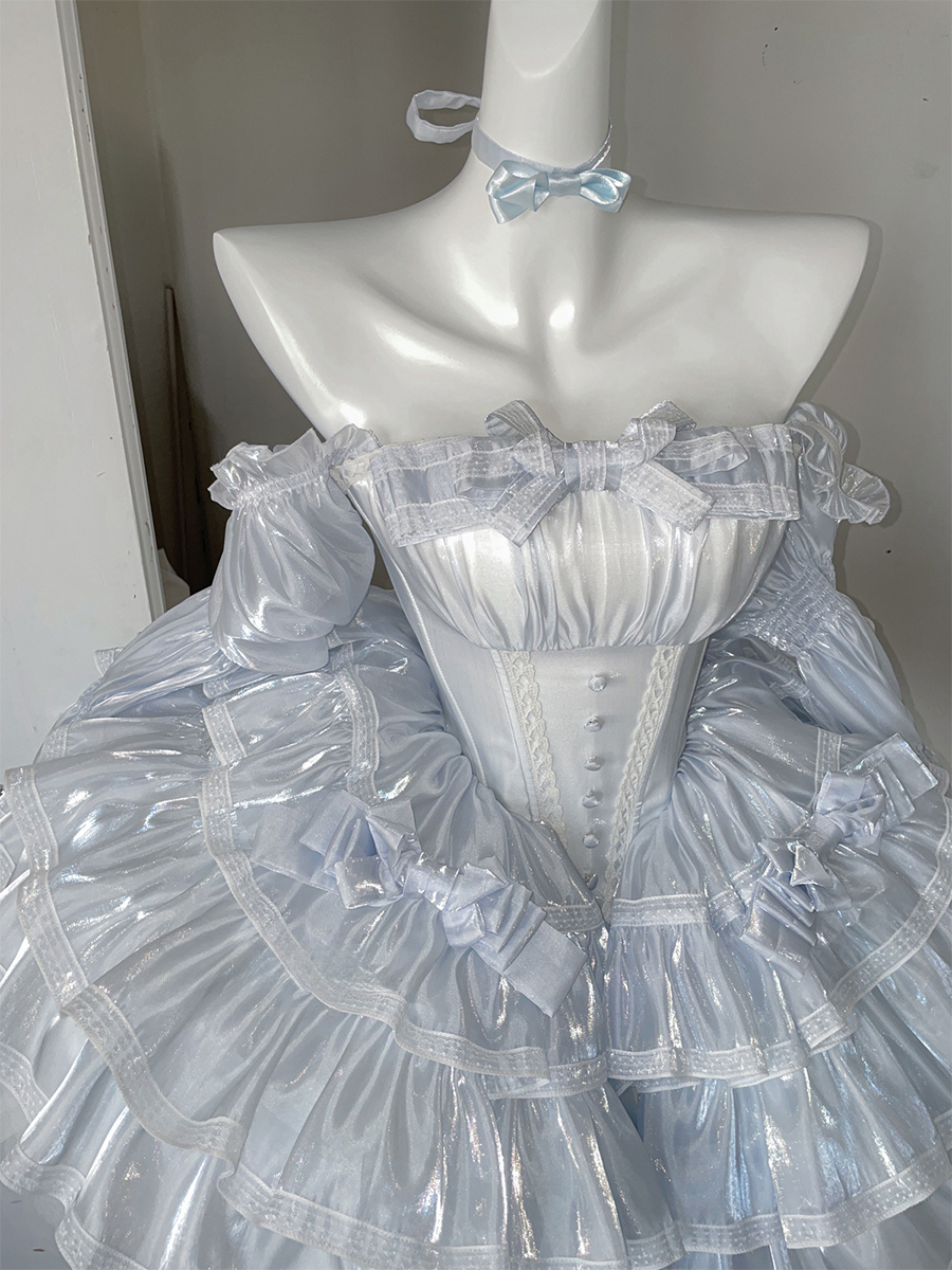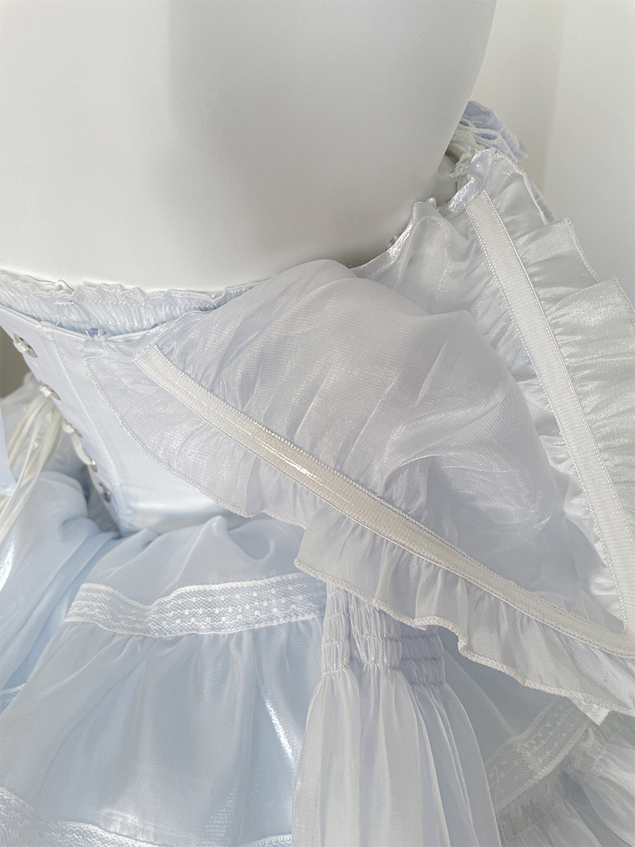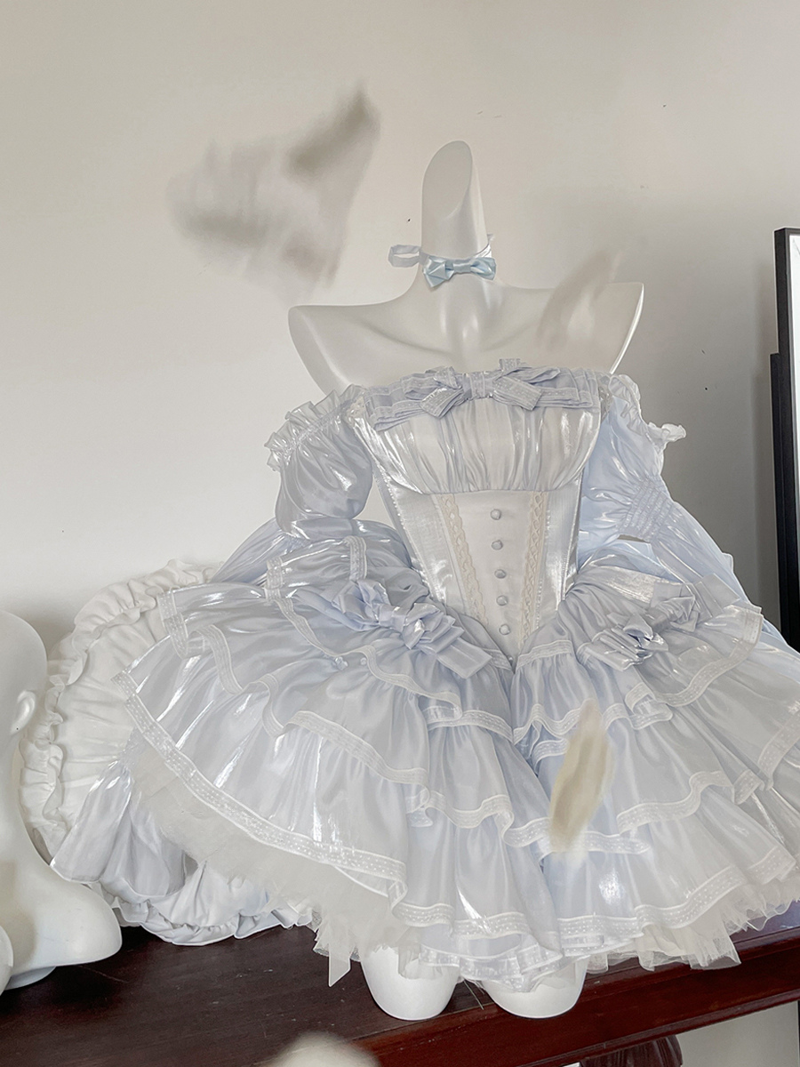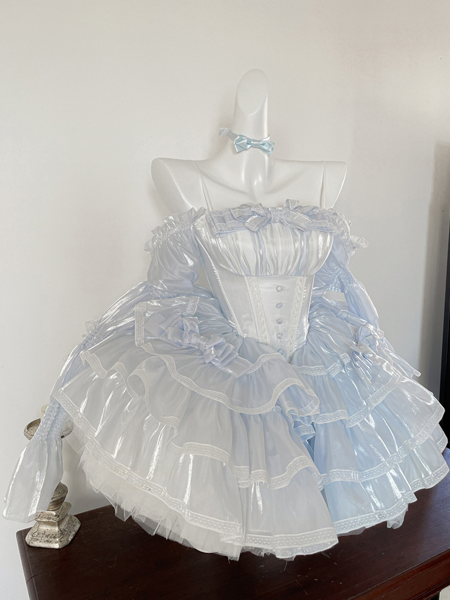 Vestido de Lolita azul con mangas largas y encaje ideal para fiestas de té de poliéster y con cordones.
