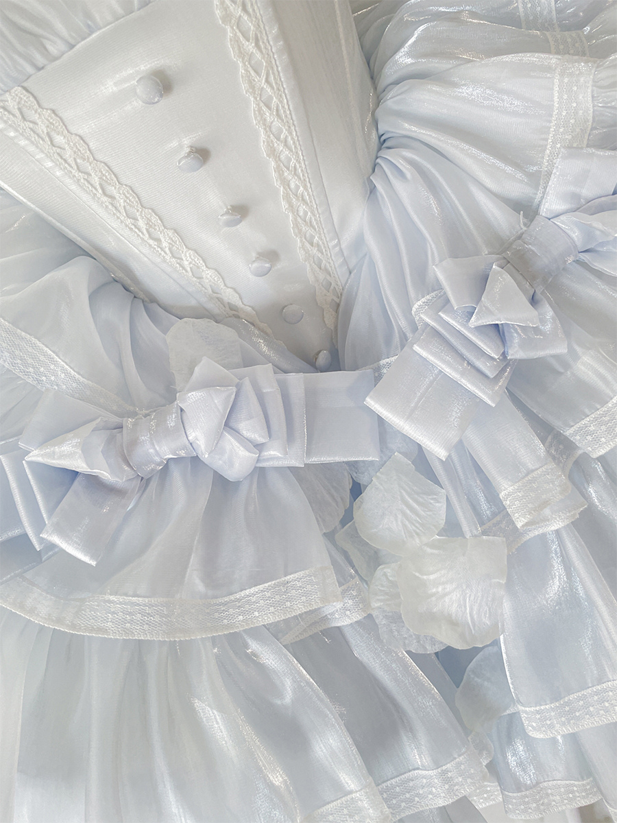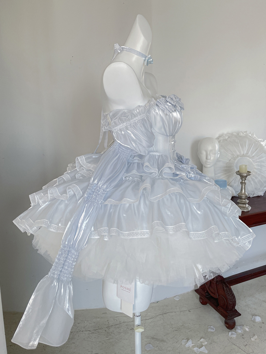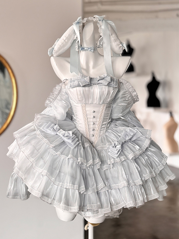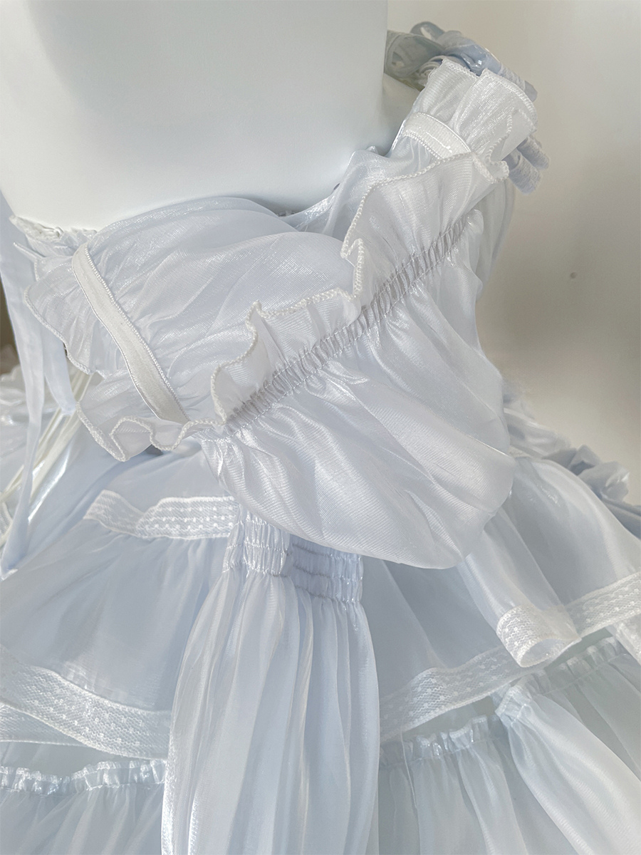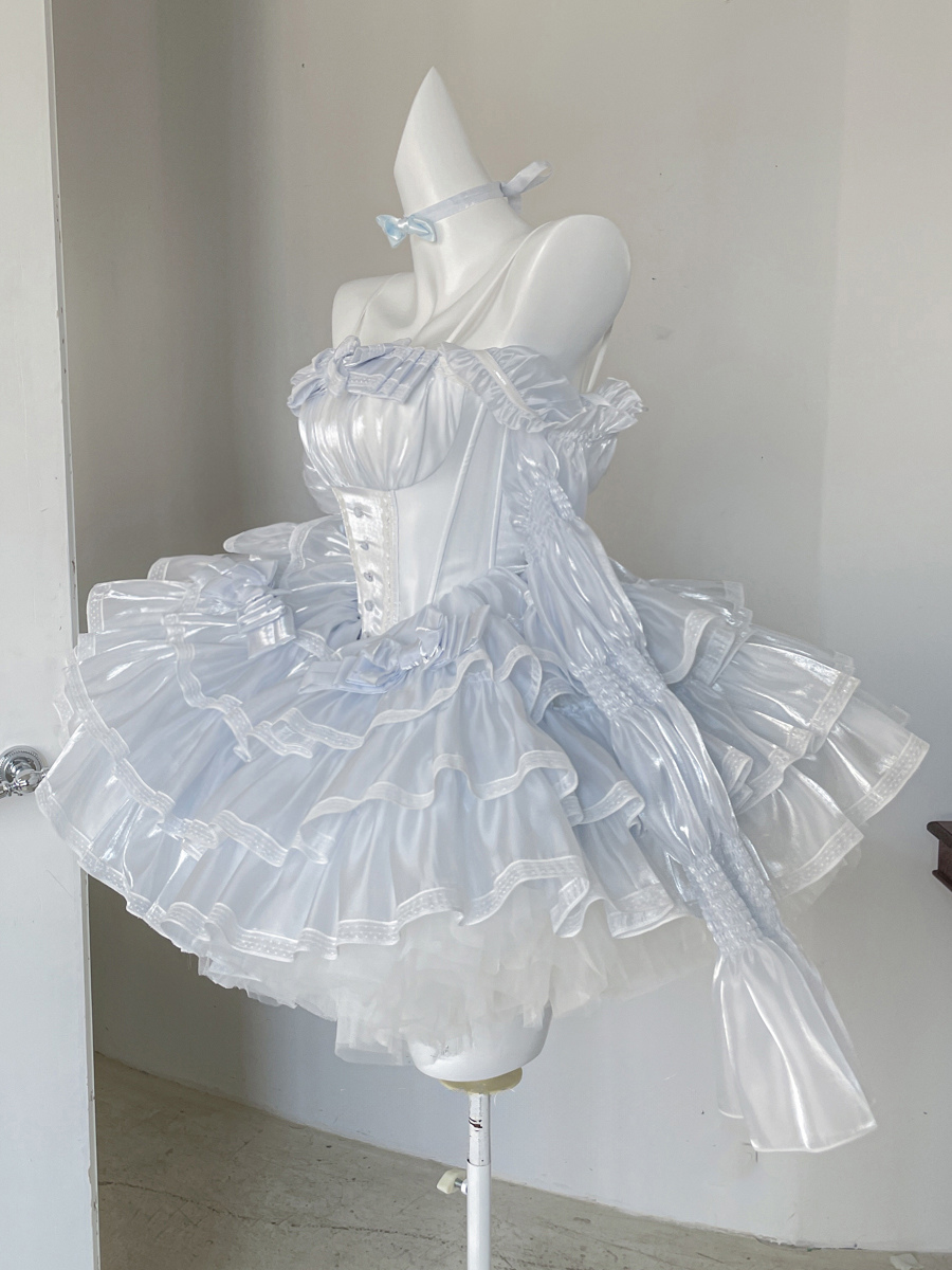 Vestido de Lolita azul con mangas largas y encaje ideal para fiestas de té de poliéster y con cordones.