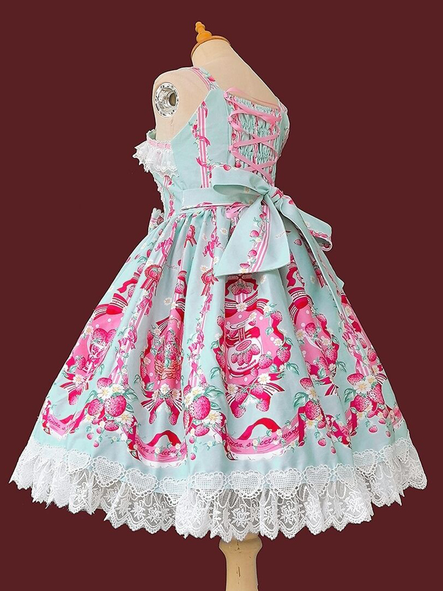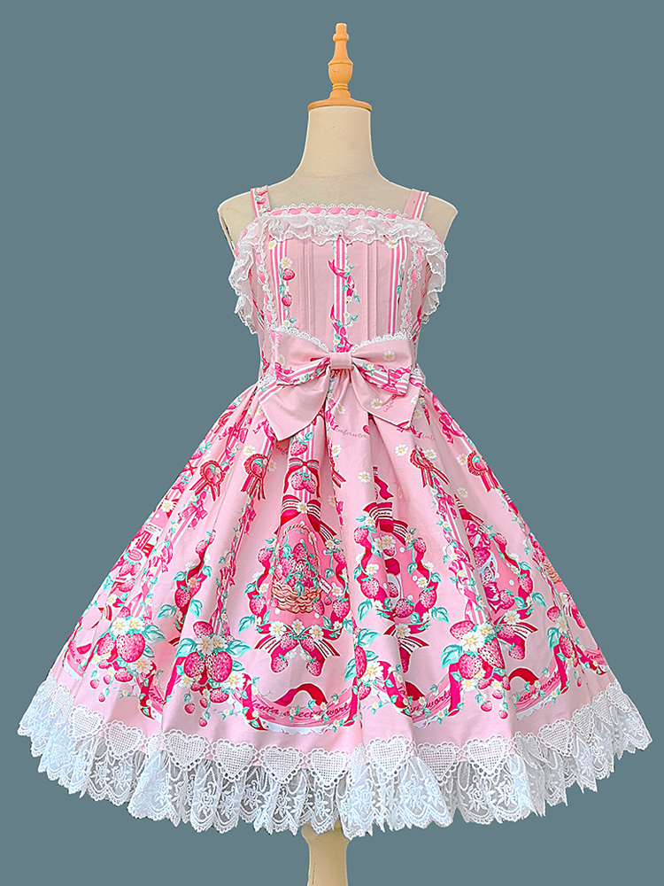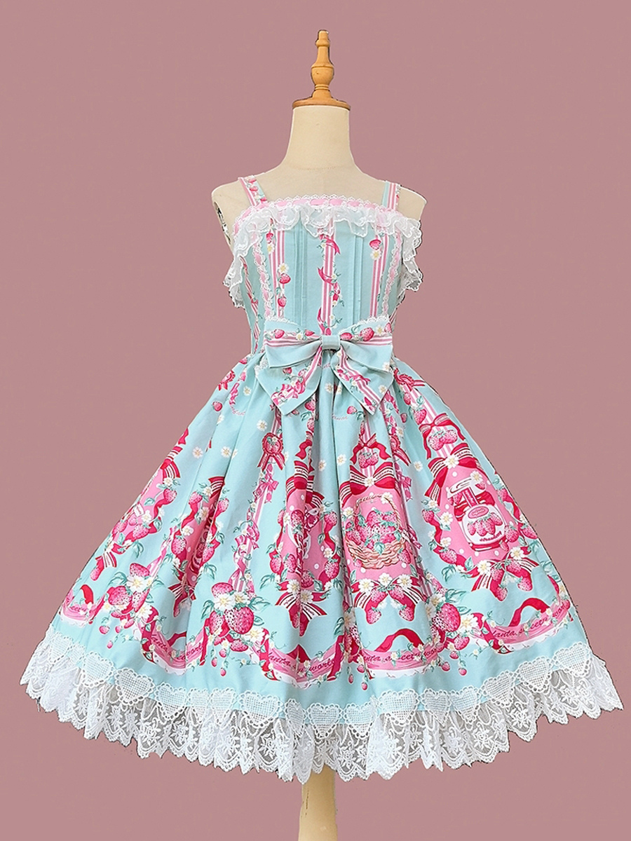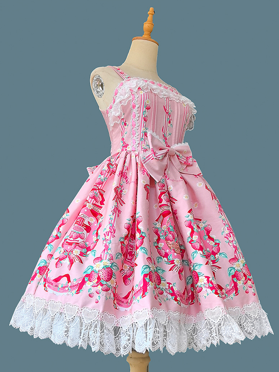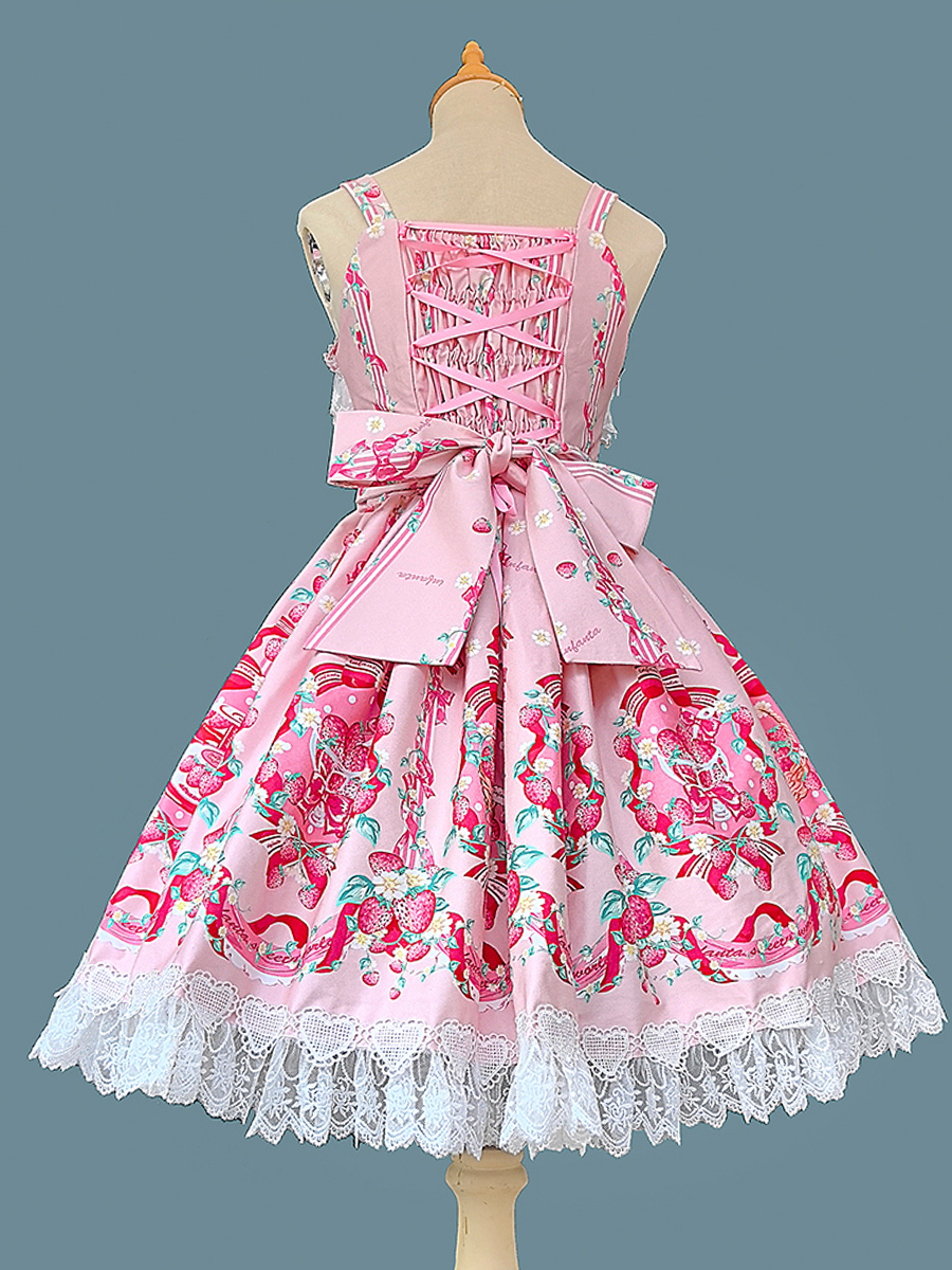 Vestido dulce lolita con estampado de fresas sin mangas de encaje y lazo
