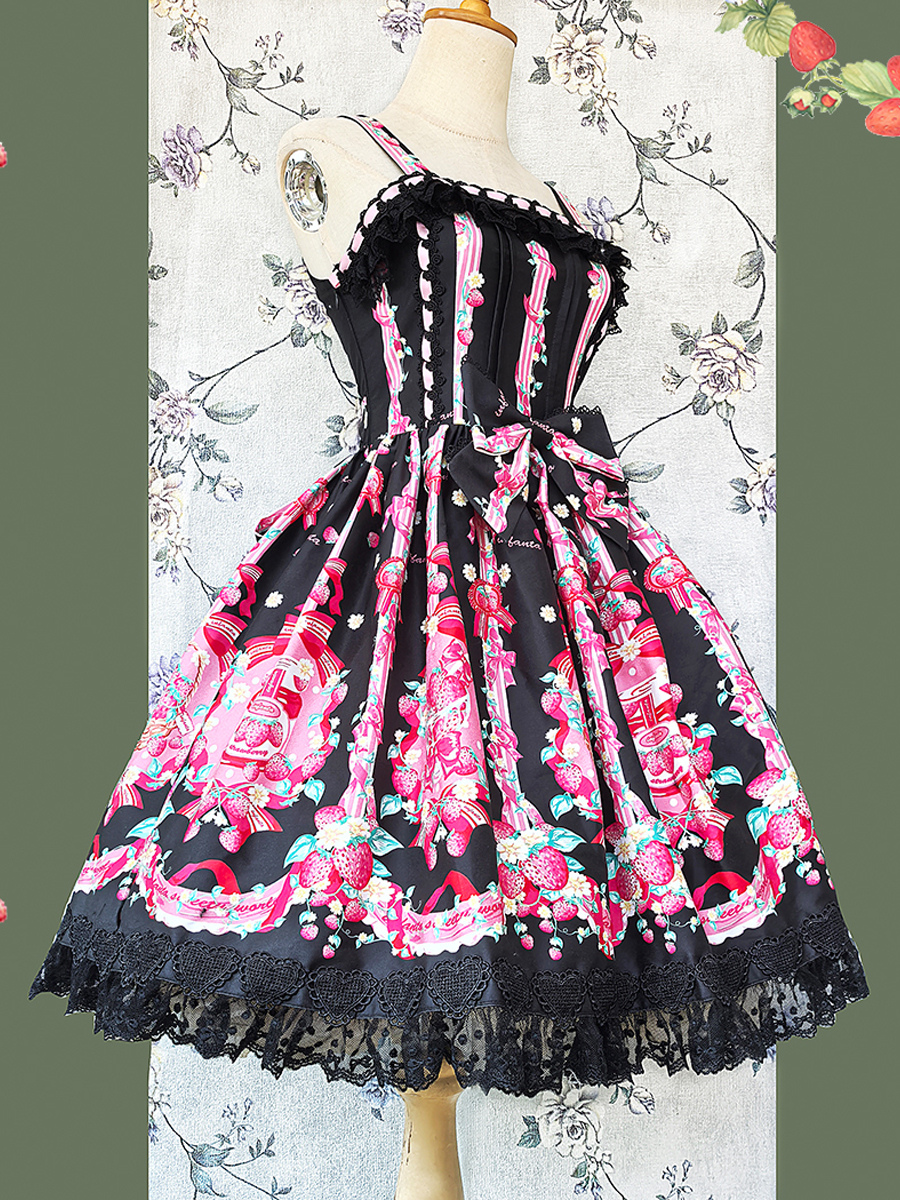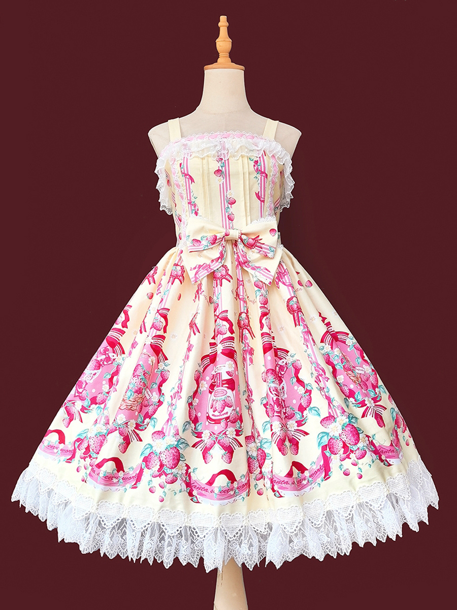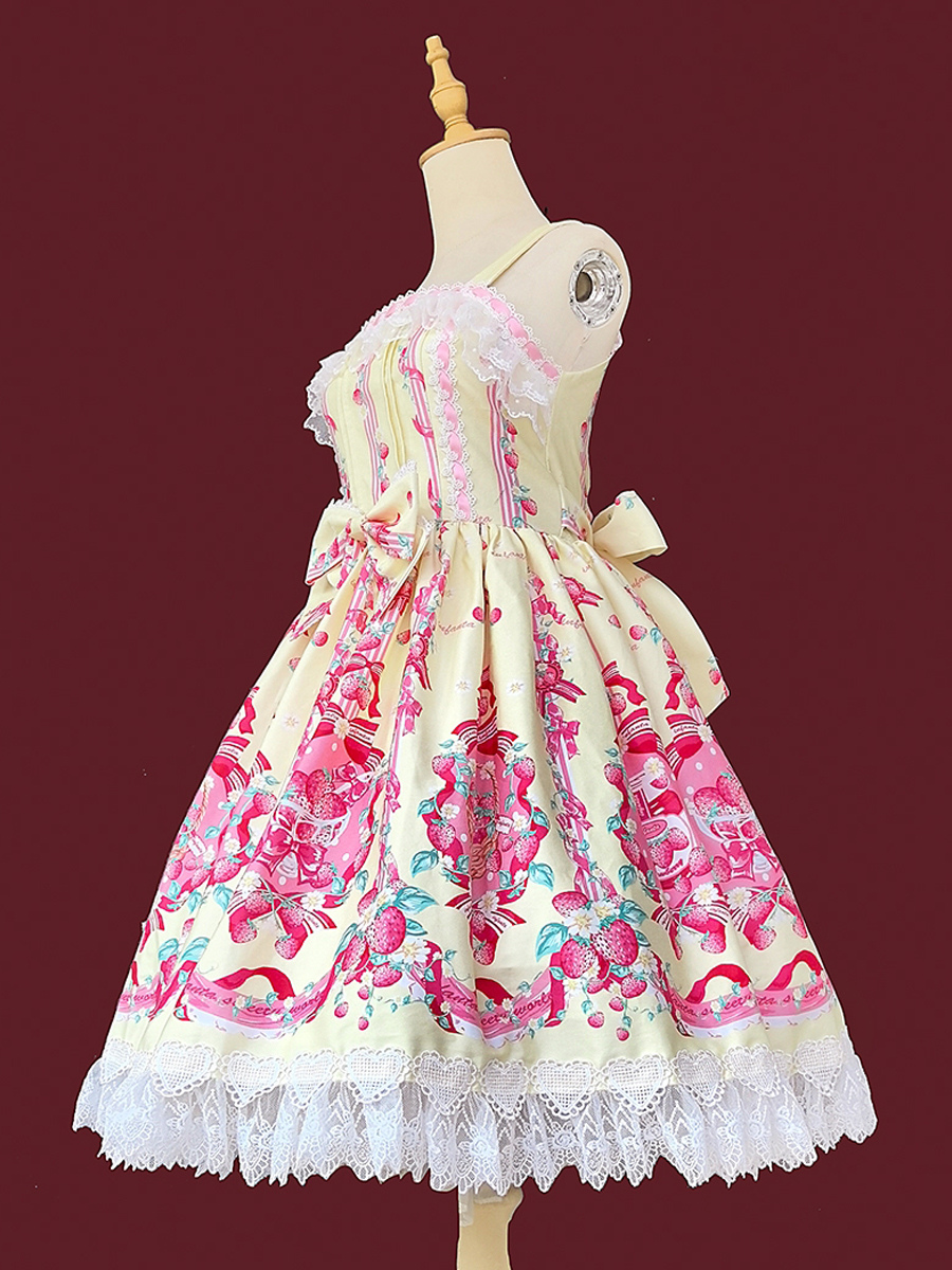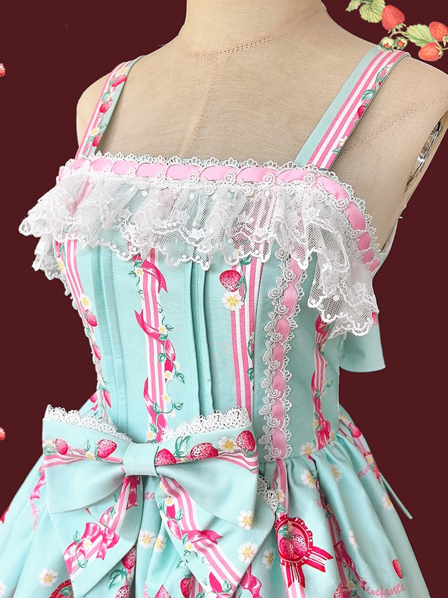 Vestido dulce lolita con estampado de fresas sin mangas de encaje y lazo