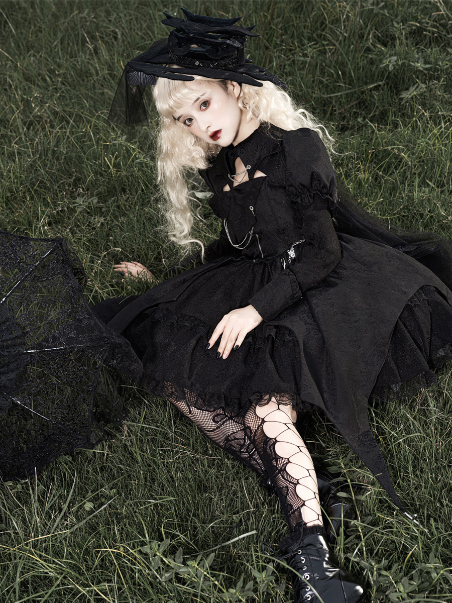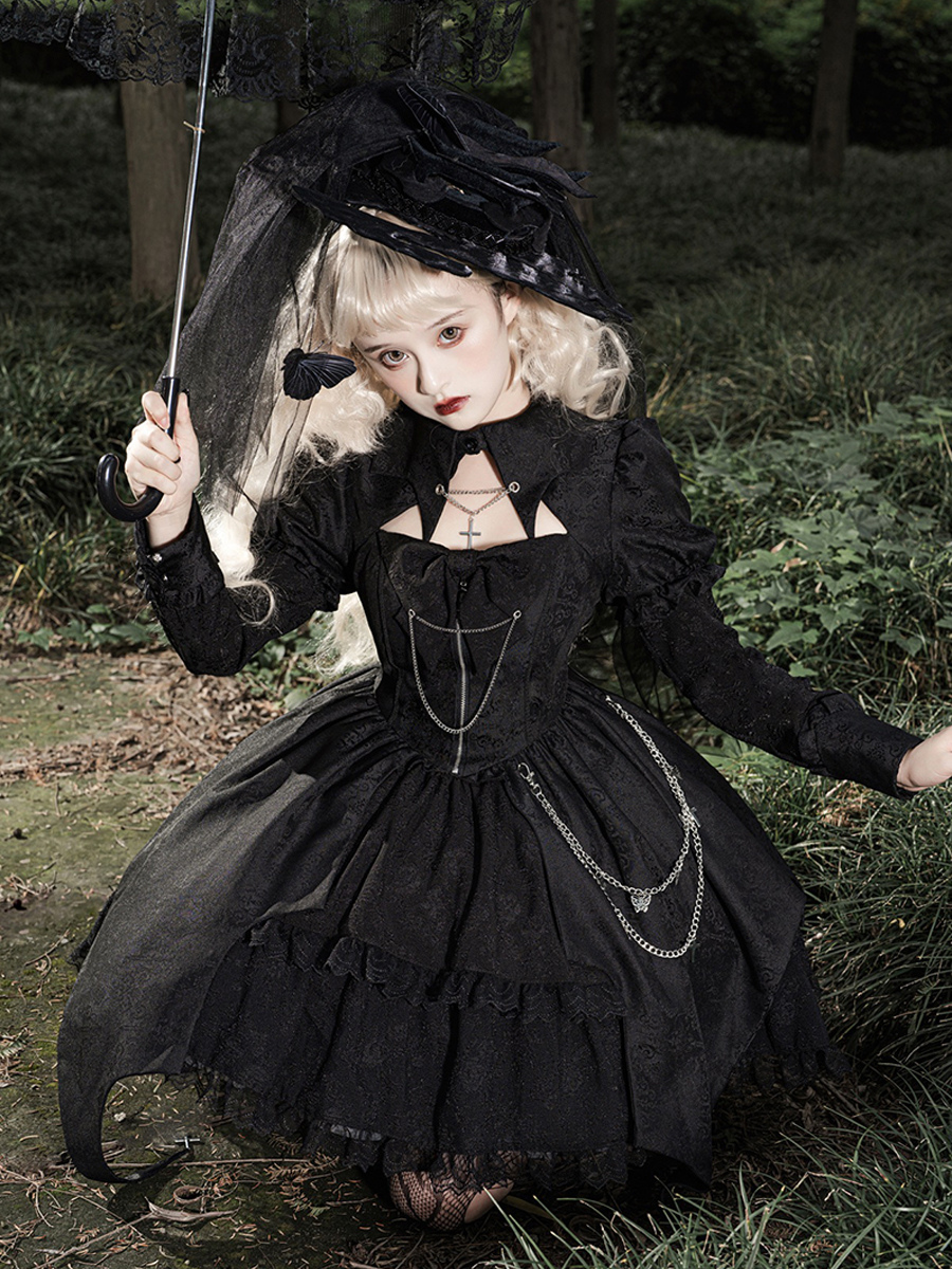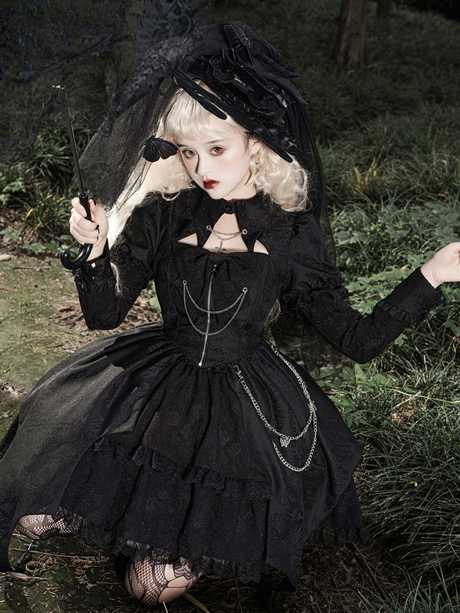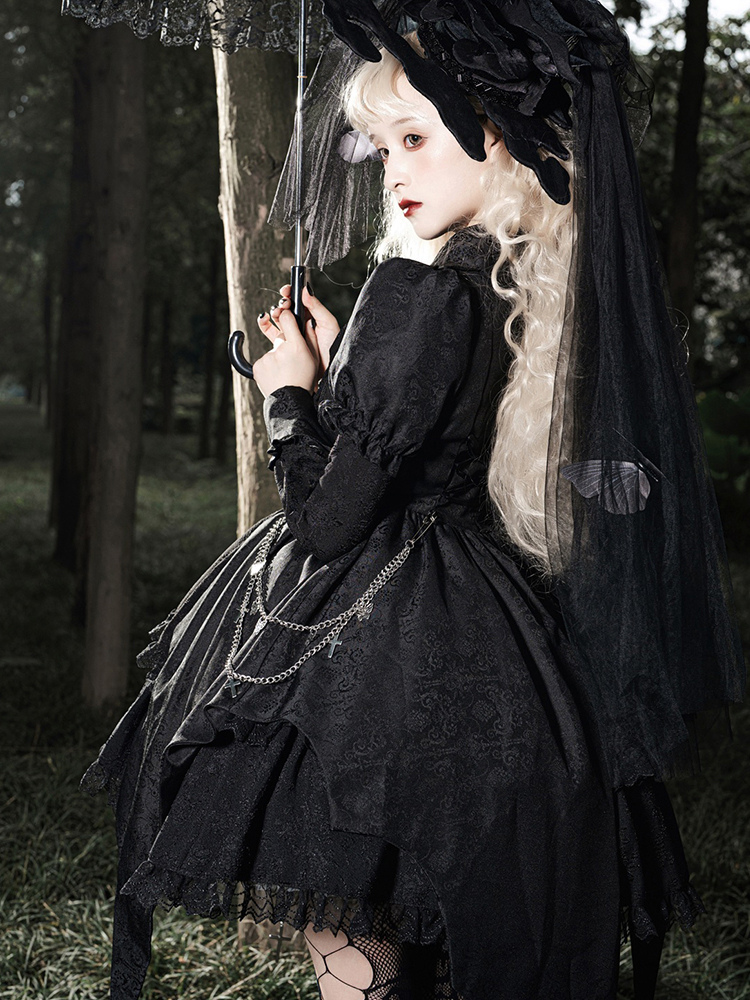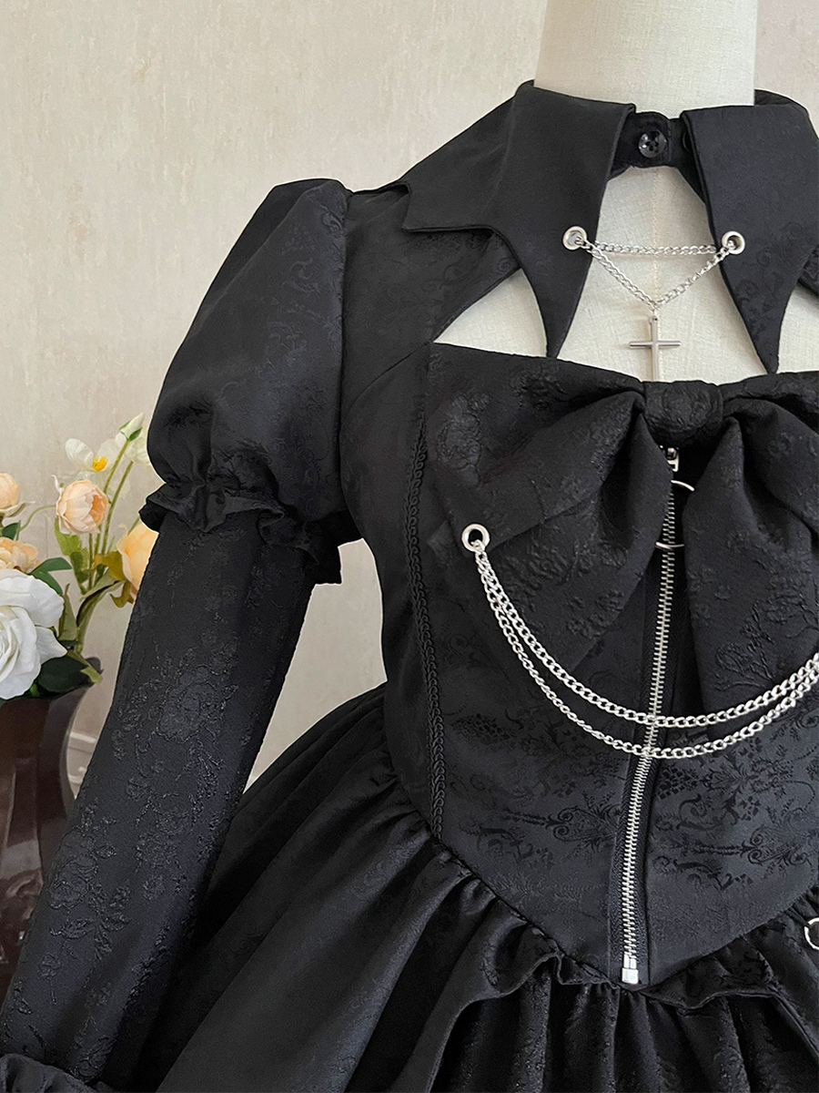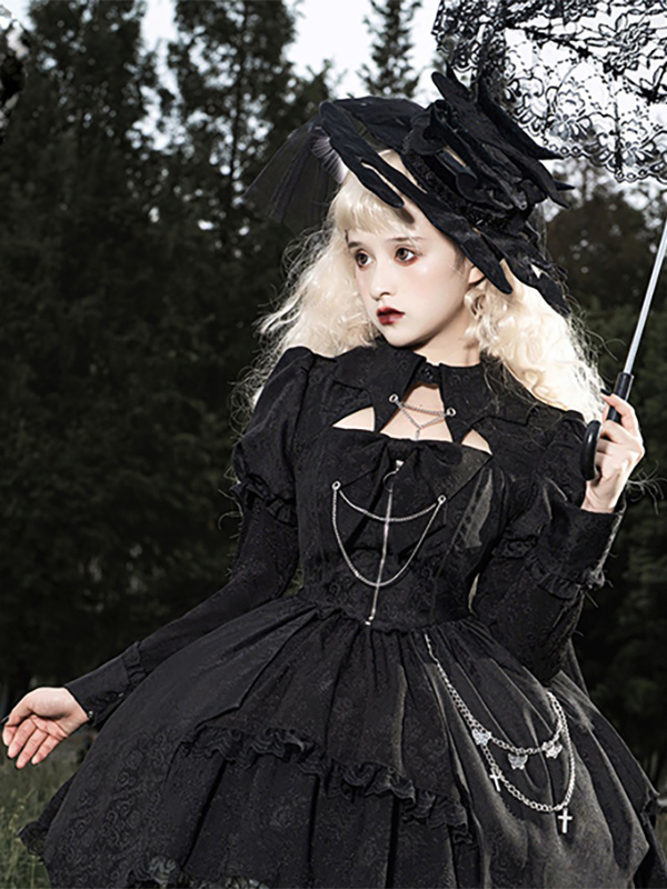 Vestidos góticos de lolita con cadenas y volantes vestidos negros de manga larga