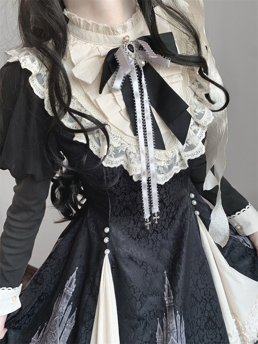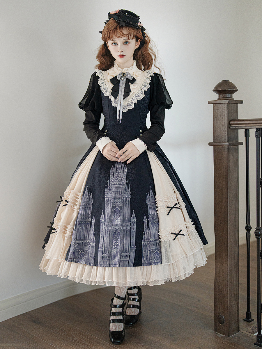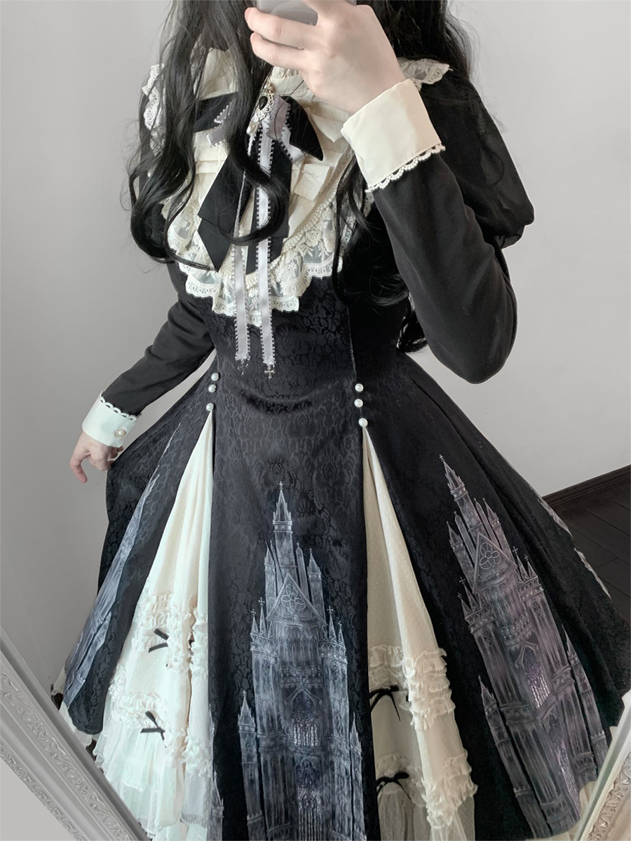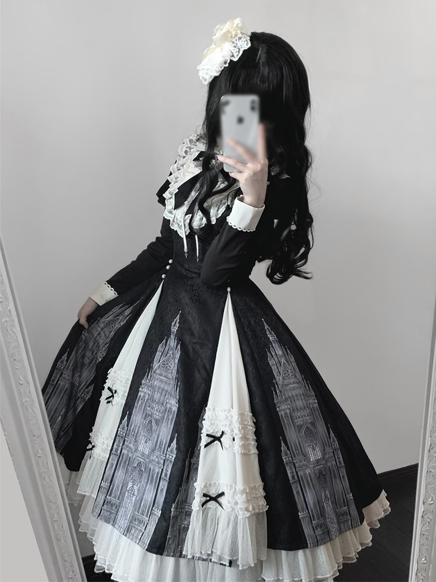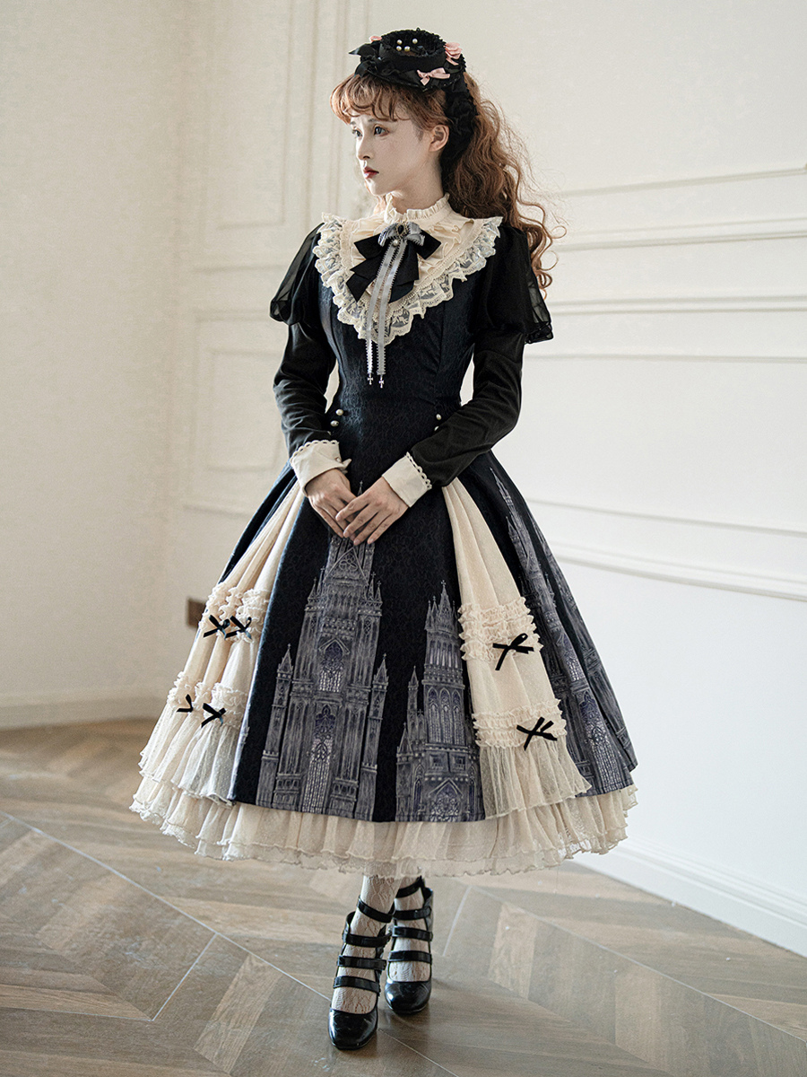 Vestidos góticos de lolita con volantes lazos encaje manga larga jacquard negros