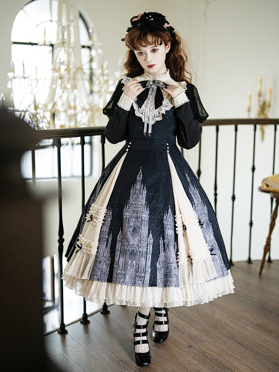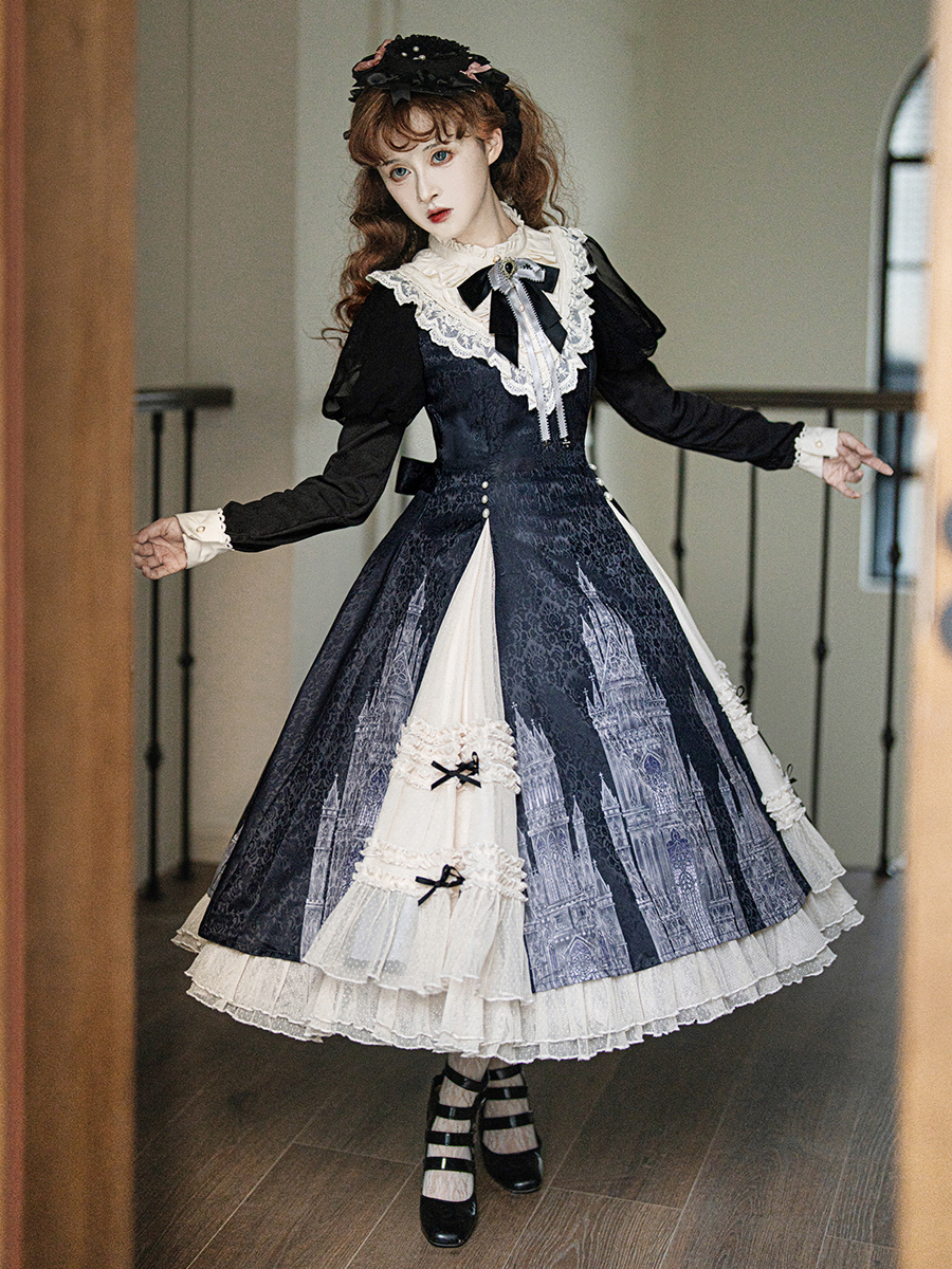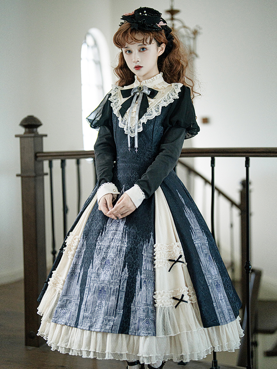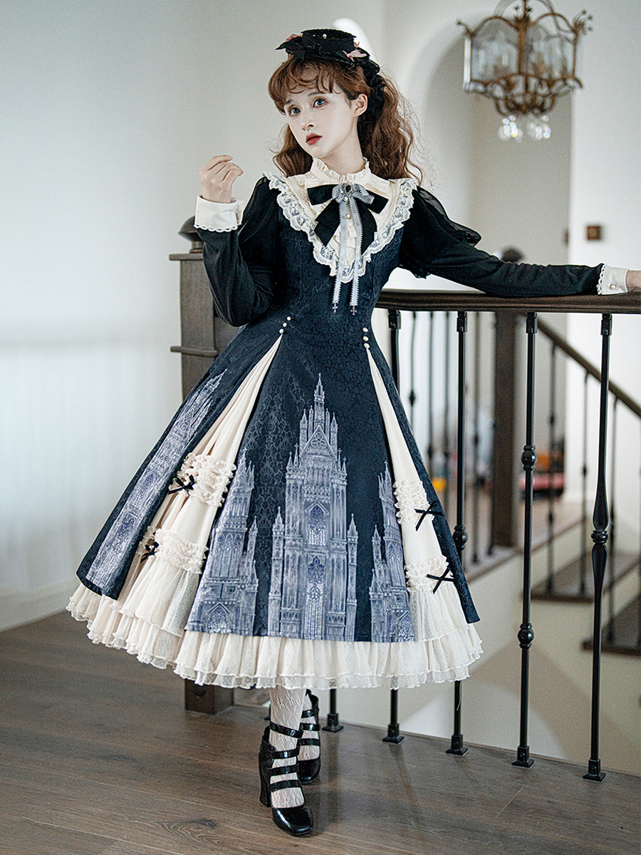 Vestidos góticos de lolita con volantes lazos encaje manga larga jacquard negros