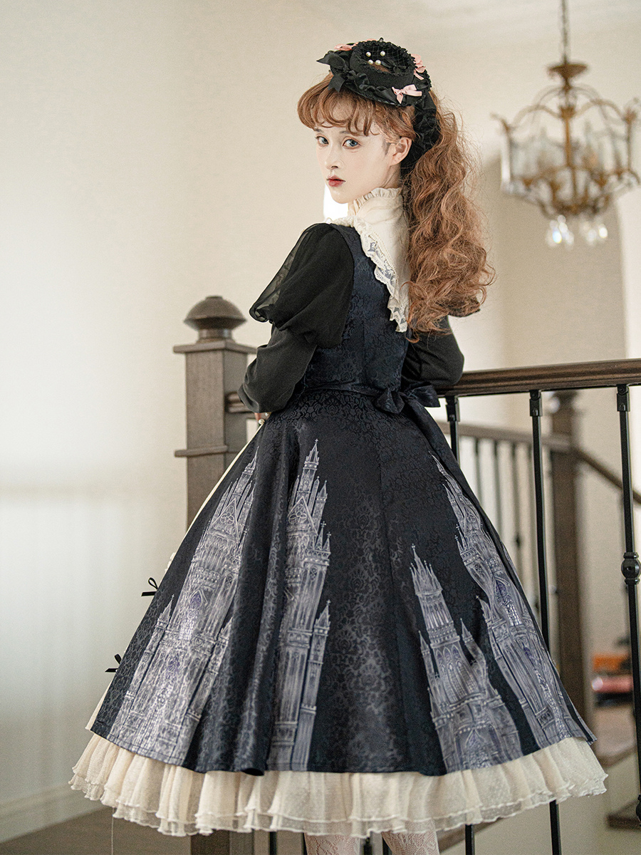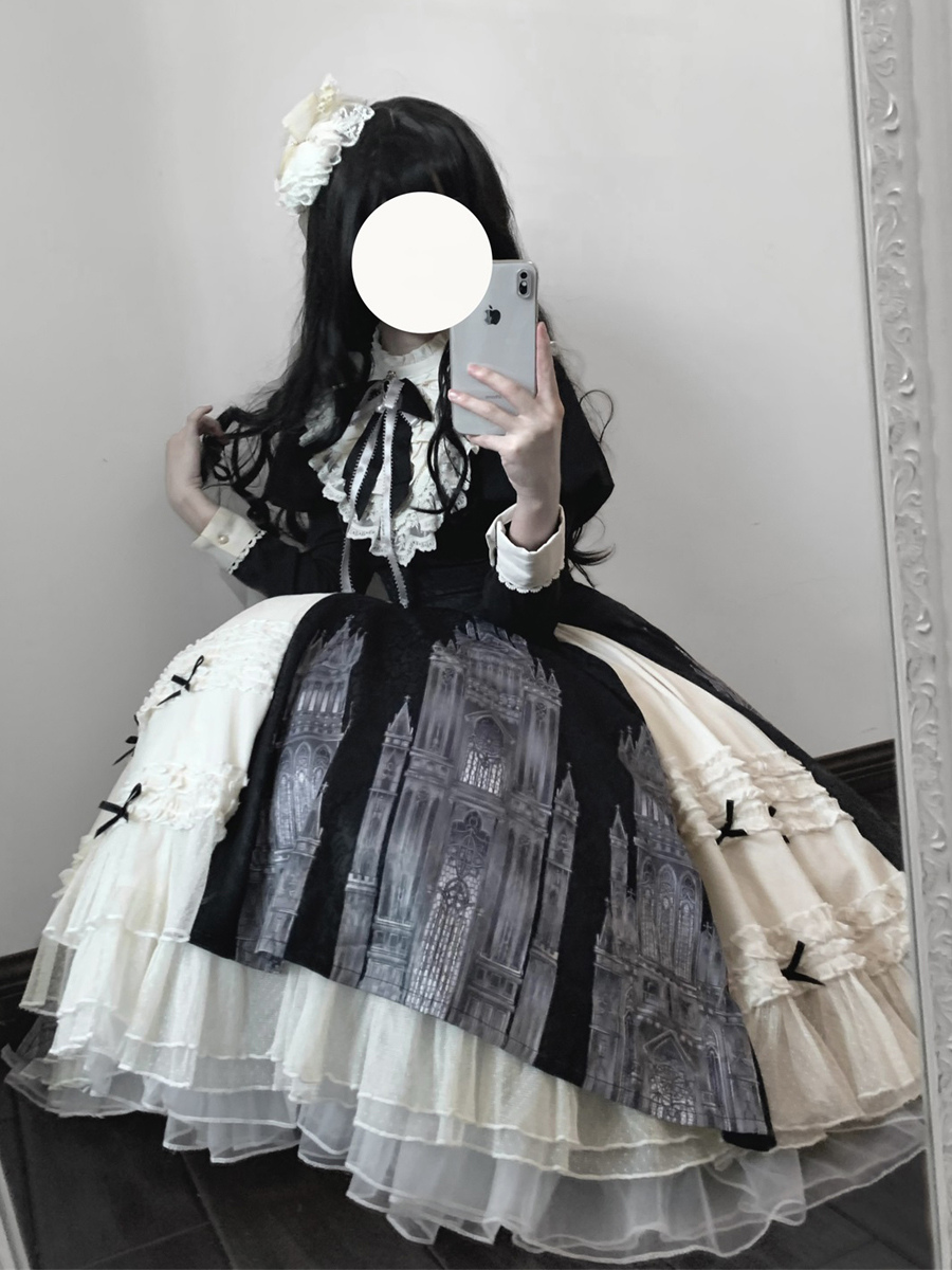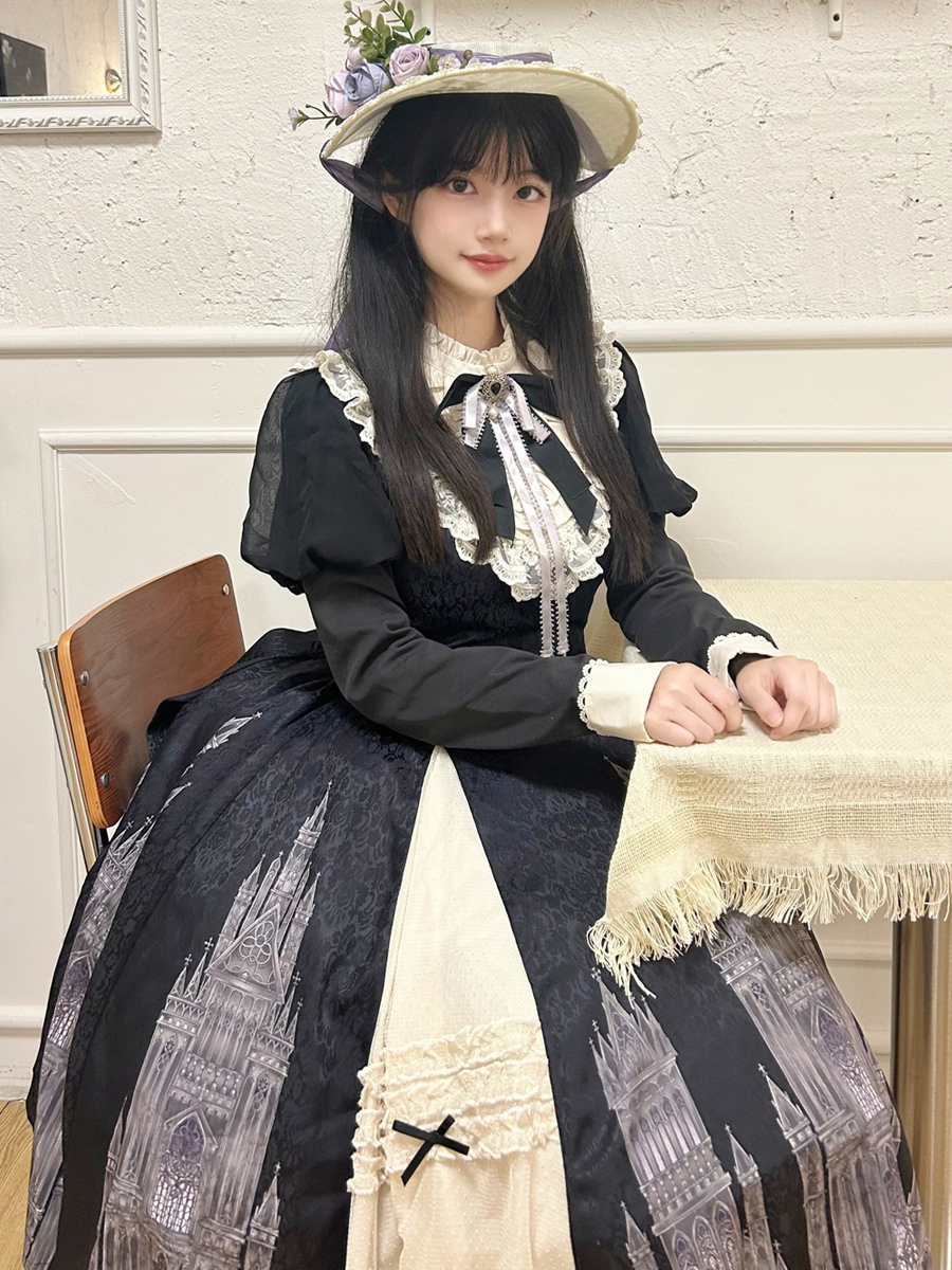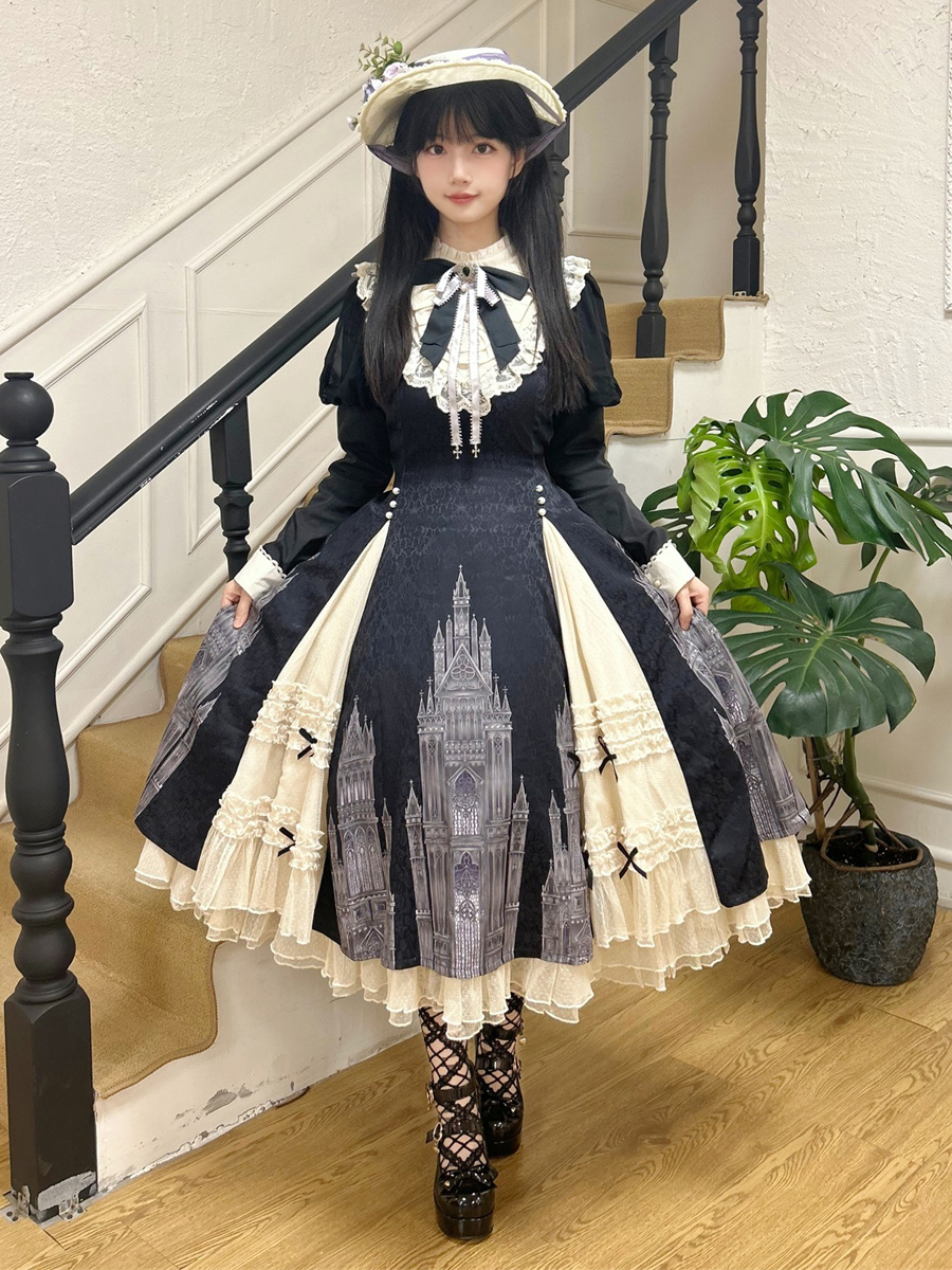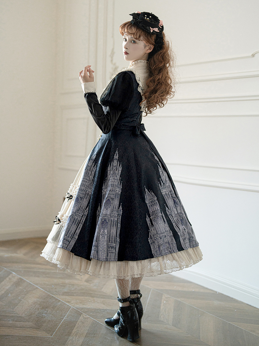 Vestidos góticos de lolita con volantes lazos encaje manga larga jacquard negros