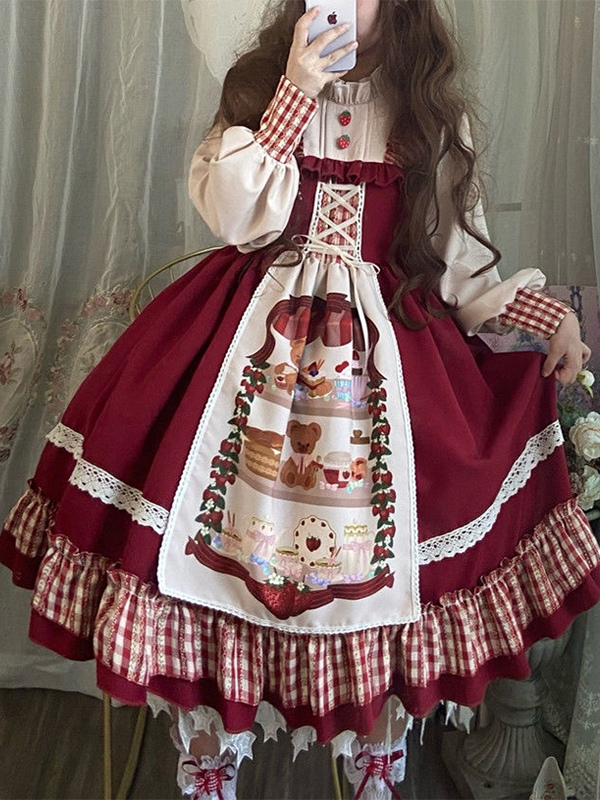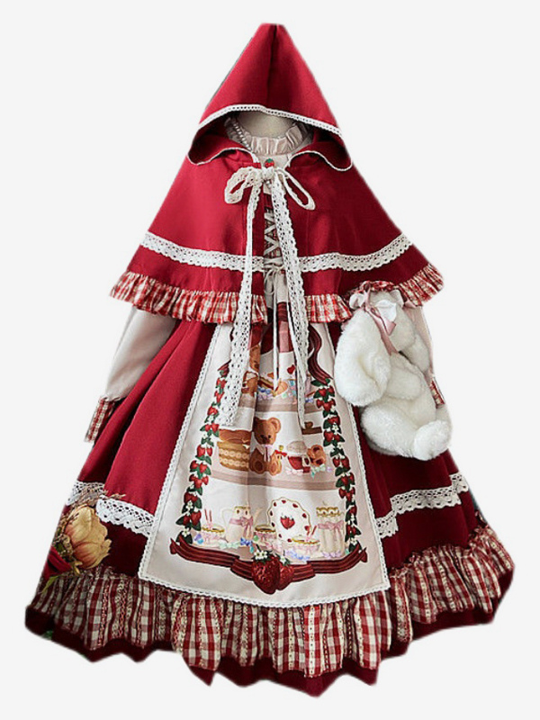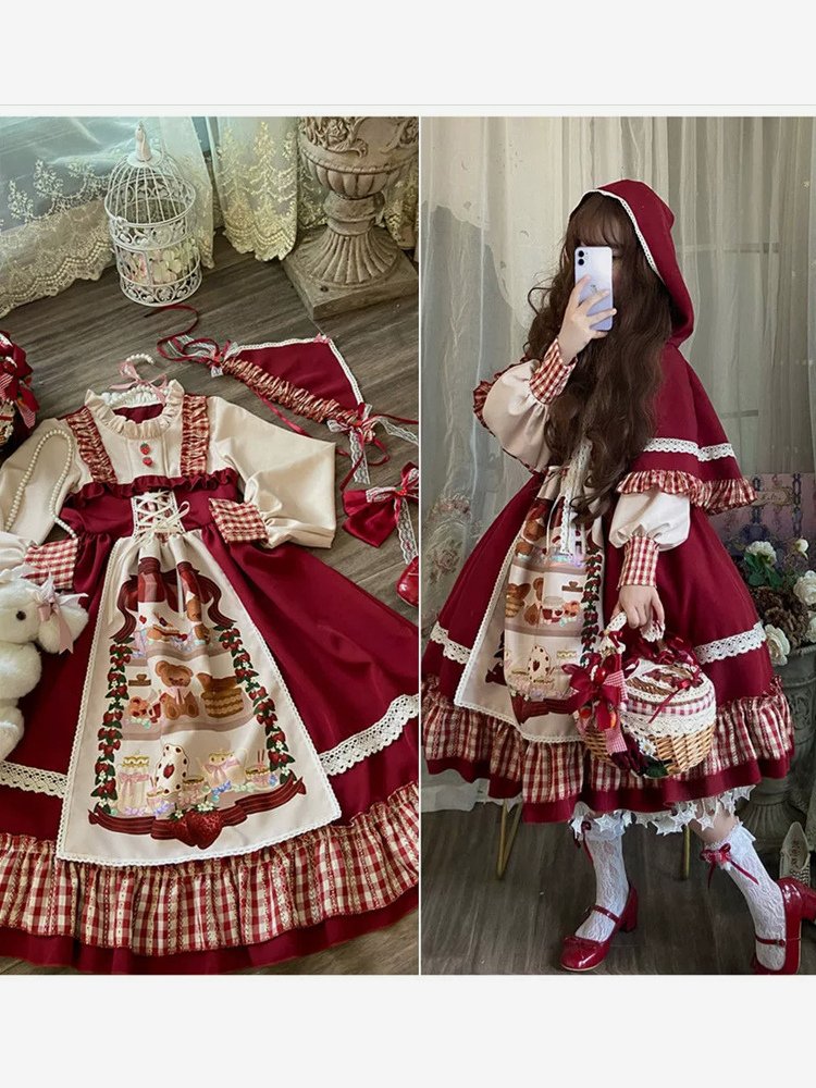 Vestidos Lolita navideños de manga larga con cordones y tocados con volantes y cuadros rojos. Conjuntos de capa.