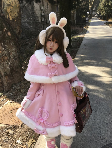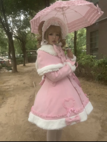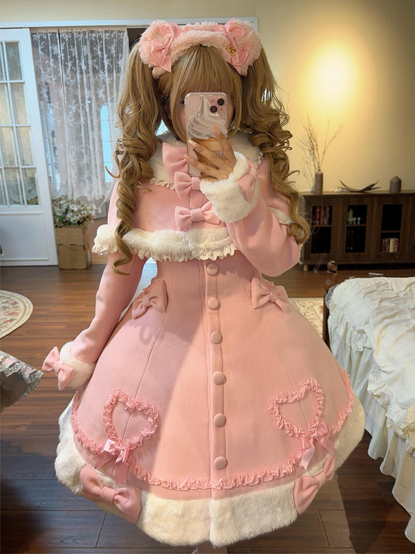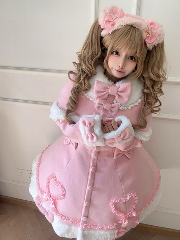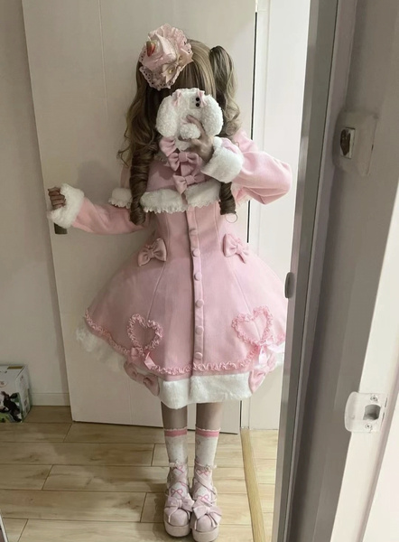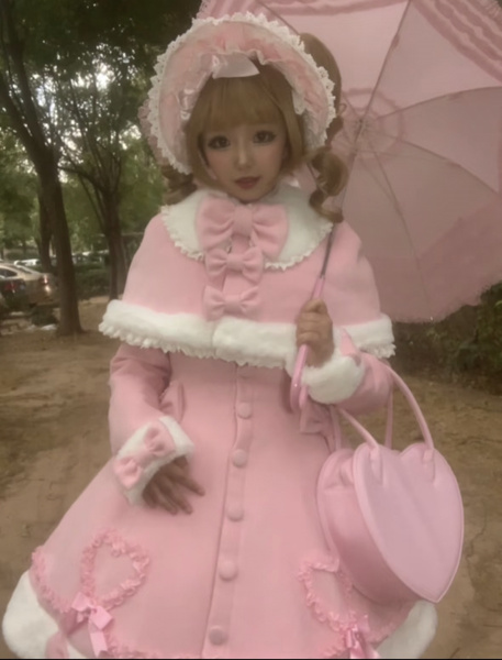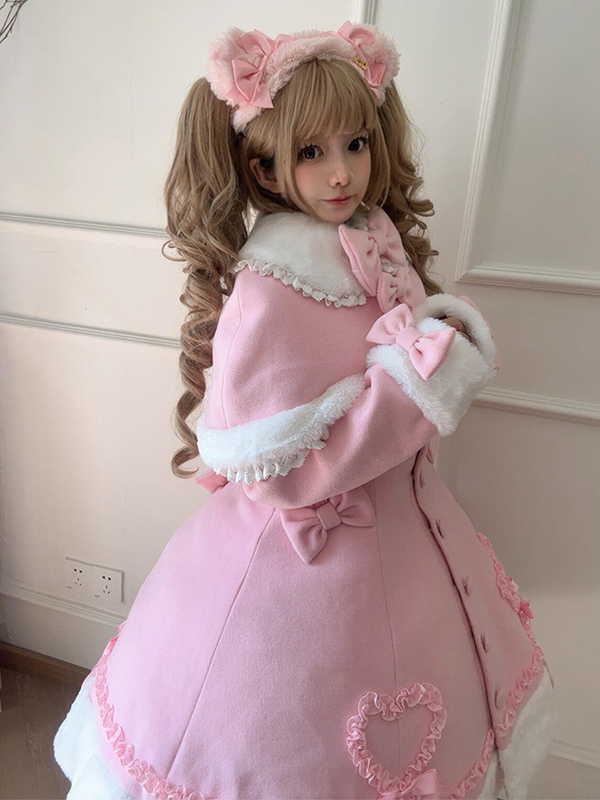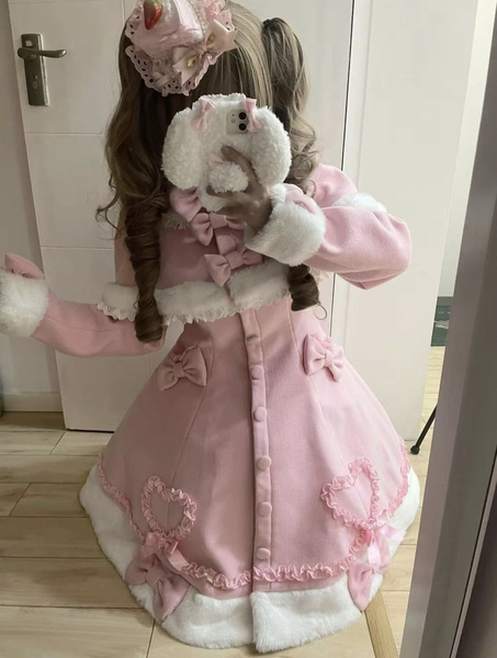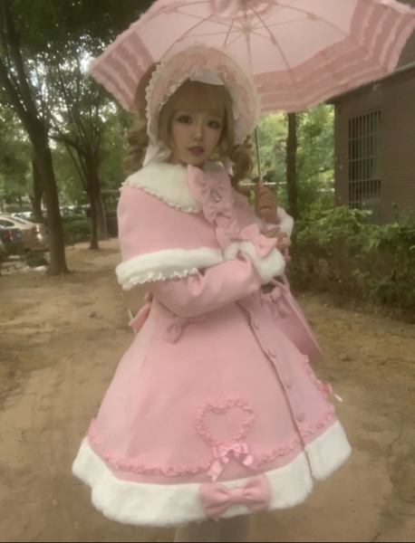 Manteau Lolita Sweet Rose Charmant avec Noeuds, Dentelle et Détails en Cœur – Doux, Élégant et Idéal pour l'Hiver. Note : Portez un jupon pour obtenir l'effet volumineux complet comme montré.