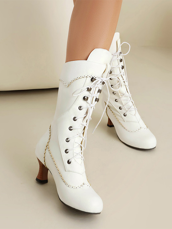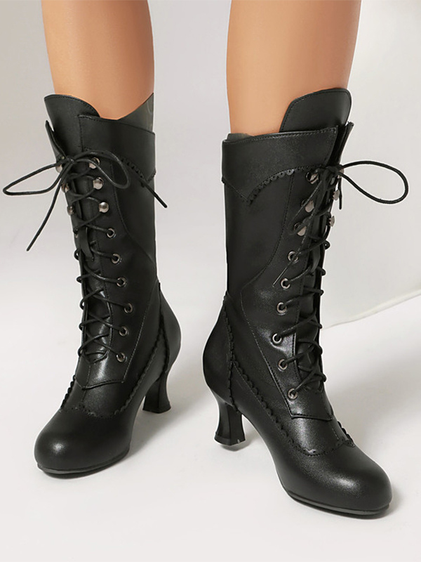 クラシックなヴィンテージスタイルのロリータブーツ PUレザー ラウンドトゥ ブラック ロリータシューズ