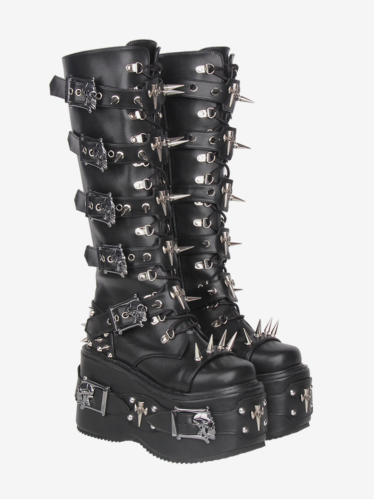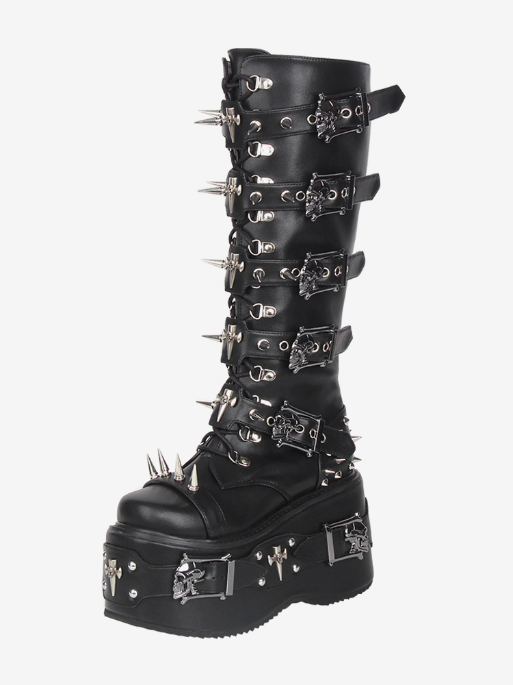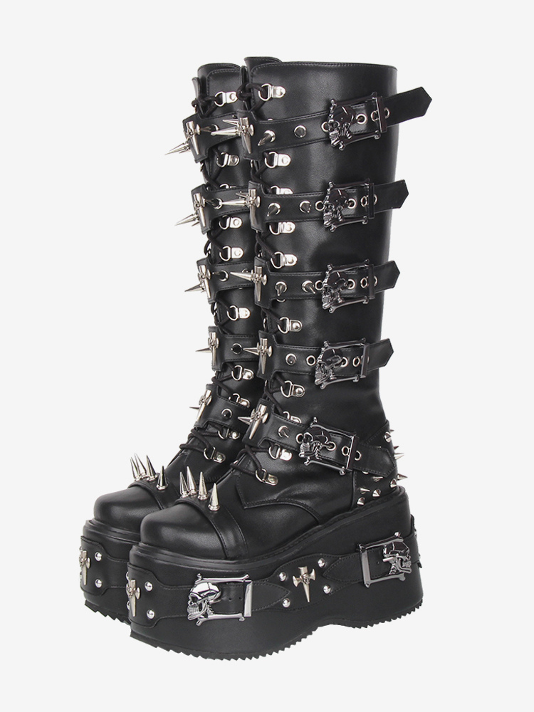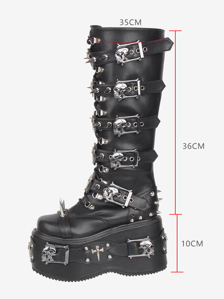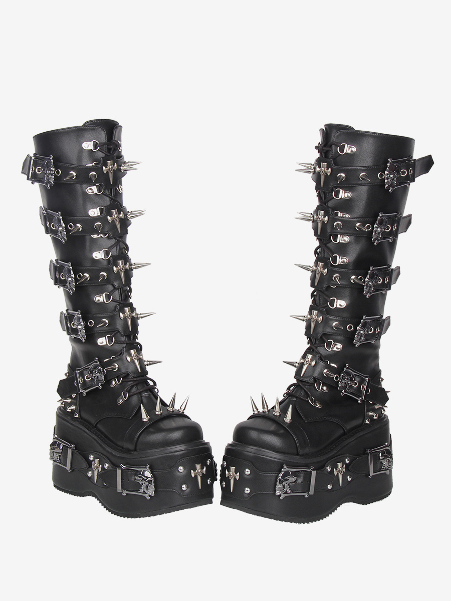 ゴシックロリータブーツ ブラック グロメット リベット ラウンドトゥ PUレザー ウェッジヒール ロリータシューズ
