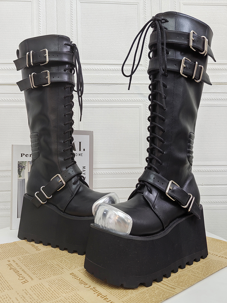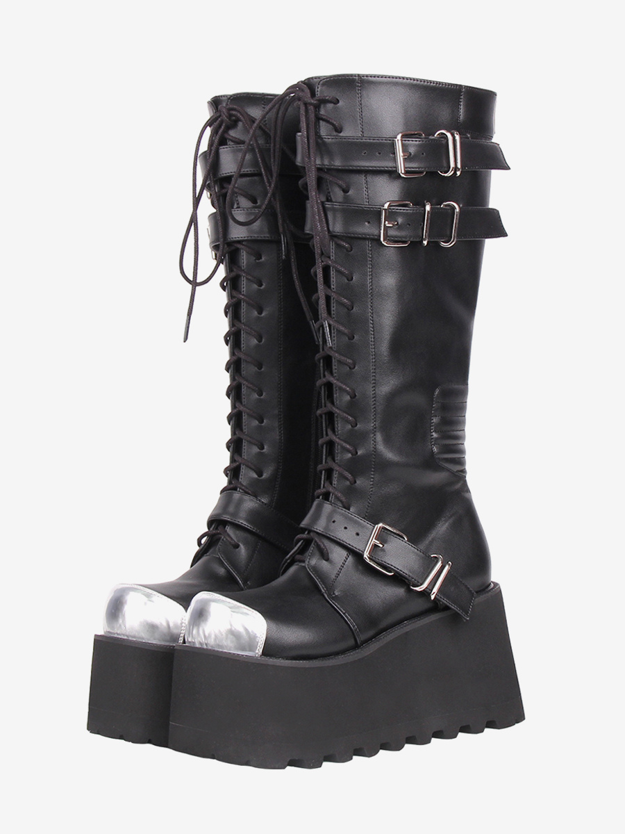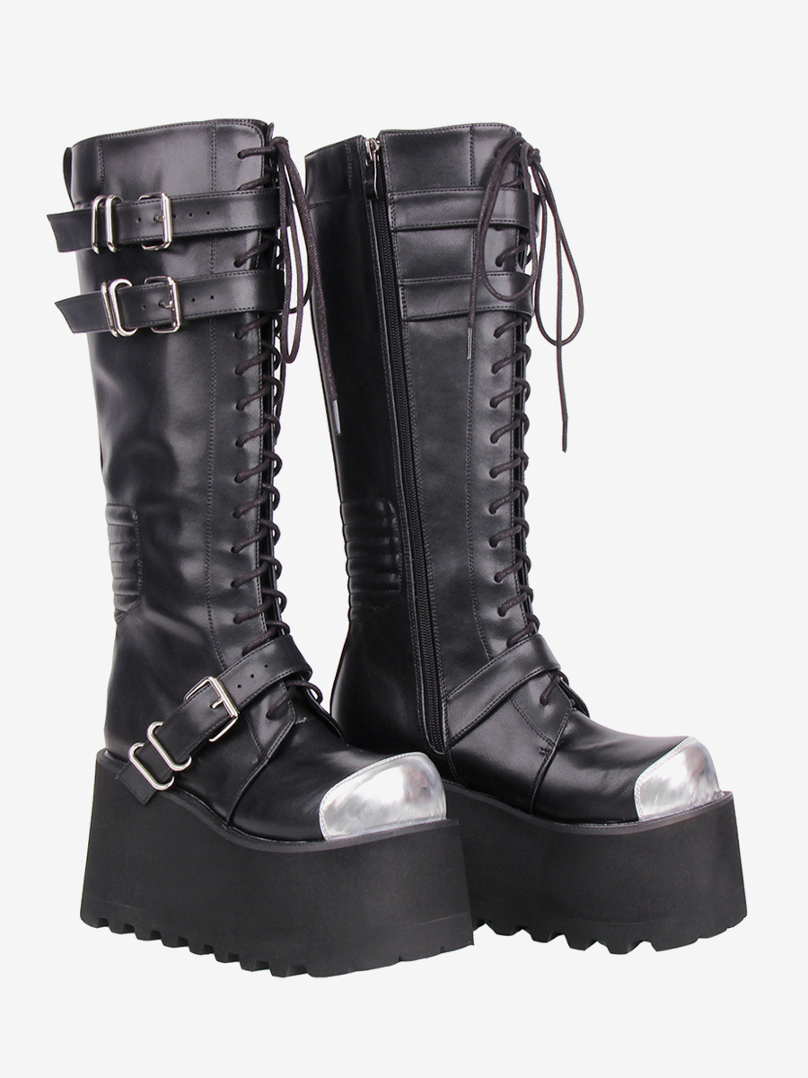ゴシックロリータブーツ ブラック グロメット ラウンドトゥ PUレザー ウェッジヒール ロリータシューズ