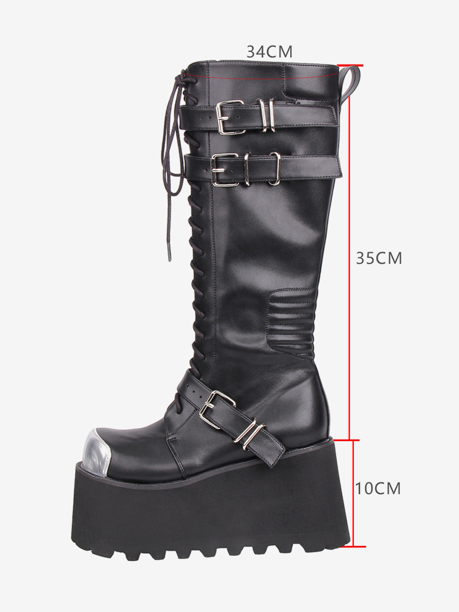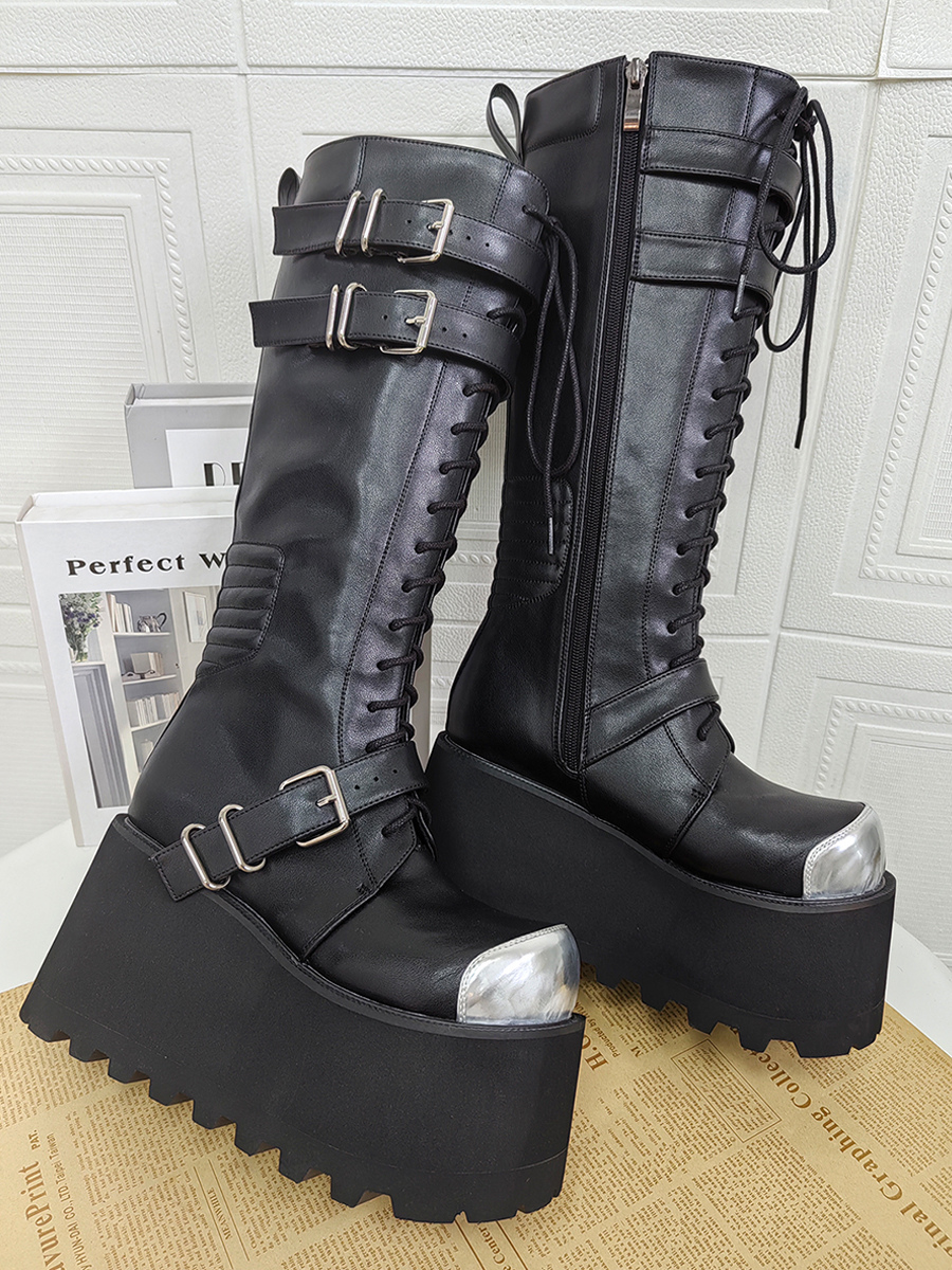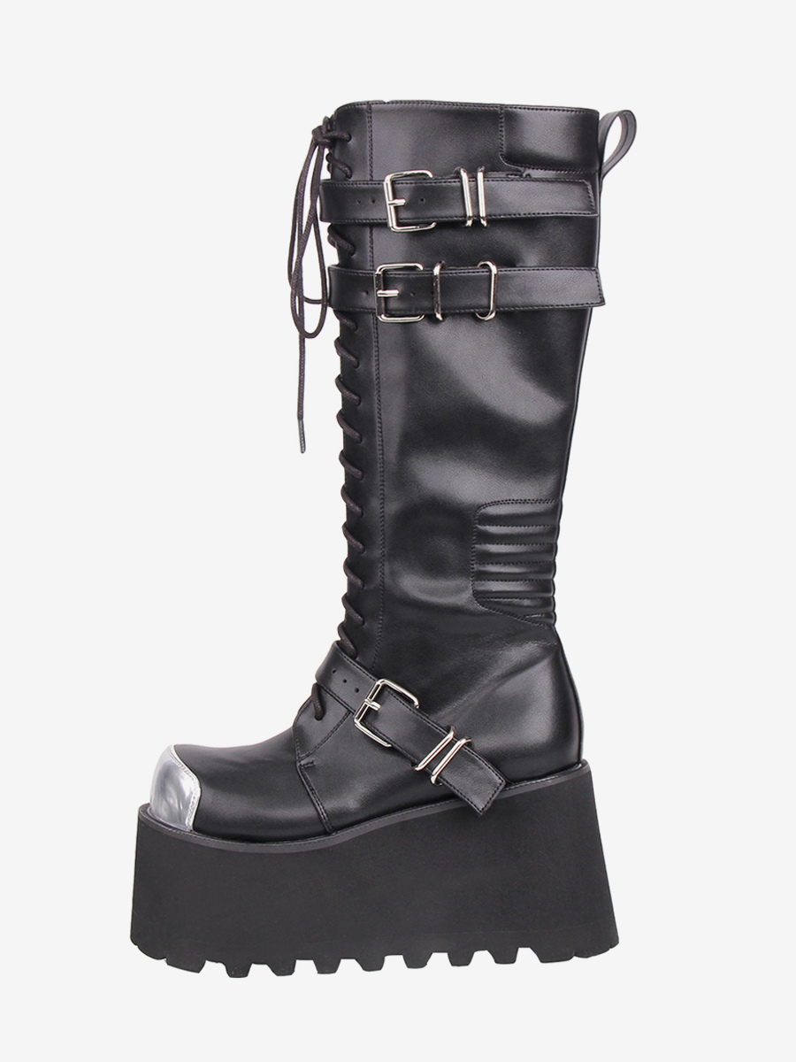 ゴシックロリータブーツ ブラック グロメット ラウンドトゥ PUレザー ウェッジヒール ロリータシューズ