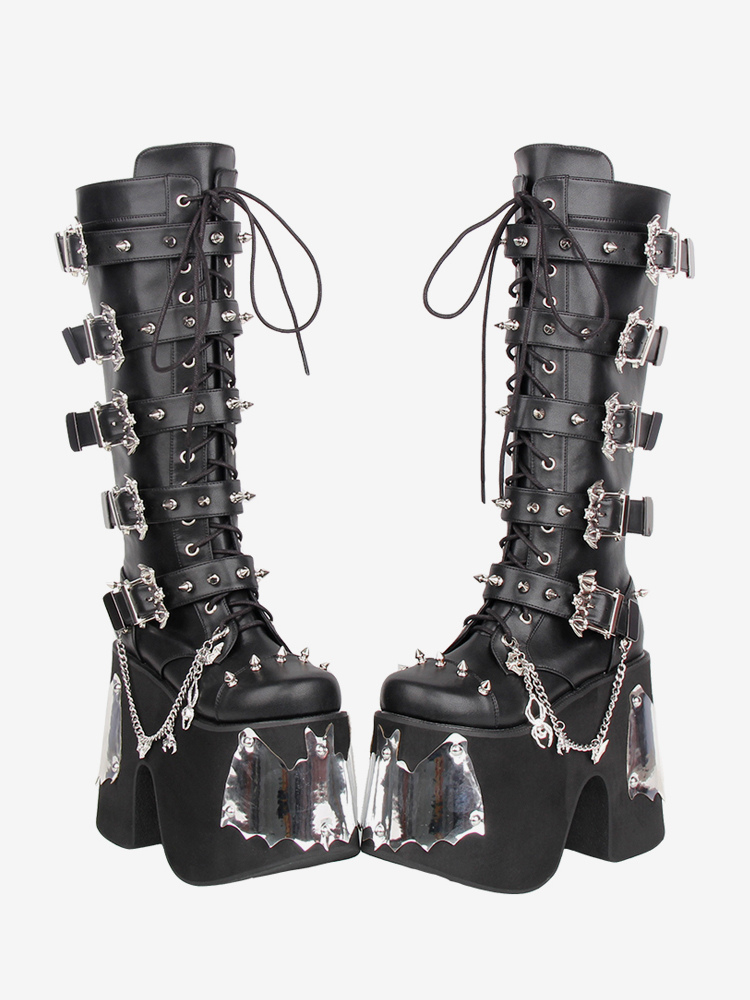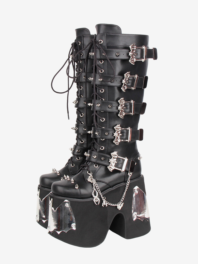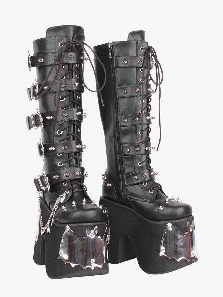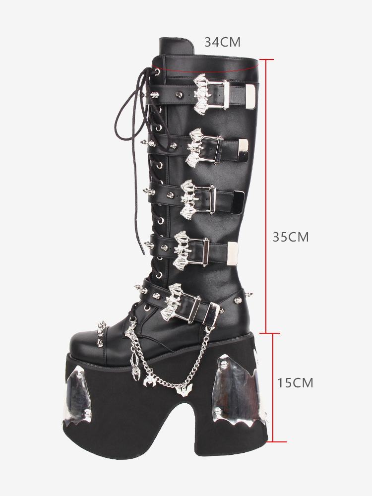 ゴシックロリータブーツ ブラック グロメット ラウンドトゥ PUレザー ウェッジヒール ロリータシューズ