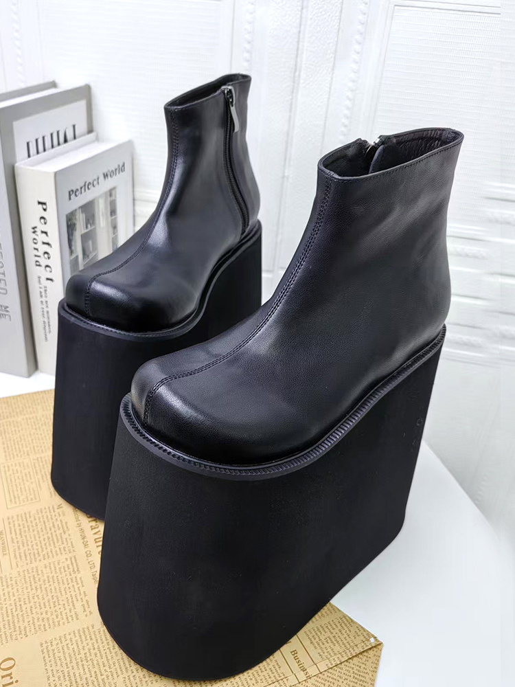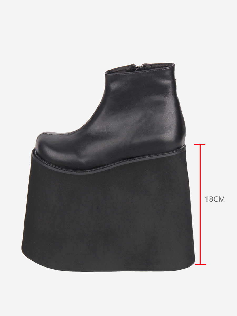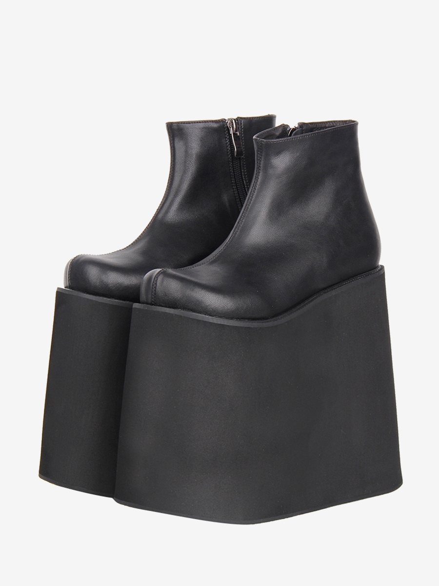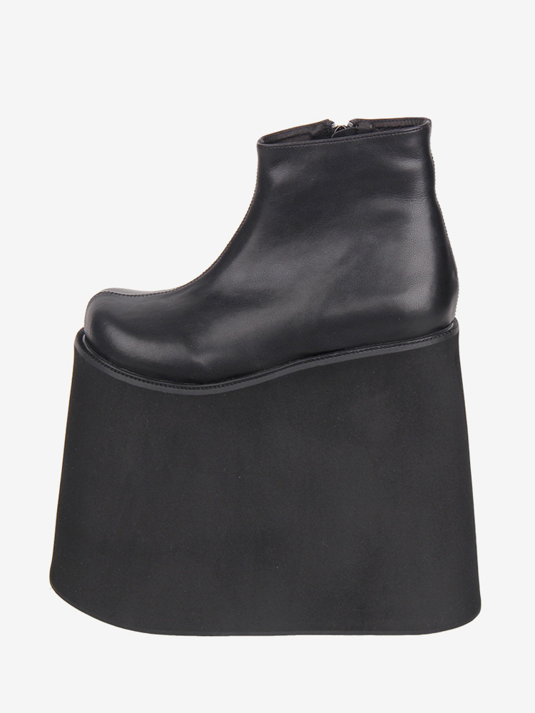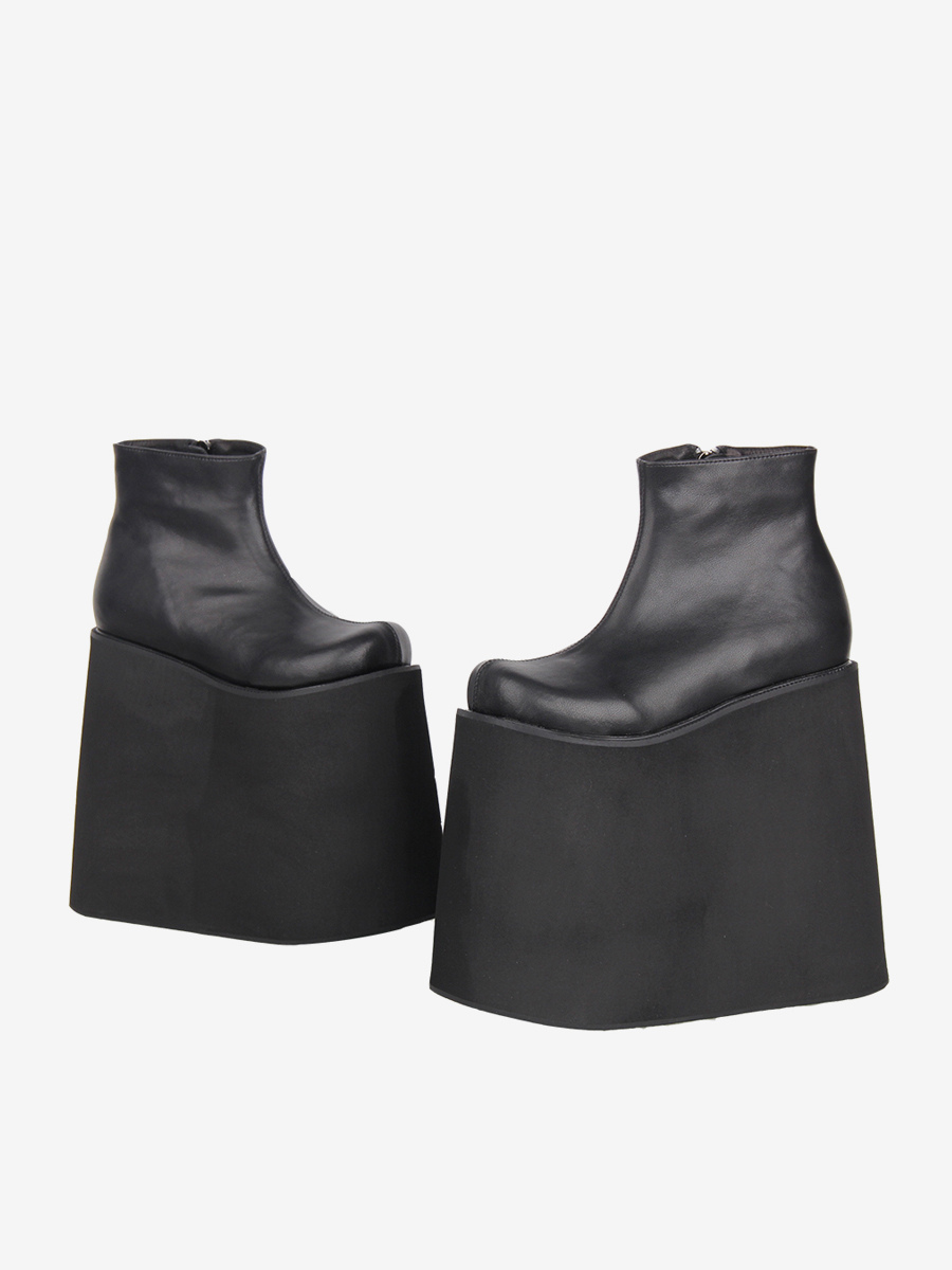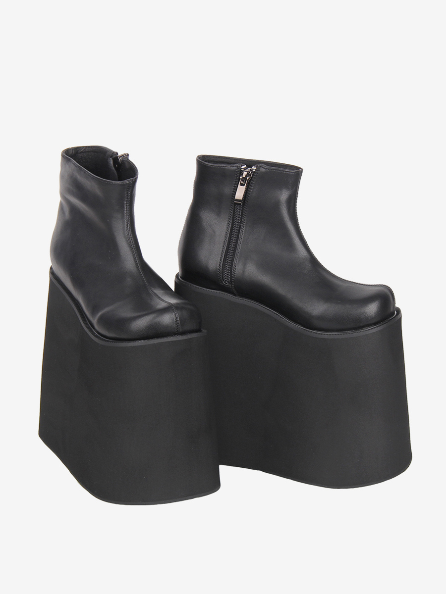 ゴシックロリータブーツ ブラック PU ラウンドトゥ PUレザー ウェッジヒール プラットフォーム ロリータシューズ