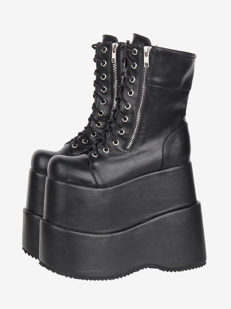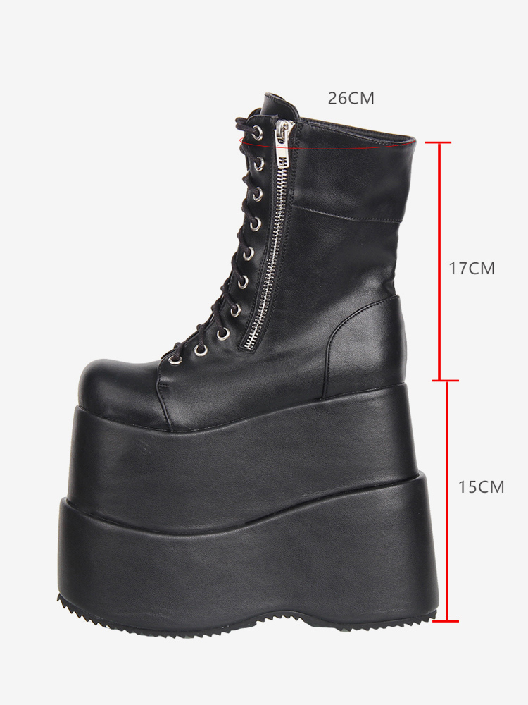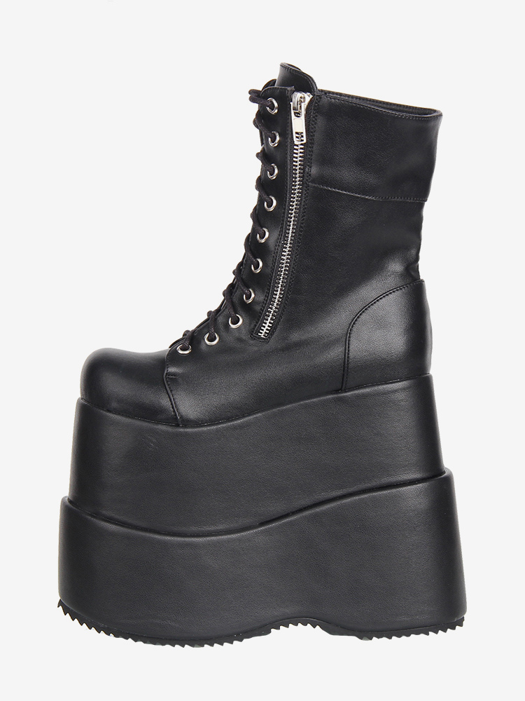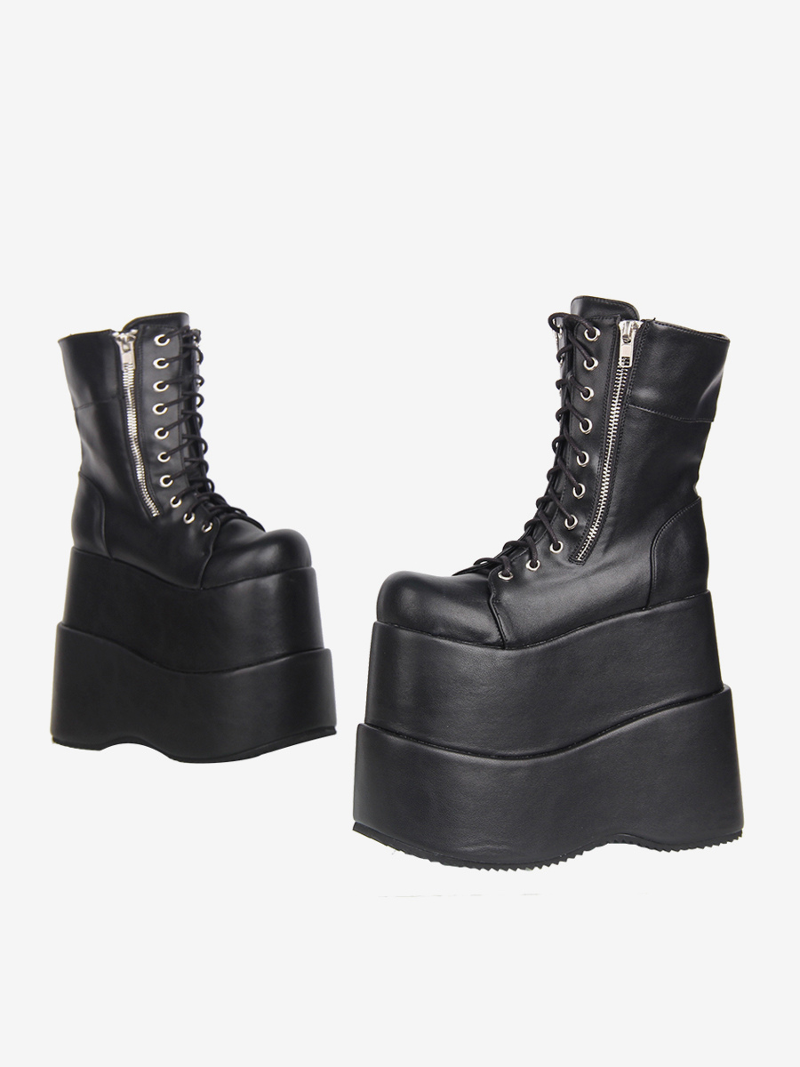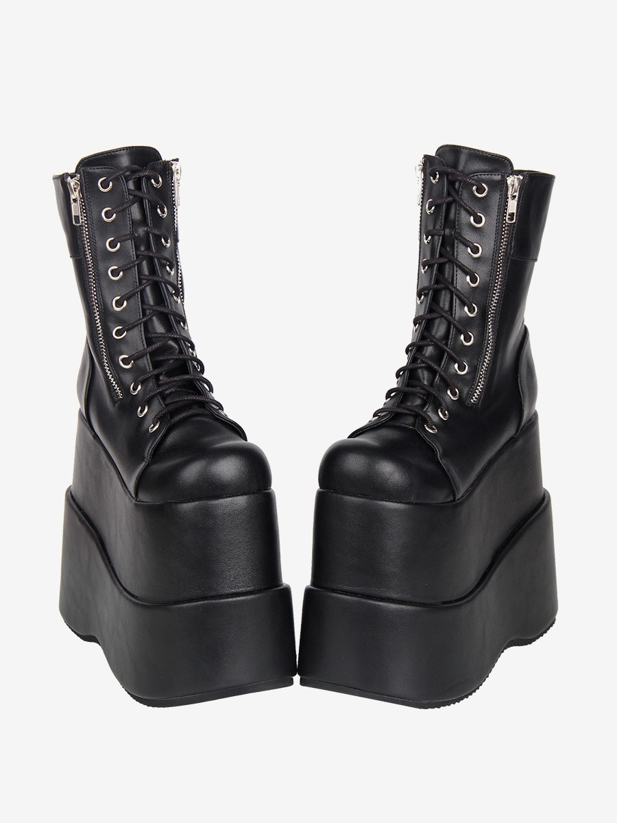ゴシックロリータブーツ ブラック PU ラウンドトゥ ウェッジヒール ロリータシューズ
