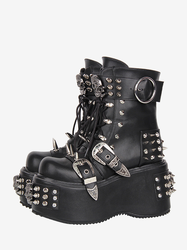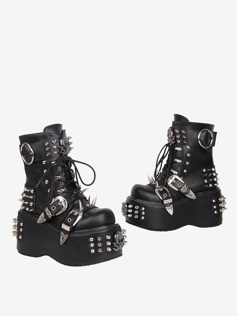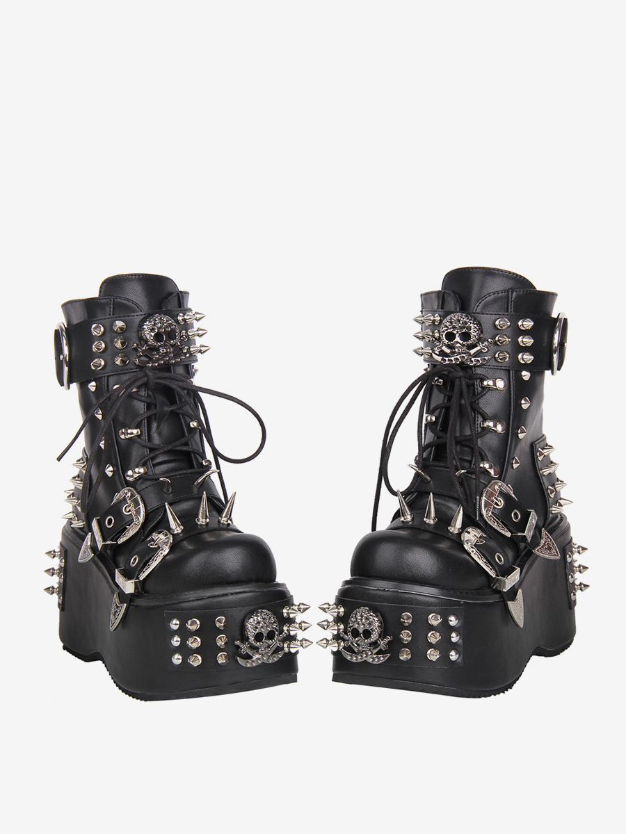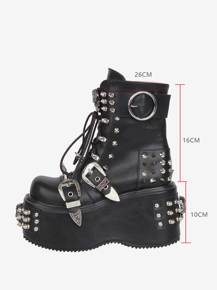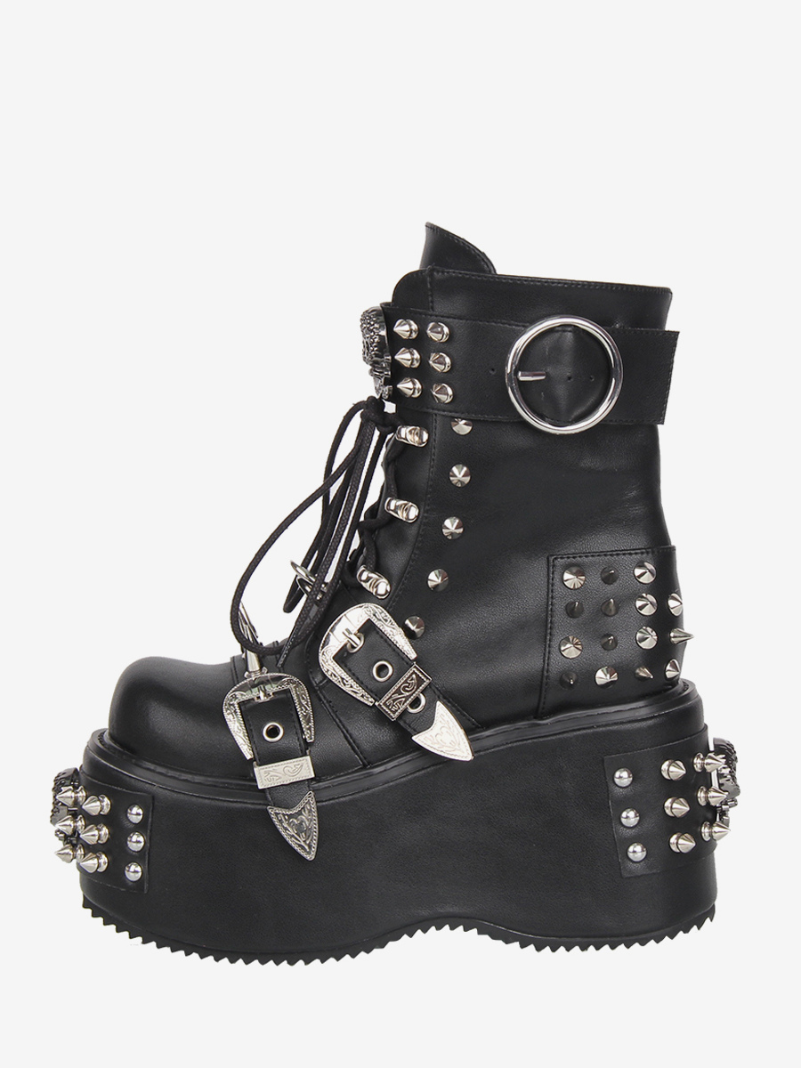 ゴシックロリータブーツ ブラック PU ラウンドトゥ ウェッジヒール プラットフォーム ロリータシューズ