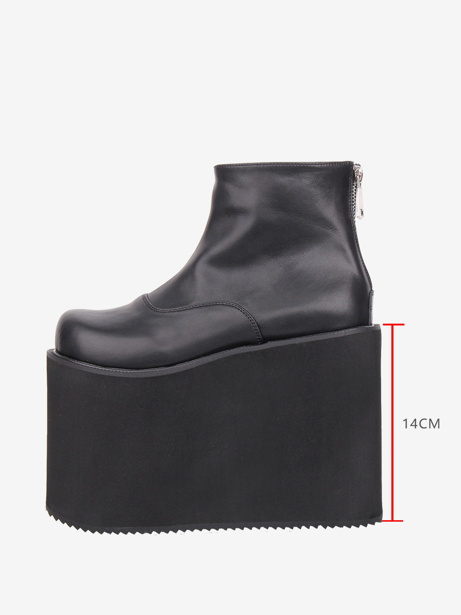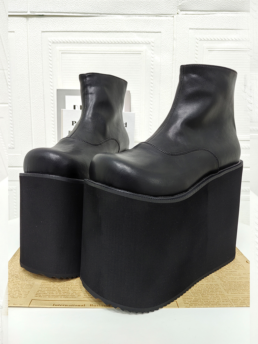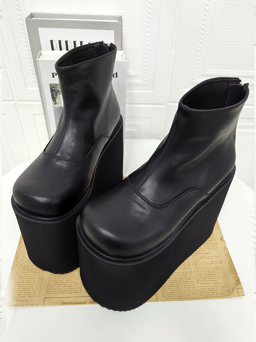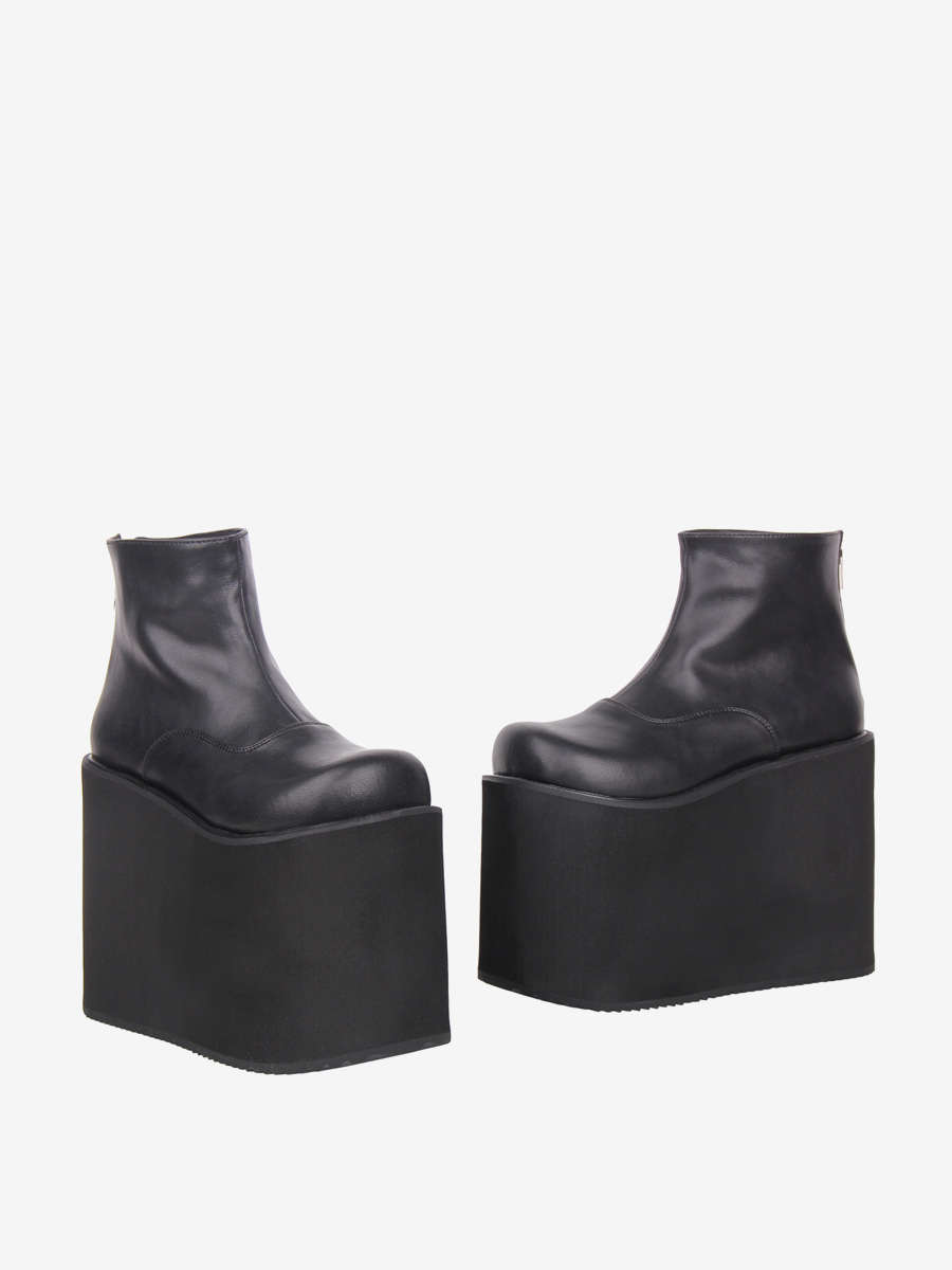 ゴシックロリータブーツ ブラック ラウンドトゥ PUレザー ウェッジヒール ロリータシューズ