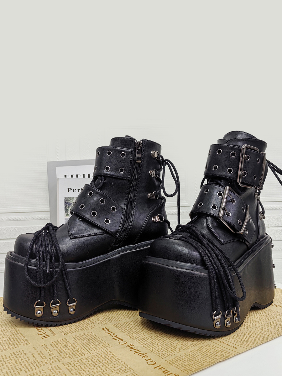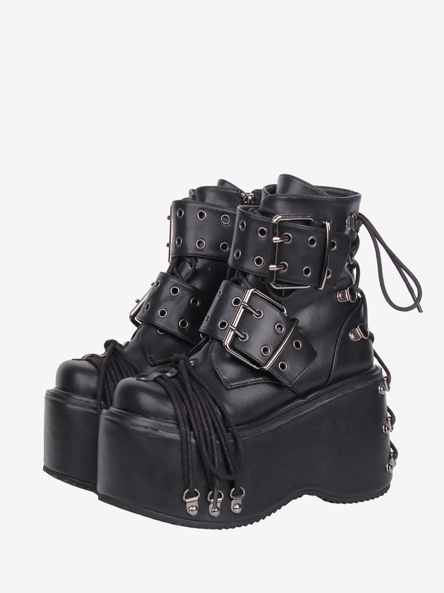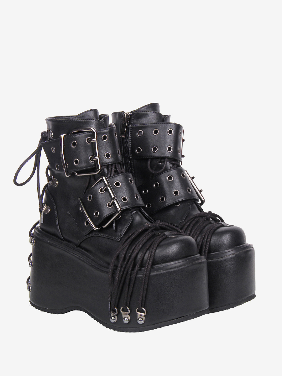 ゴシックロリータブーツ PUレザー グロメット ラウンドトゥ ブラック ウェッジヒール ロリータシューズ