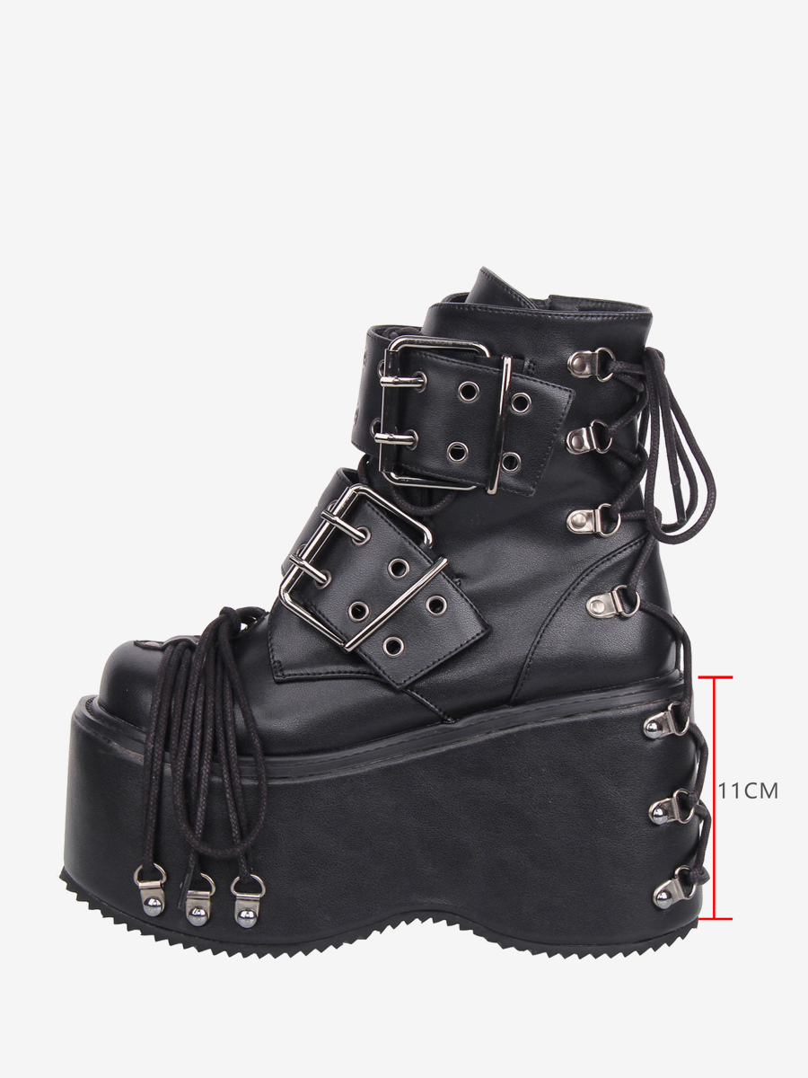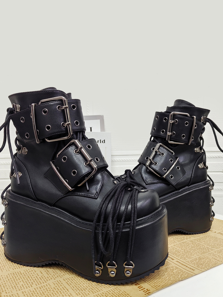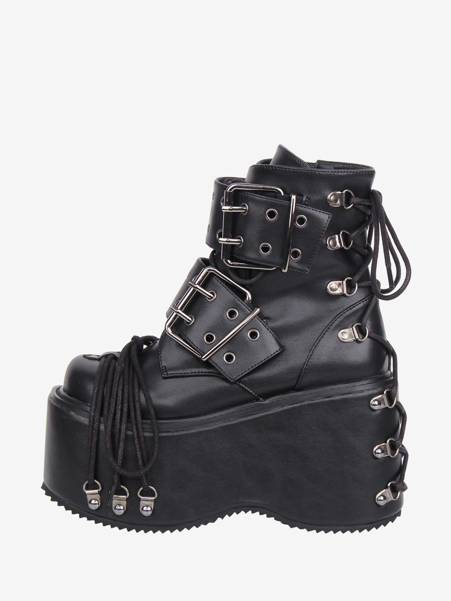 ゴシックロリータブーツ PUレザー グロメット ラウンドトゥ ブラック ウェッジヒール ロリータシューズ