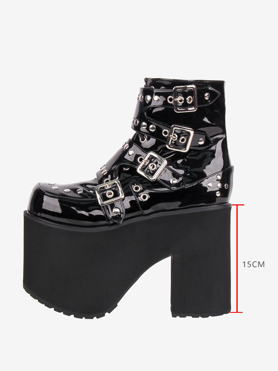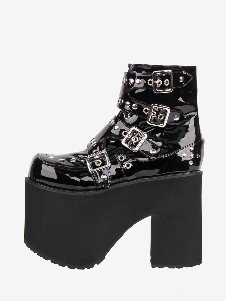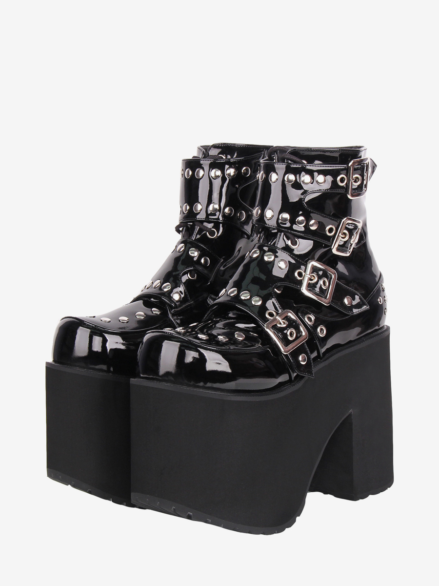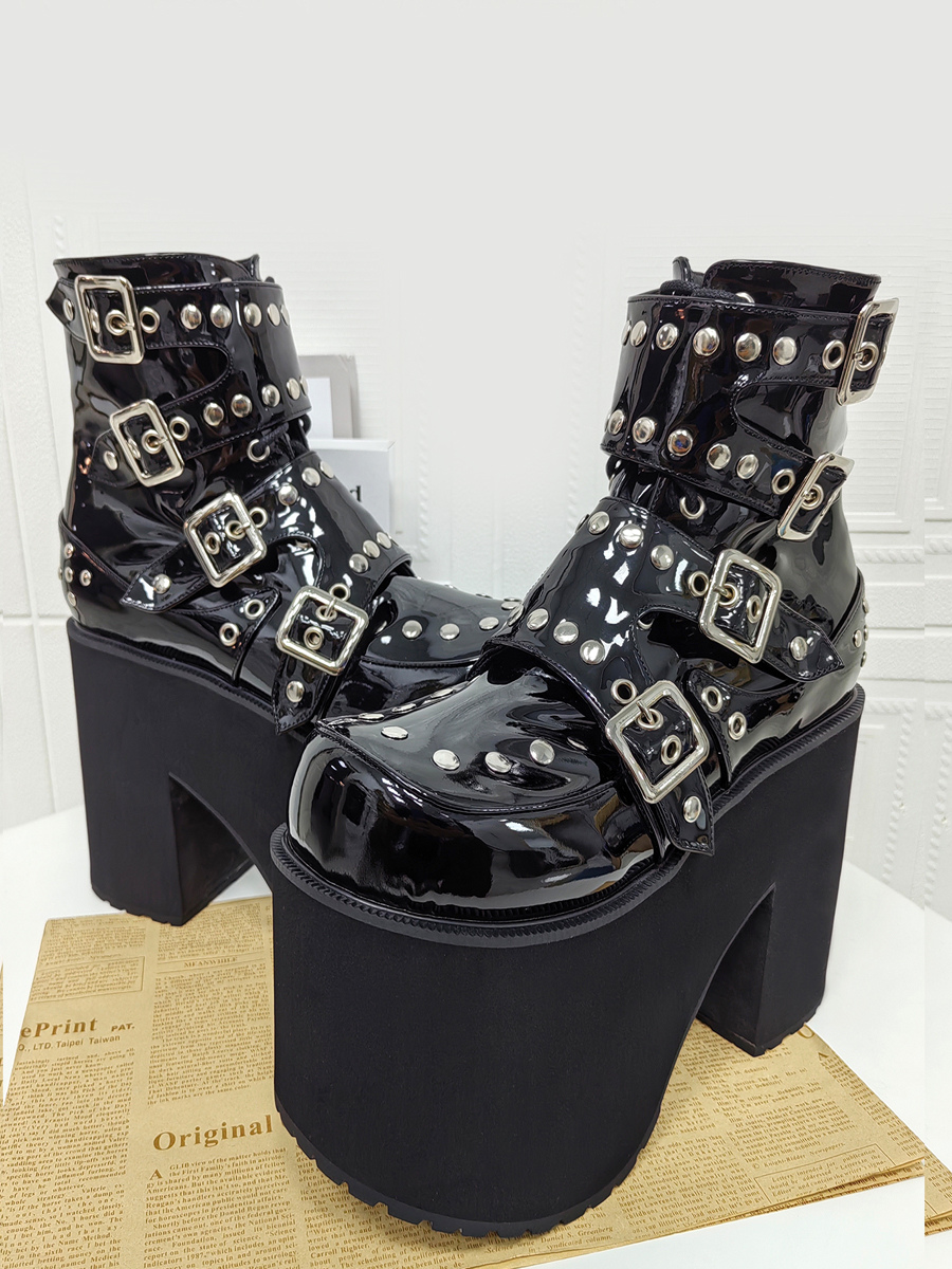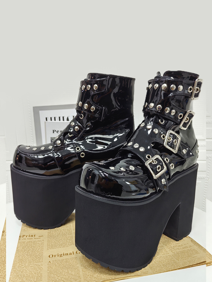 ゴシックロリータブーツ PUレザー ラウンドトゥ ブラック チャンキーヒール ロリータシューズ