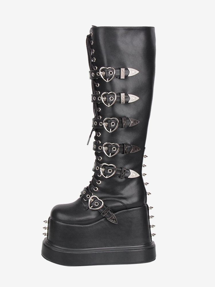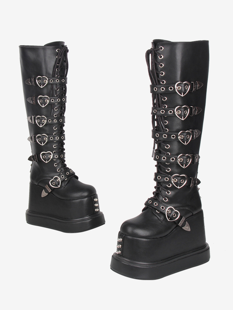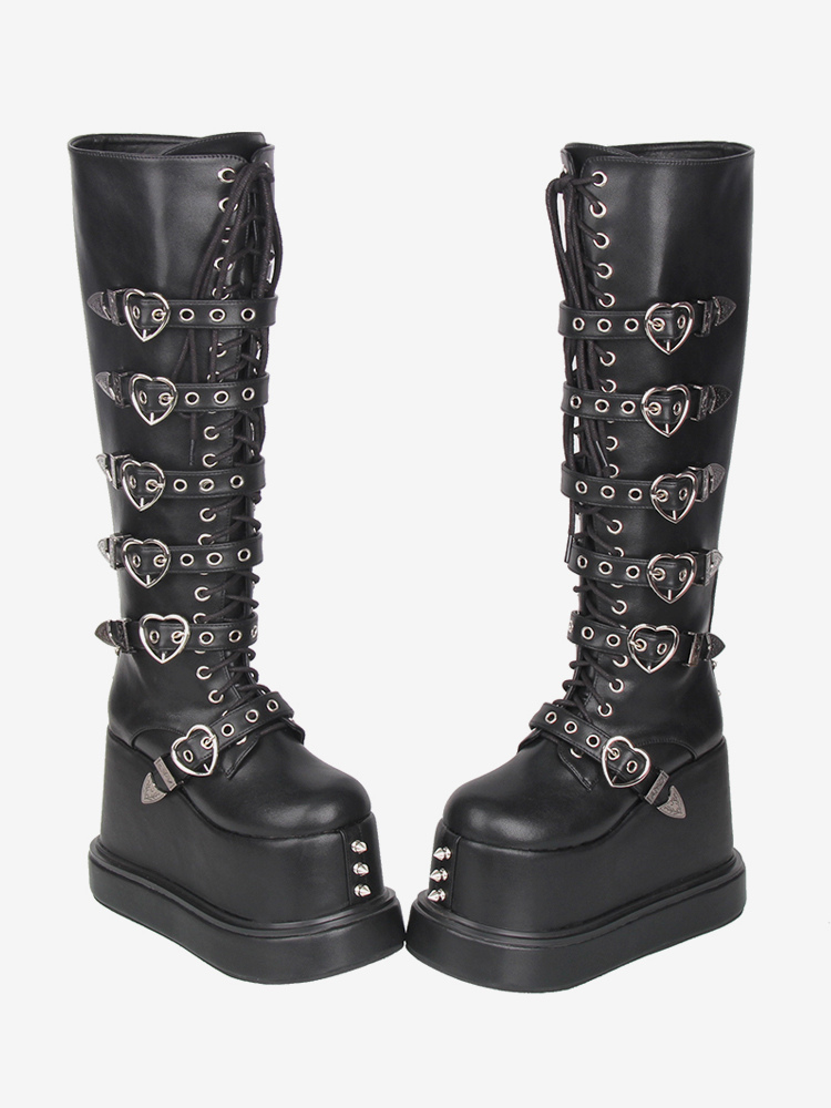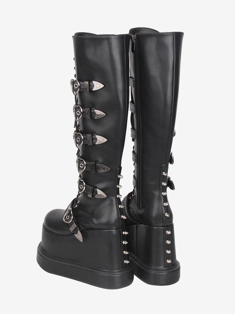 ゴシックロリータブーツ PUレザー ラウンドトゥ ブラック ウェッジヒール ロリータシューズ