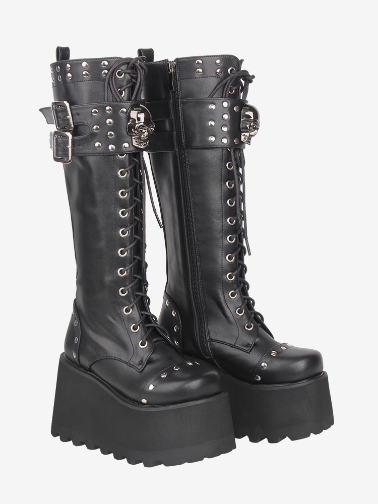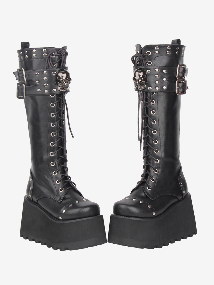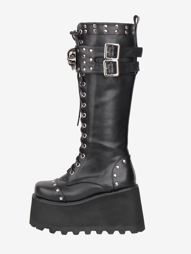 ゴシックロリータブーツ PUレザー ラウンドトゥ ブラック ウェッジヒール プラットフォーム ロリータシューズ