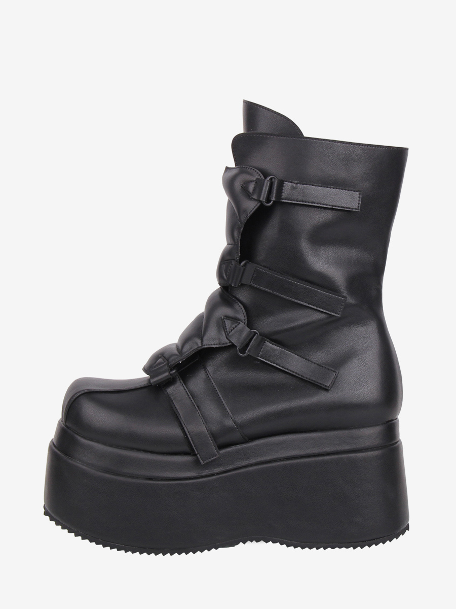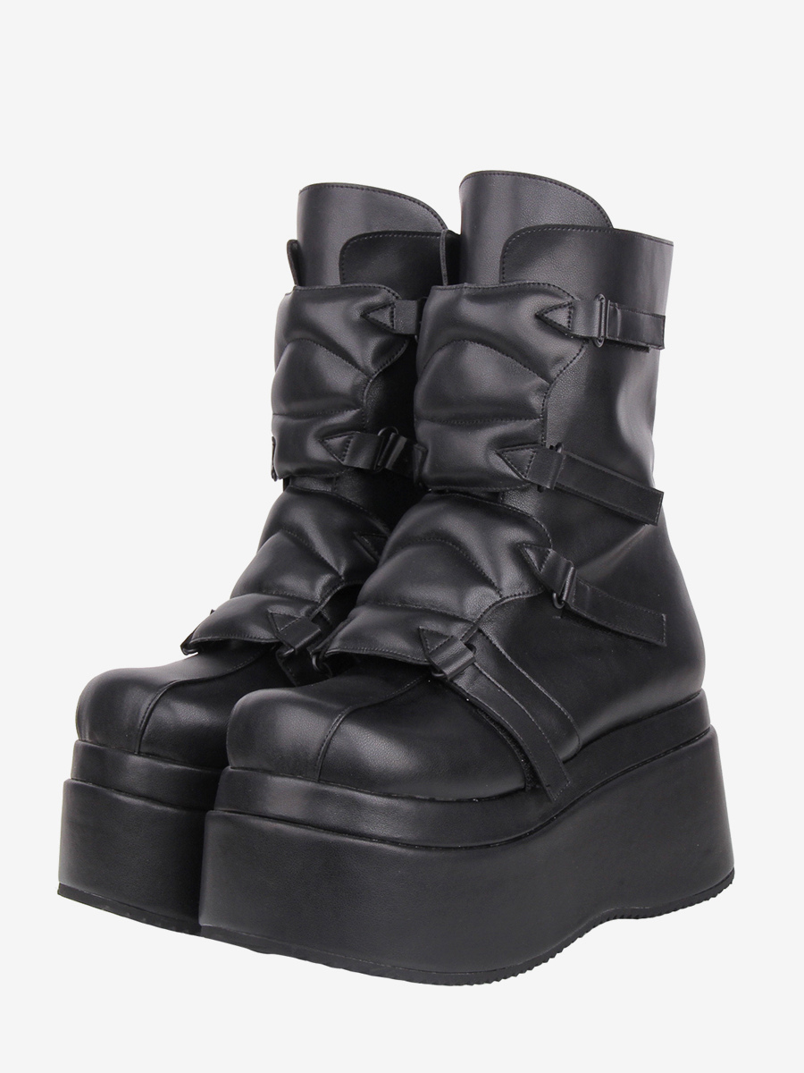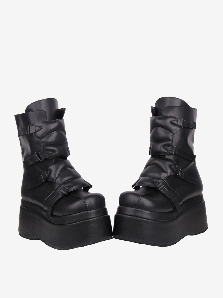 ゴシックロリータブーツ PUレザー ウェッジヒール プラットフォーム ラウンドトゥ ブラック ロリータシューズ