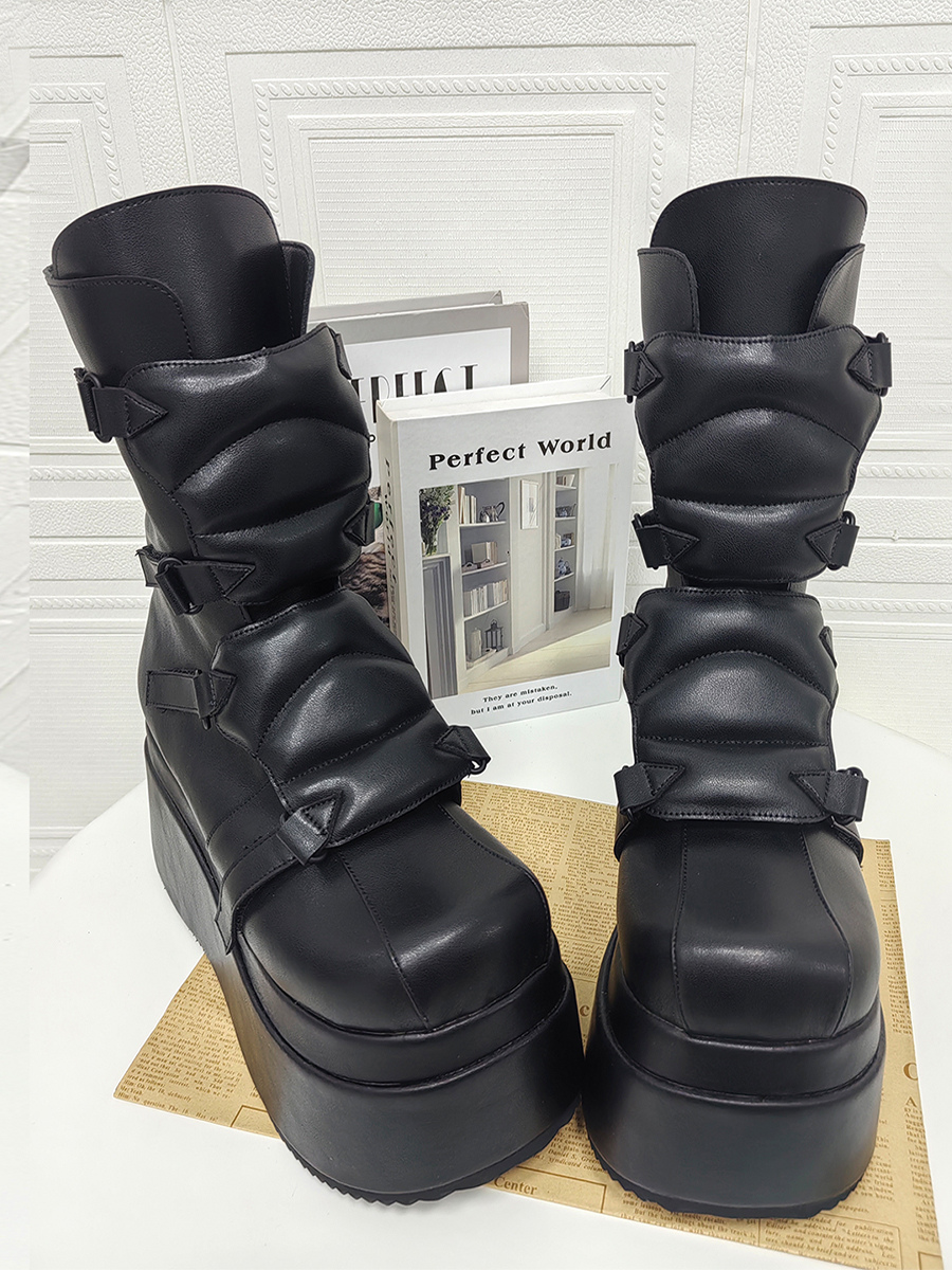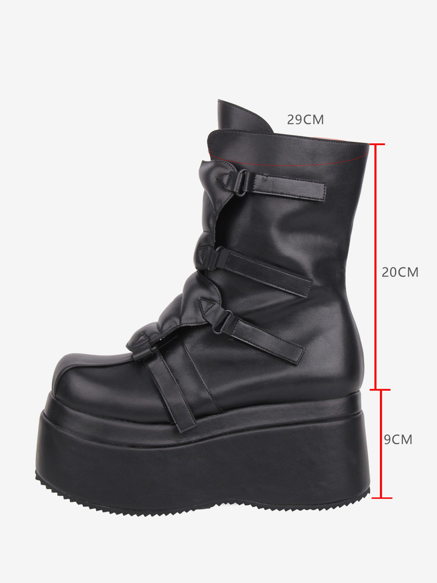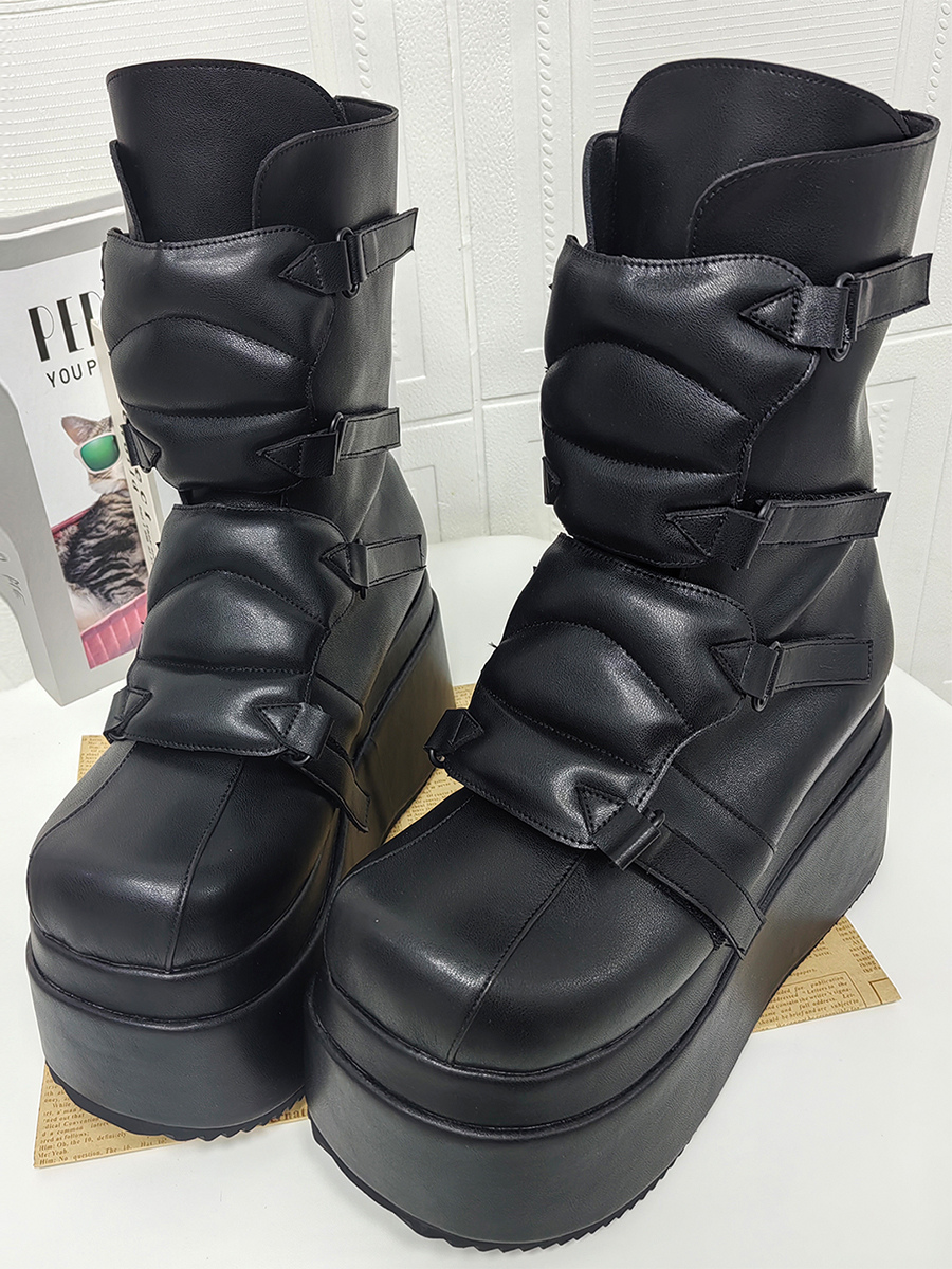 ゴシックロリータブーツ PUレザー ウェッジヒール プラットフォーム ラウンドトゥ ブラック ロリータシューズ