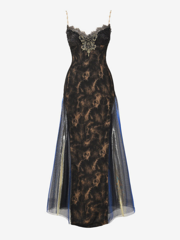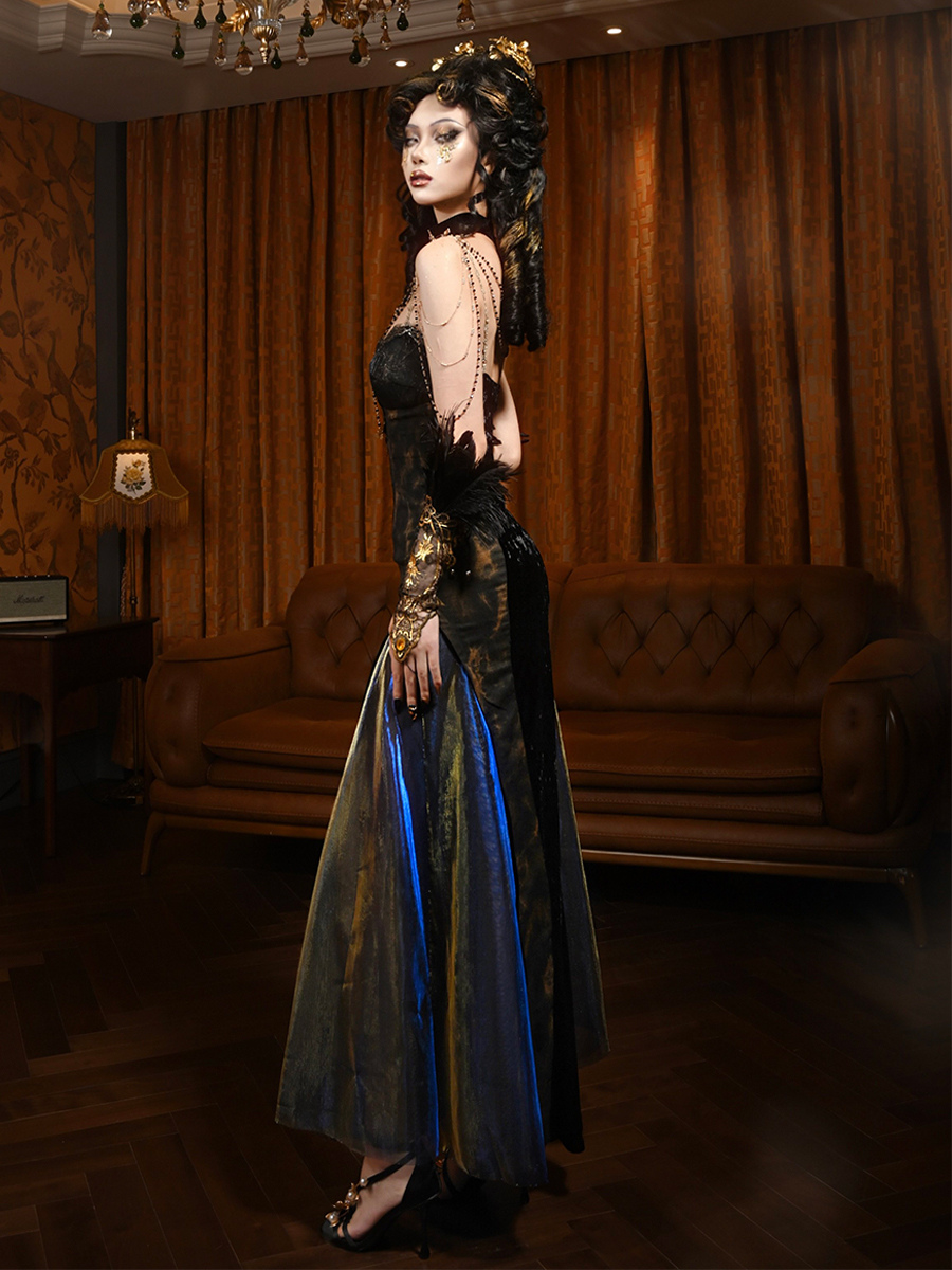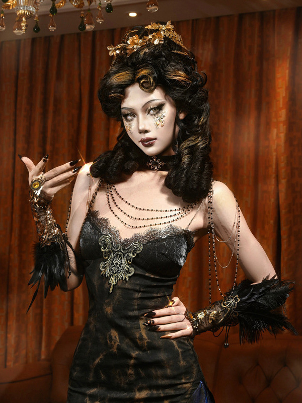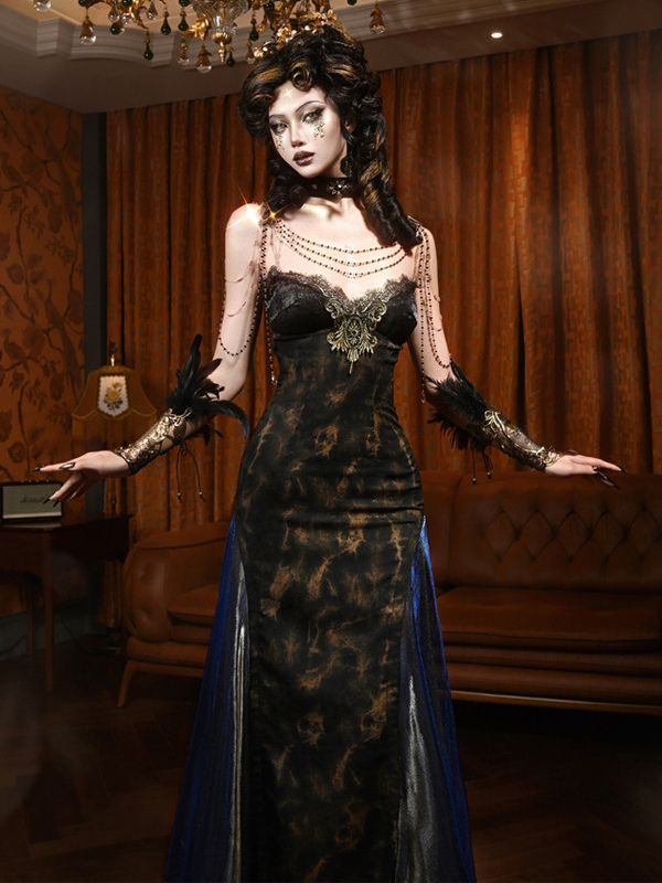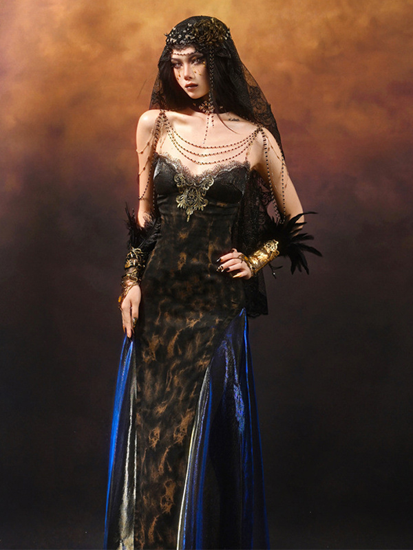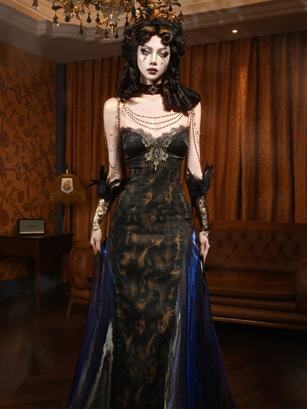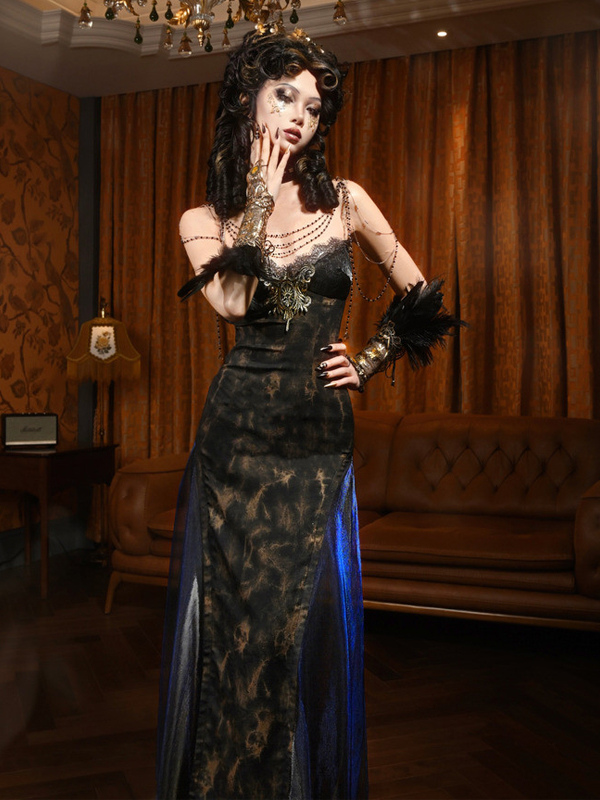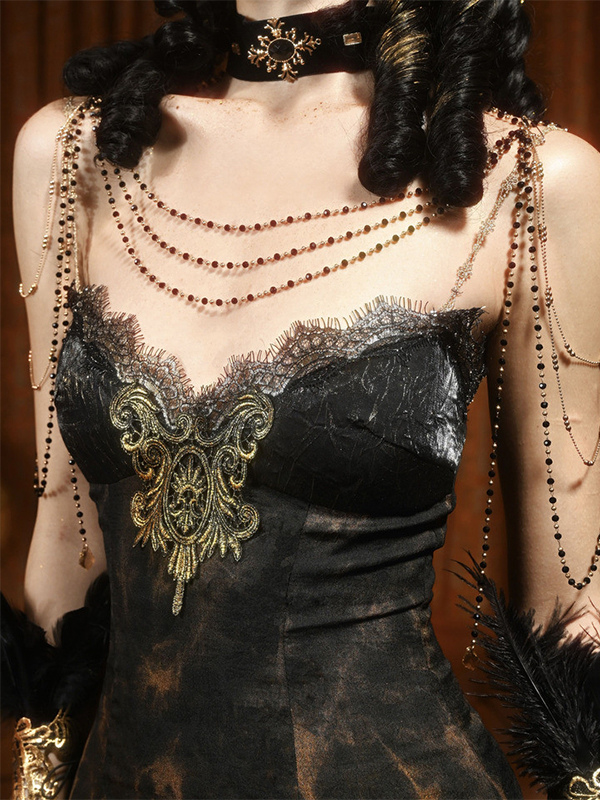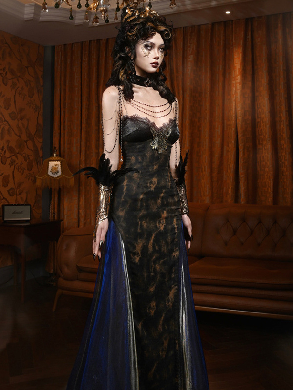 ゴシックロリータドレス ブラック ノースリーブ メタリックゴールド フィットフレア スパゲッティストラップ フルスカートガウン