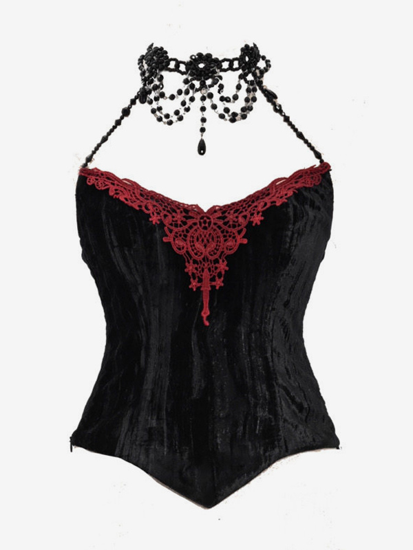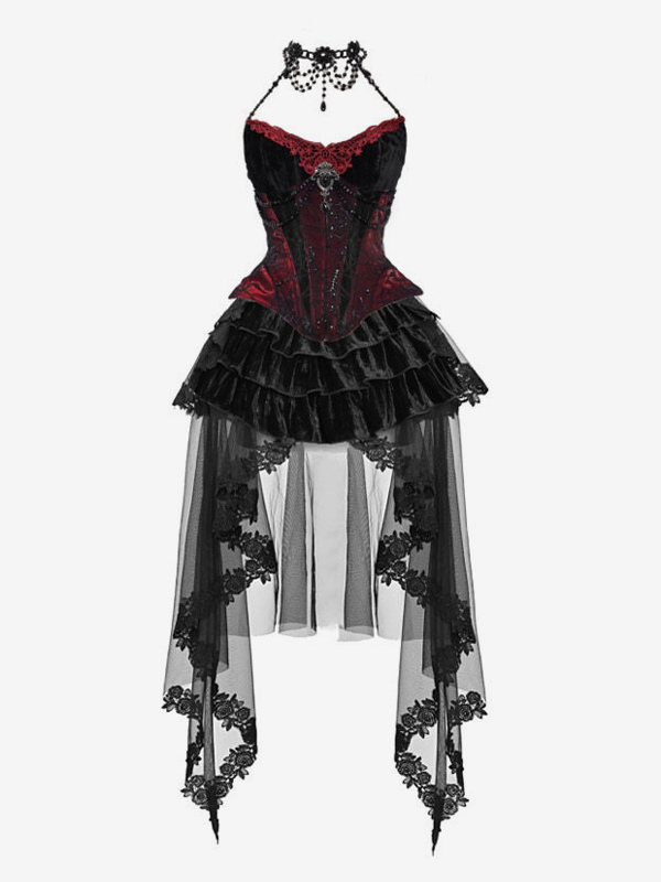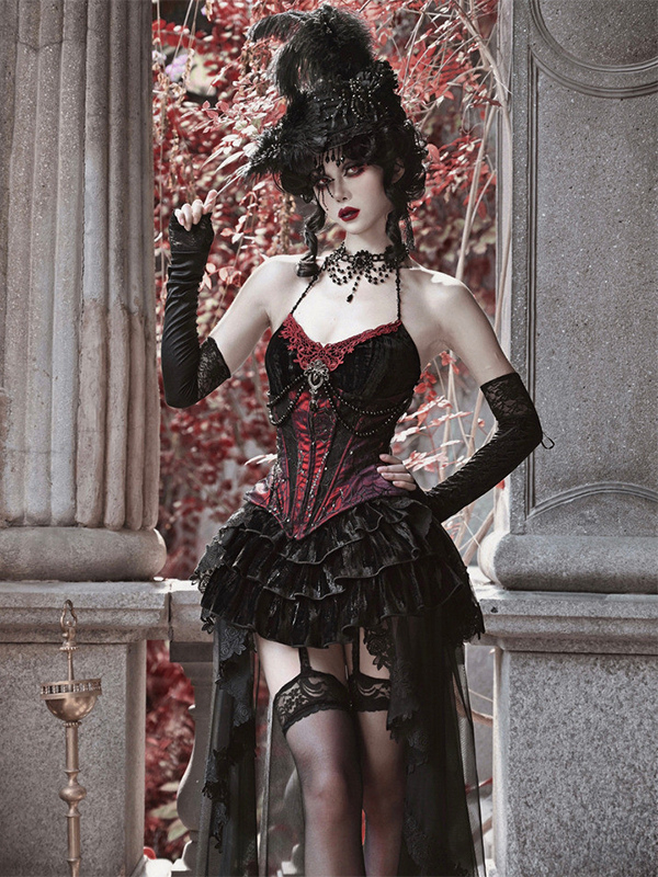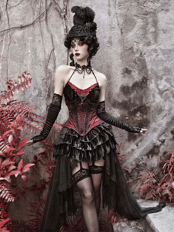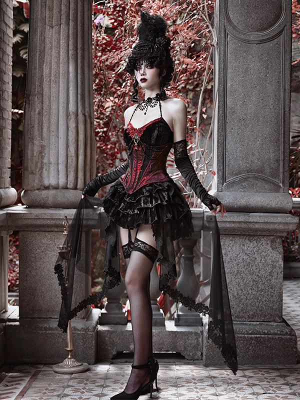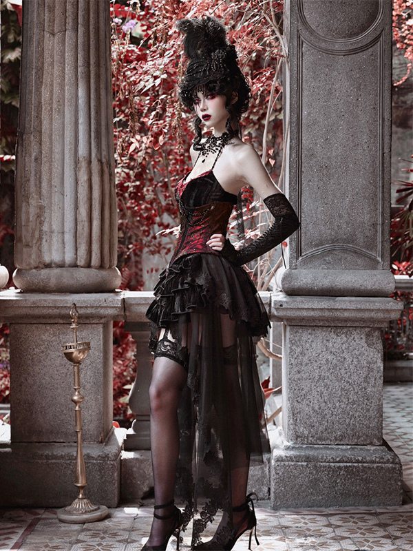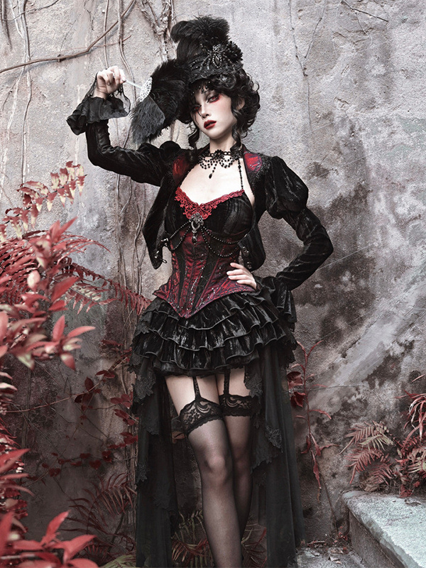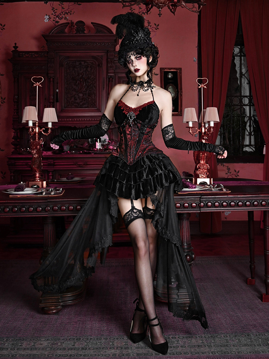 ゴシックロリータドレス ブラック ノースリーブ ロココ ベルベット ボーン入り コルセット ベスト トランペットスカート セット