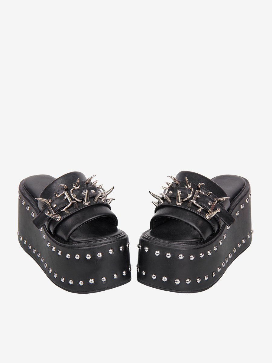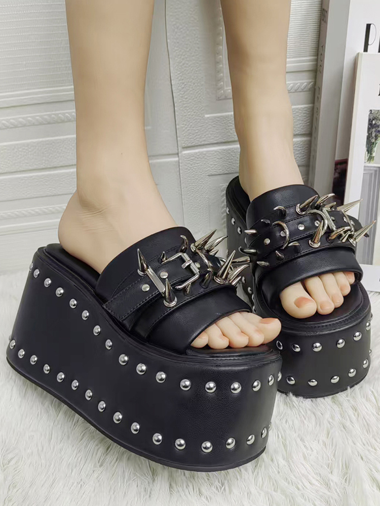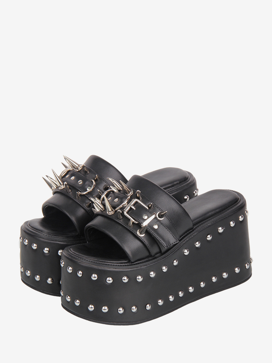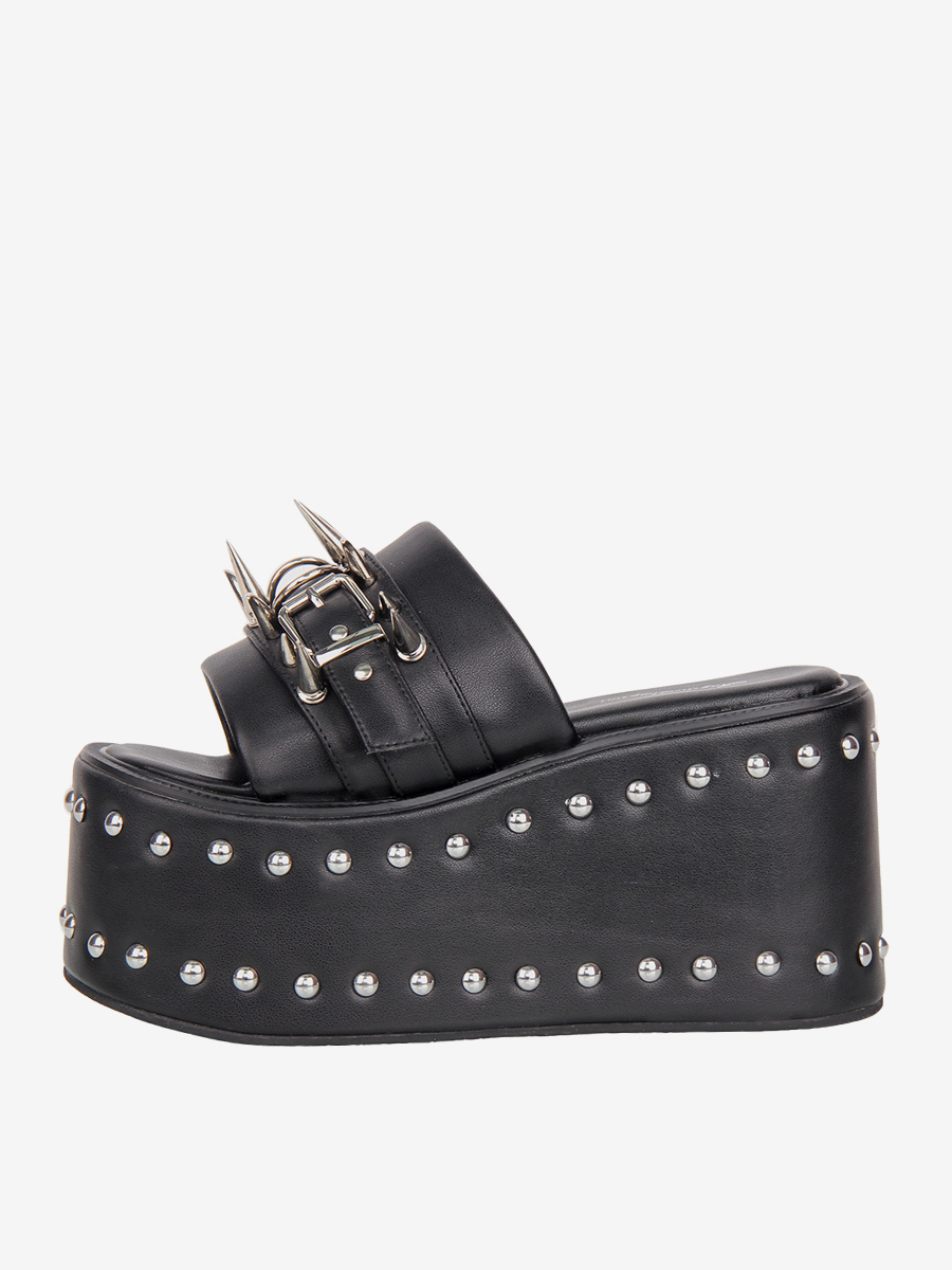 ゴシックロリータサンダル リベット ラウンドトゥ PUレザー ブラック ロリータ サマーシューズ
