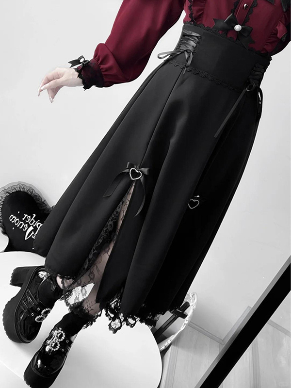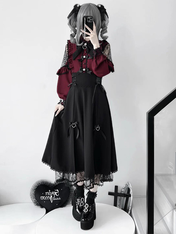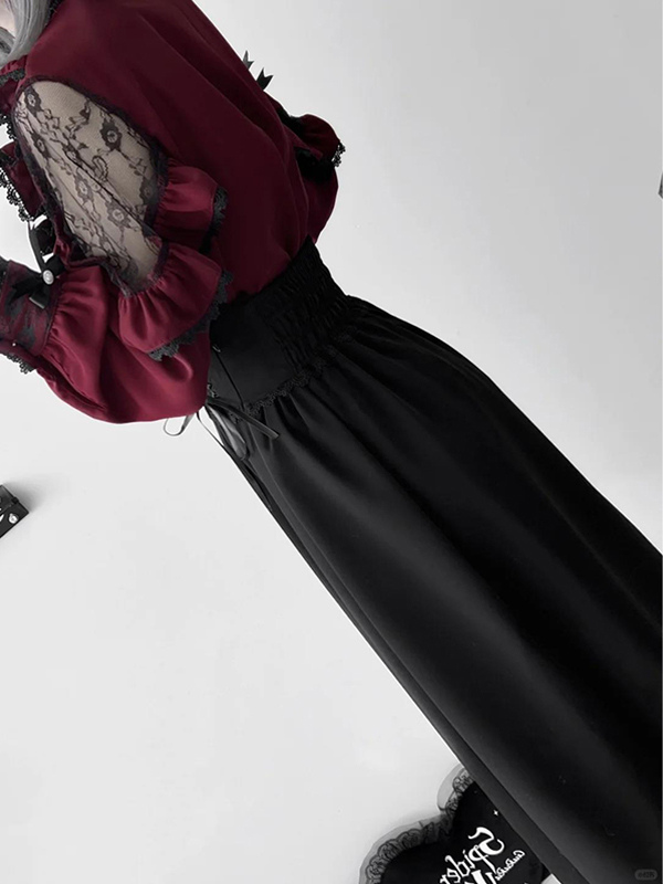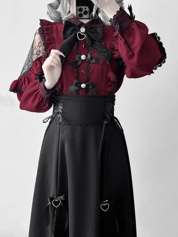 ゴシックロリータセット ブラック フリル リボン レース 長袖 シャツ スカート セット