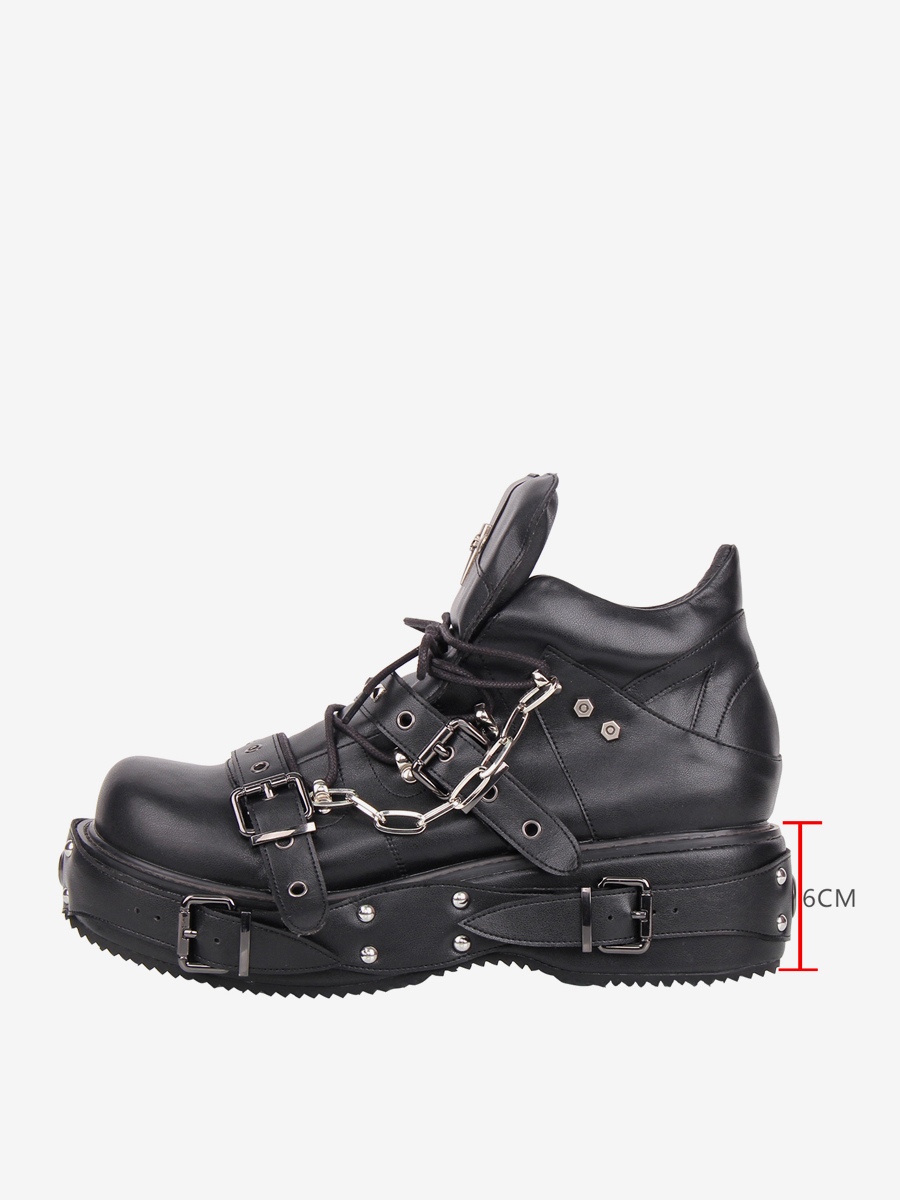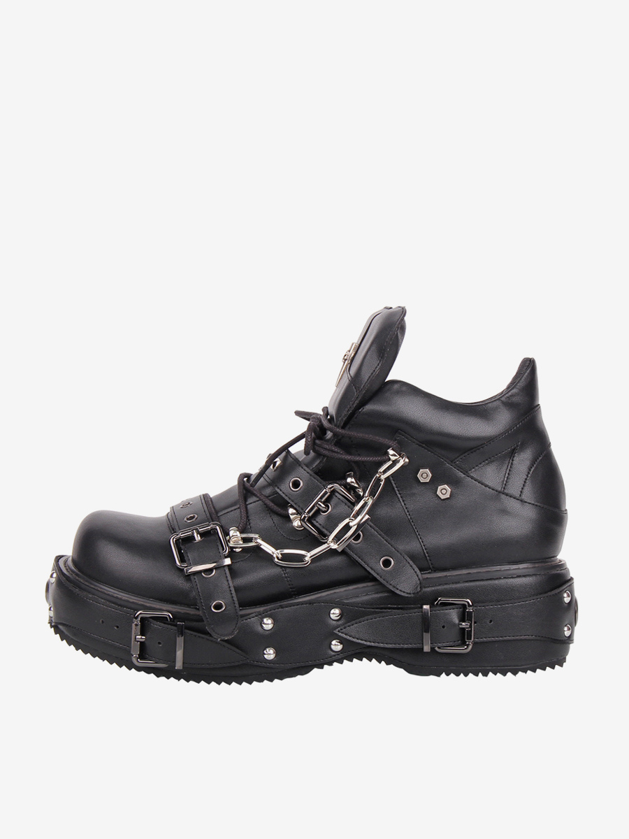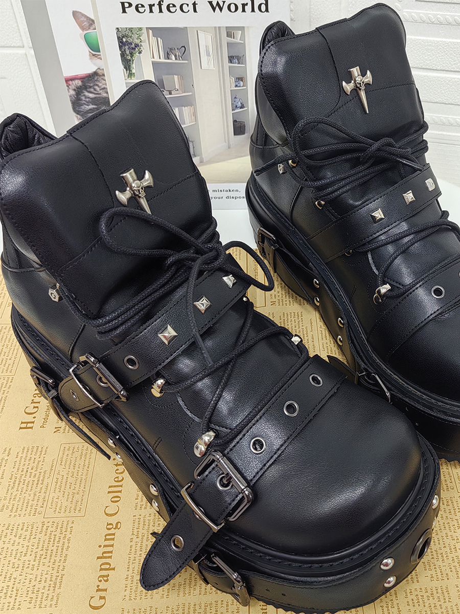 ゴシックロリータシューズ ブラック グロメット PUレザー ウェッジヒール ロリータパンプス