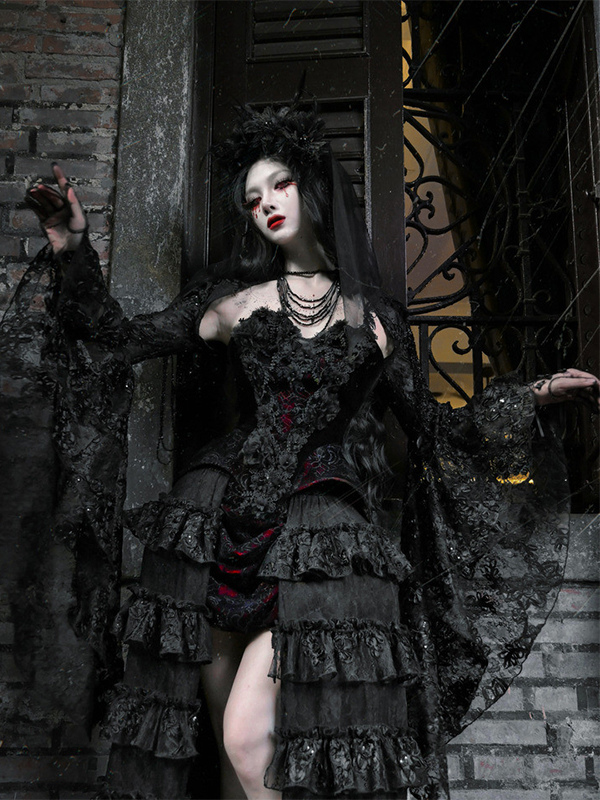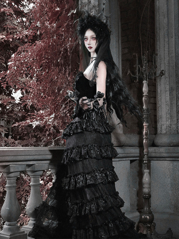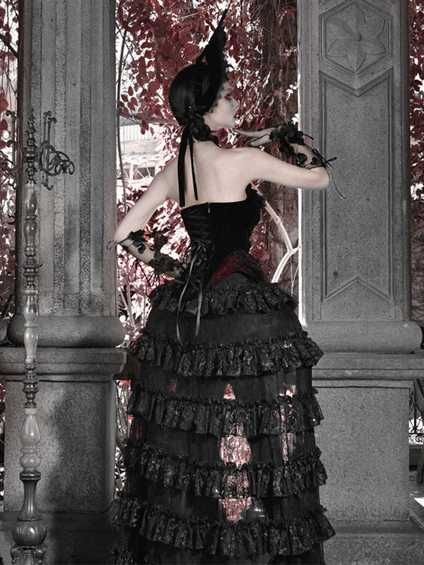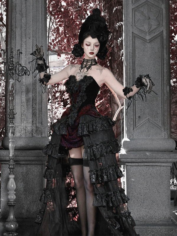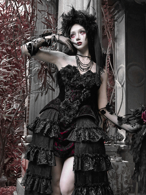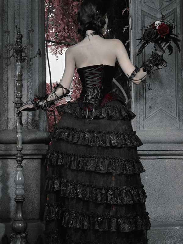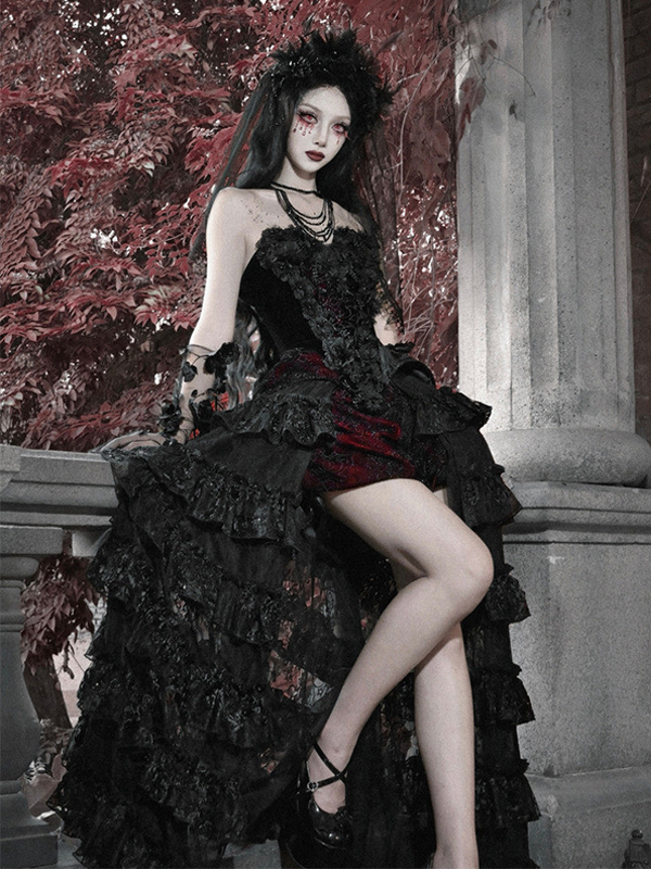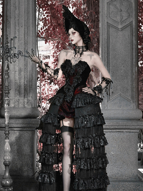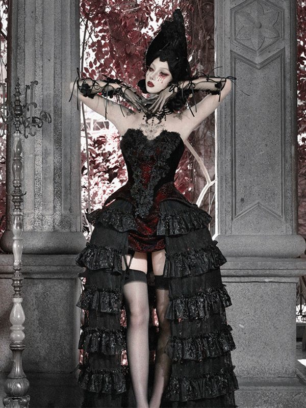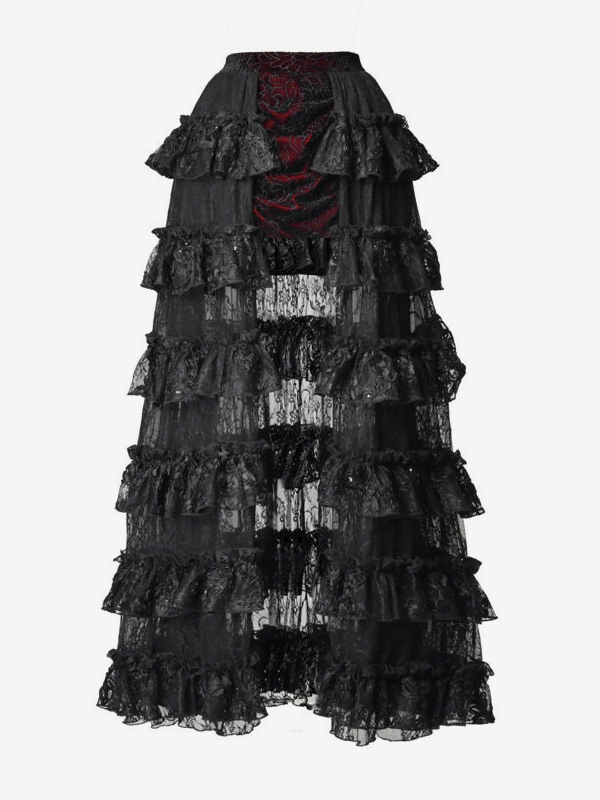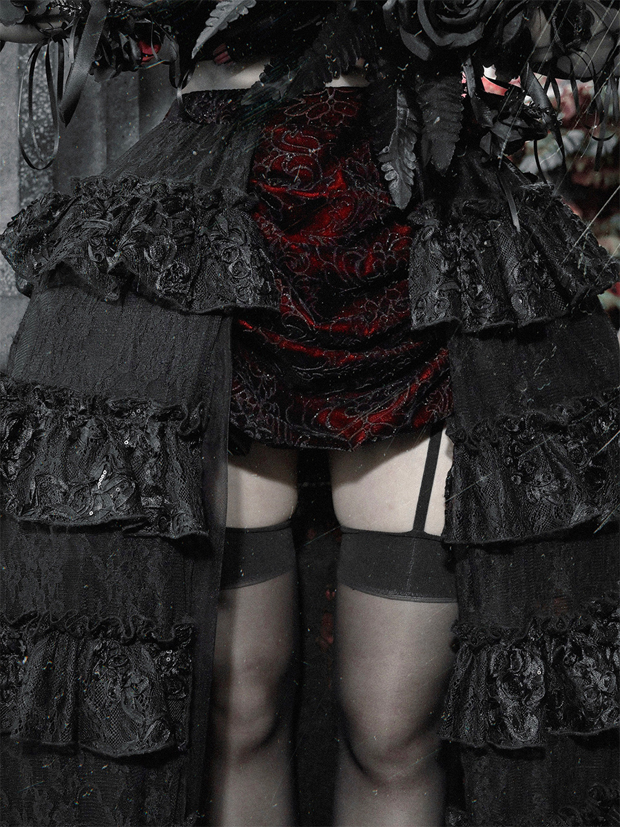 ゴシックロリータSK黒と赤のロリータスカートティアードハイウエストスカートドラマティックトレイン