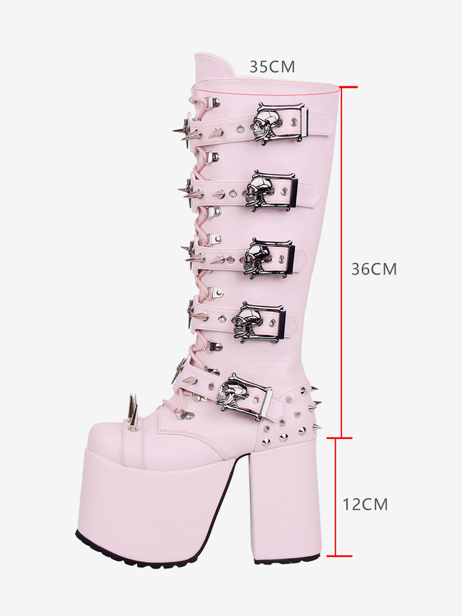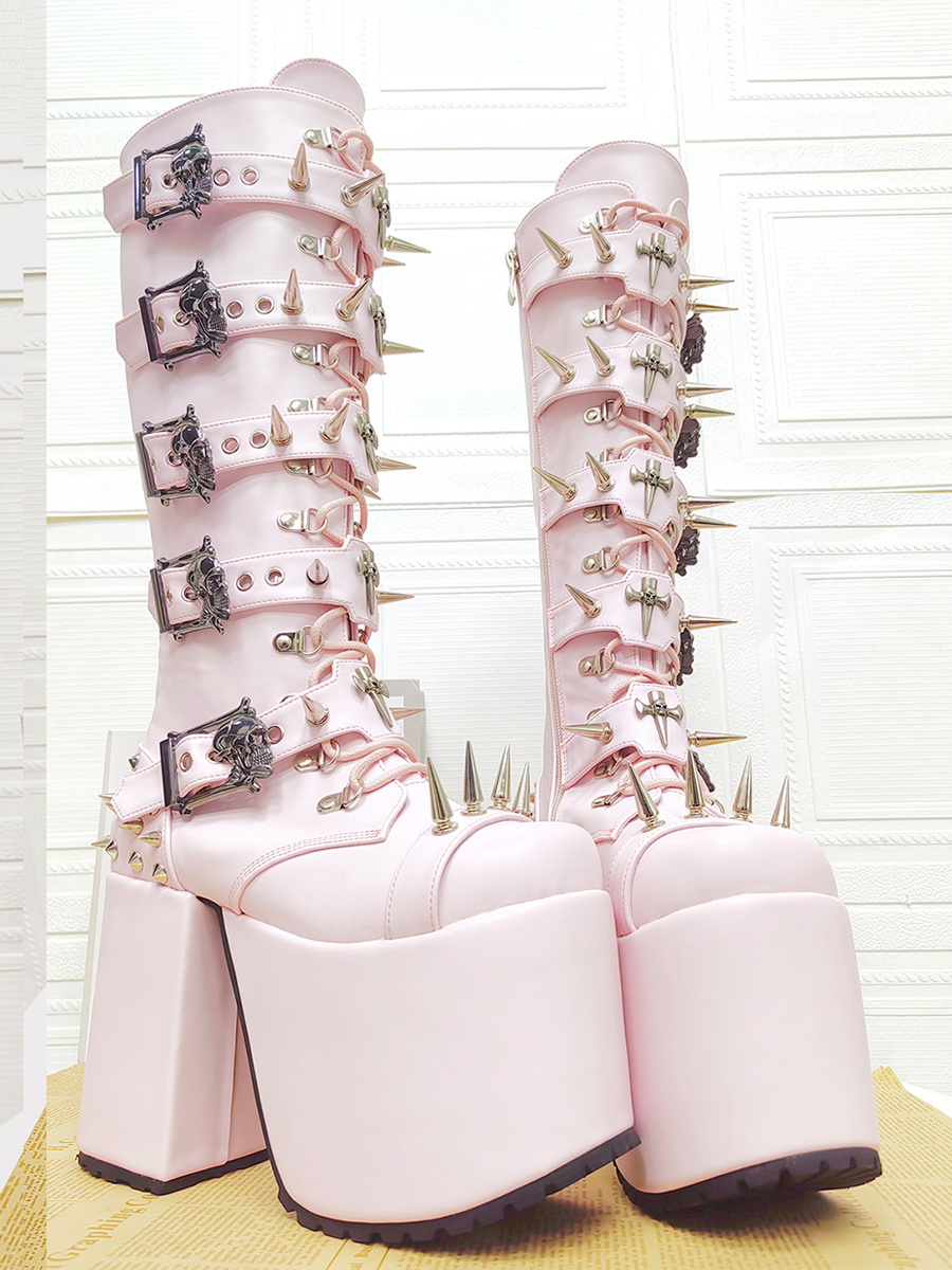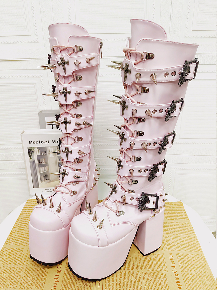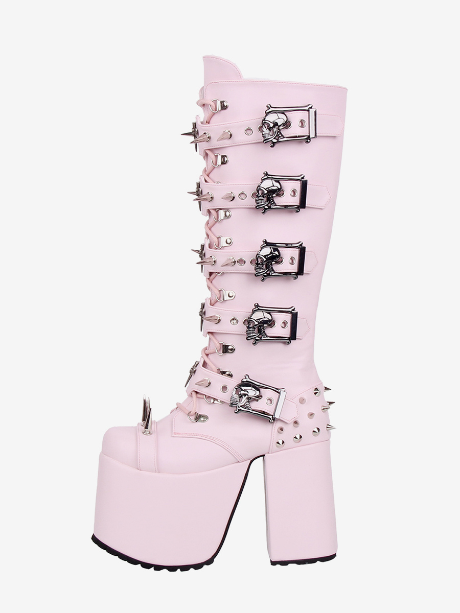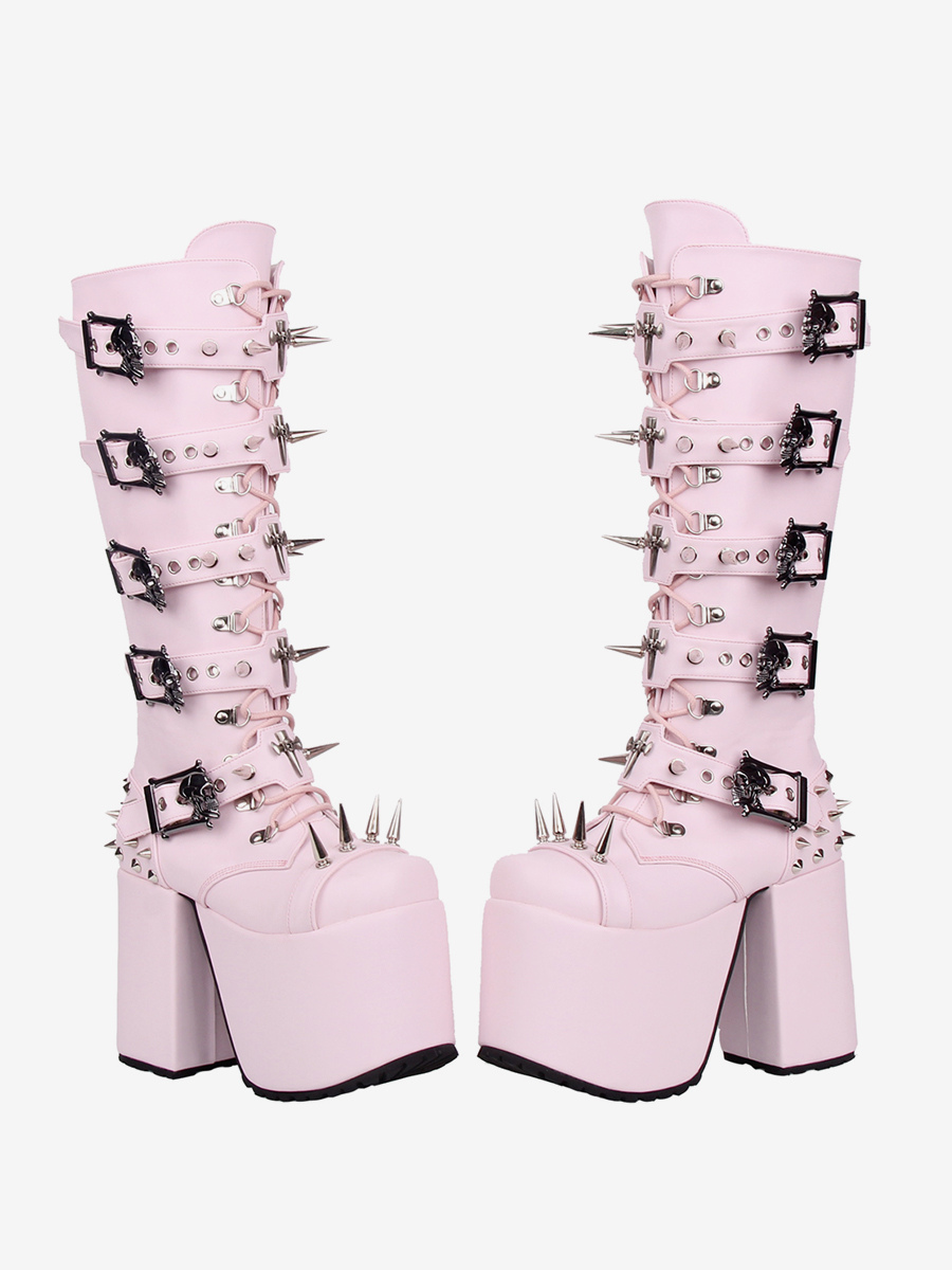 ゴシックパンクロリータブーツ ピンク PU ラウンドトゥ チャンキーヒール ニーハイ ロリータシューズ