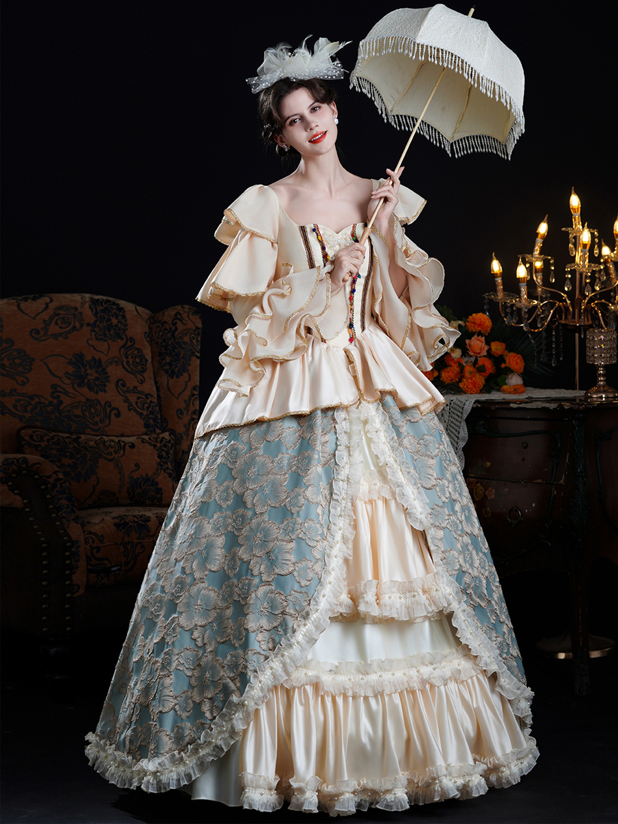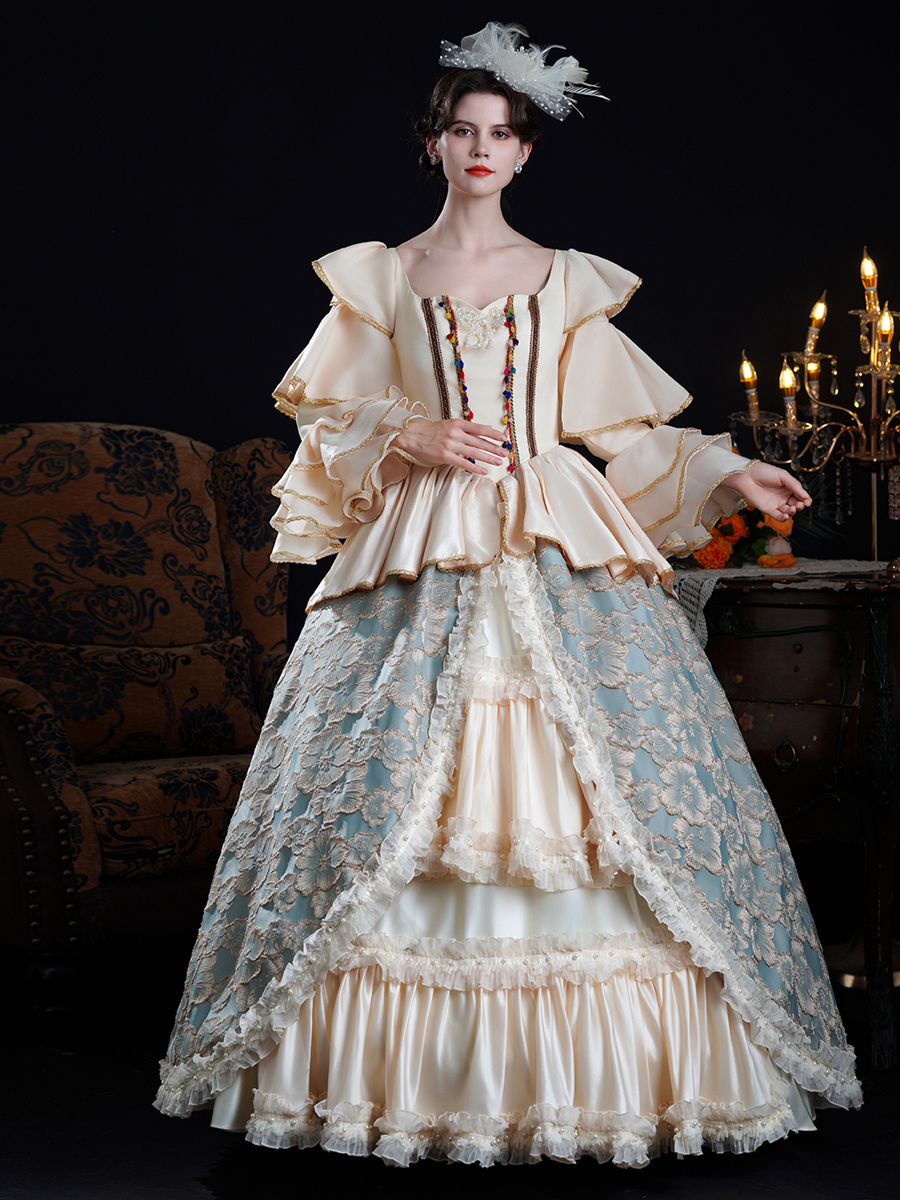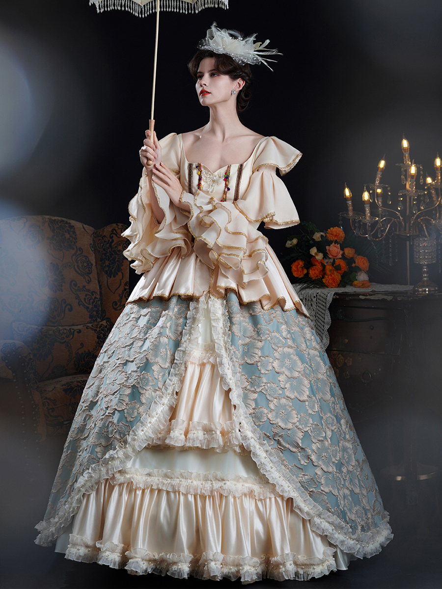 ロココ調レディースドレス ヴィンテージカラーブロック フリル 長袖 カラーブロック ボールガウン