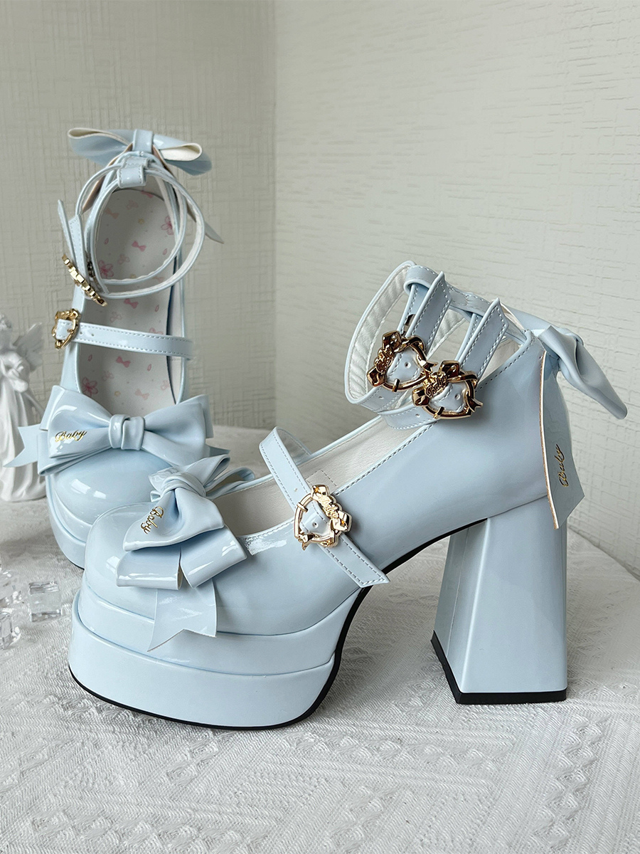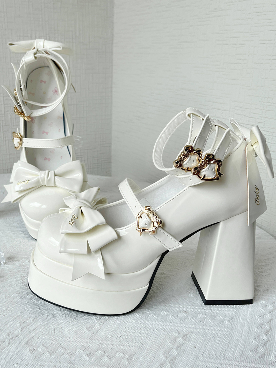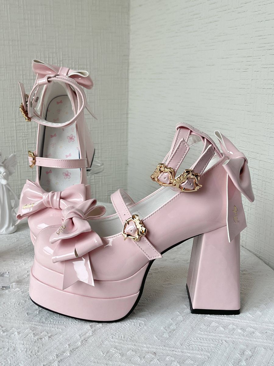 スイートバレエロリータシューズ ブラックリボン PUレザー チャンキーヒール ラウンドトゥ ロリータパンプス
