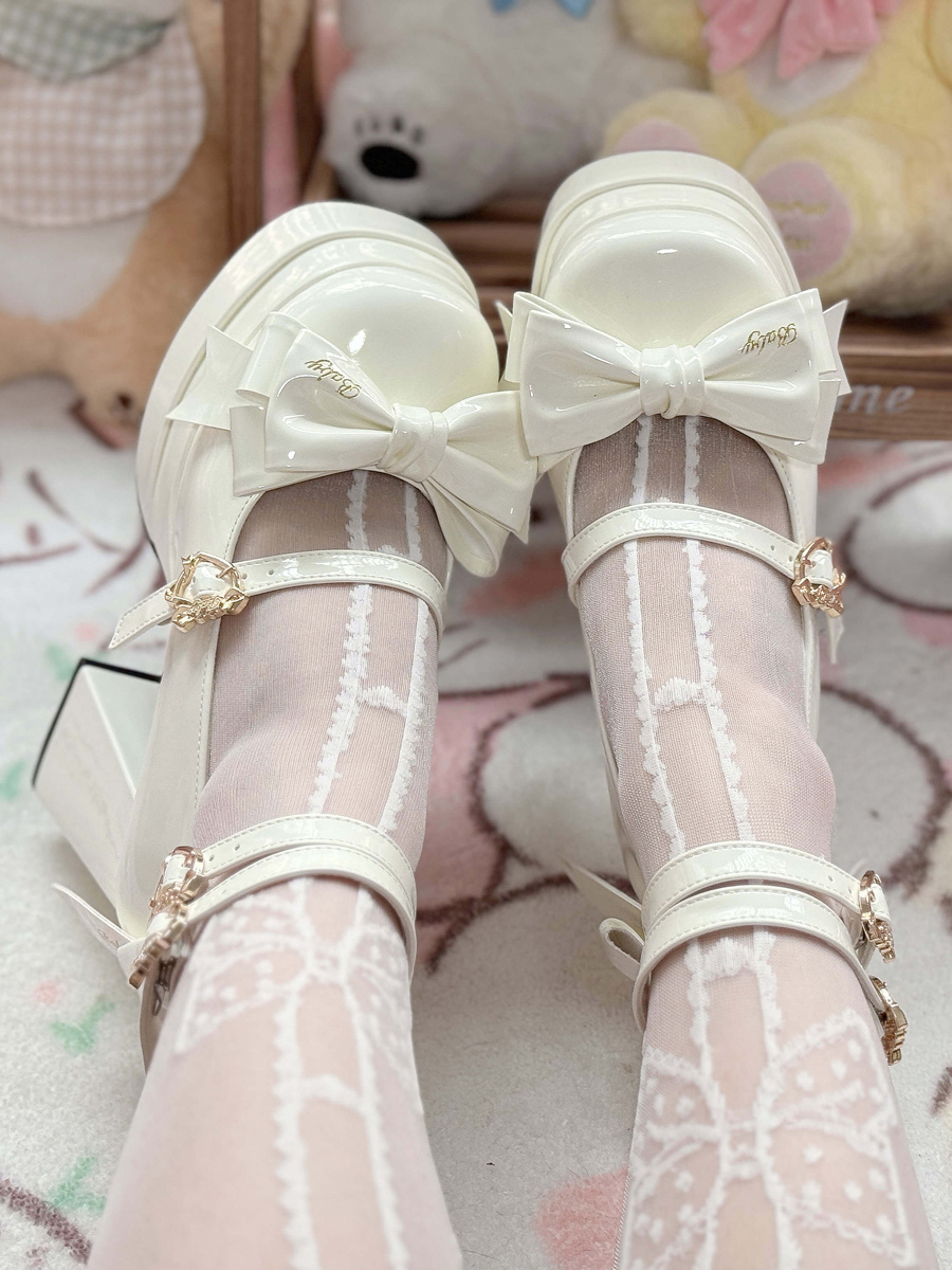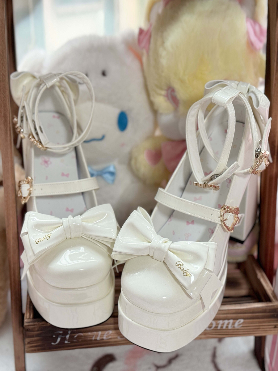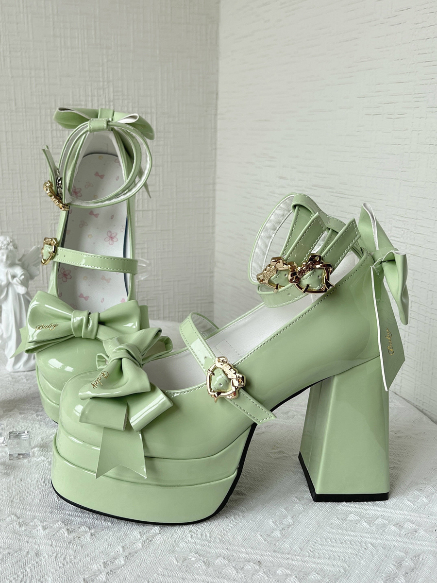 スイートバレエロリータシューズ ブラックリボン PUレザー チャンキーヒール ラウンドトゥ ロリータパンプス