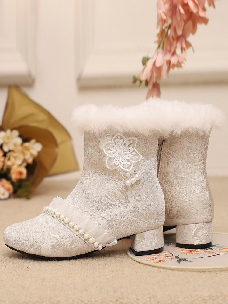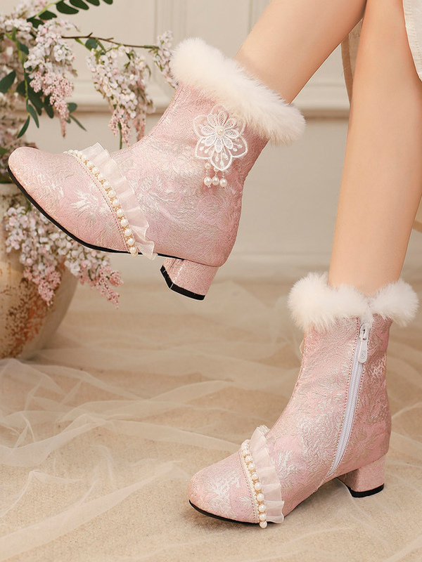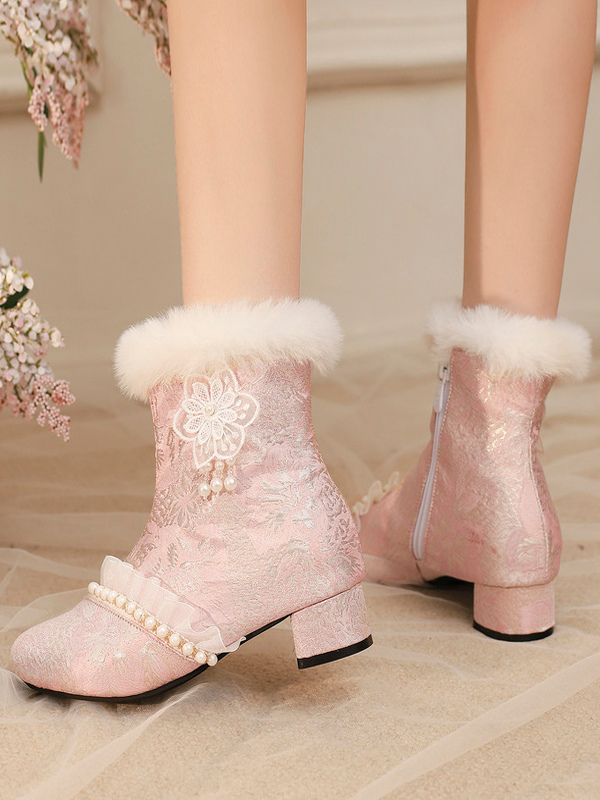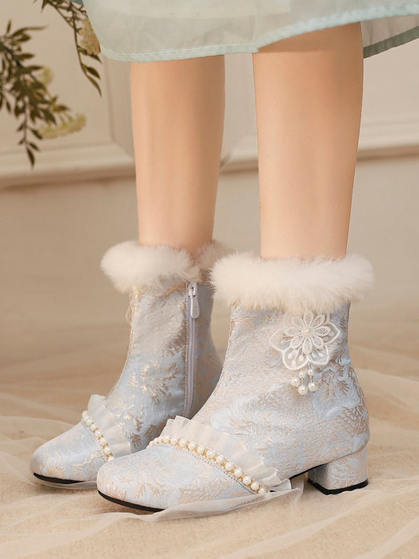 スイートロリータブーツ テキスタイルリボン ラウンドトゥ ライトスカイブルー ロリータシューズ