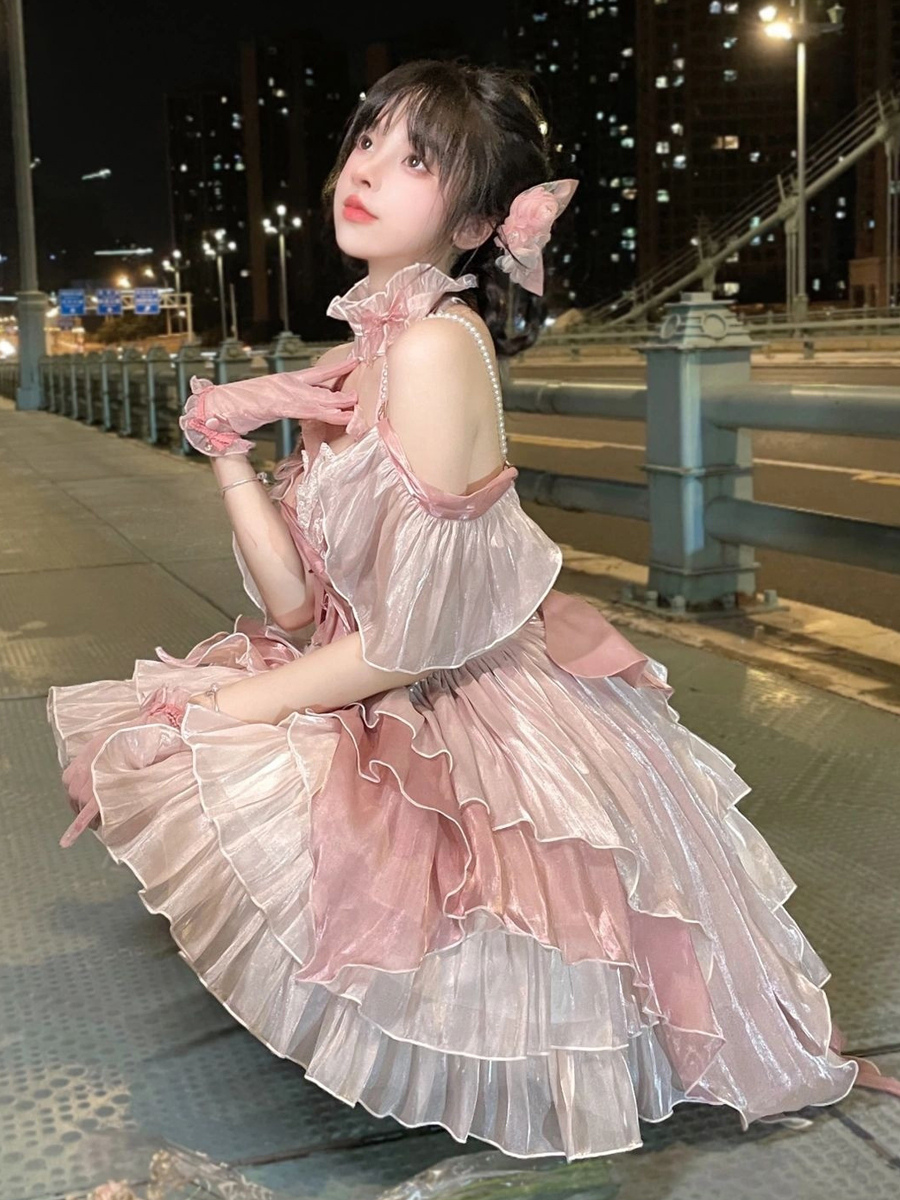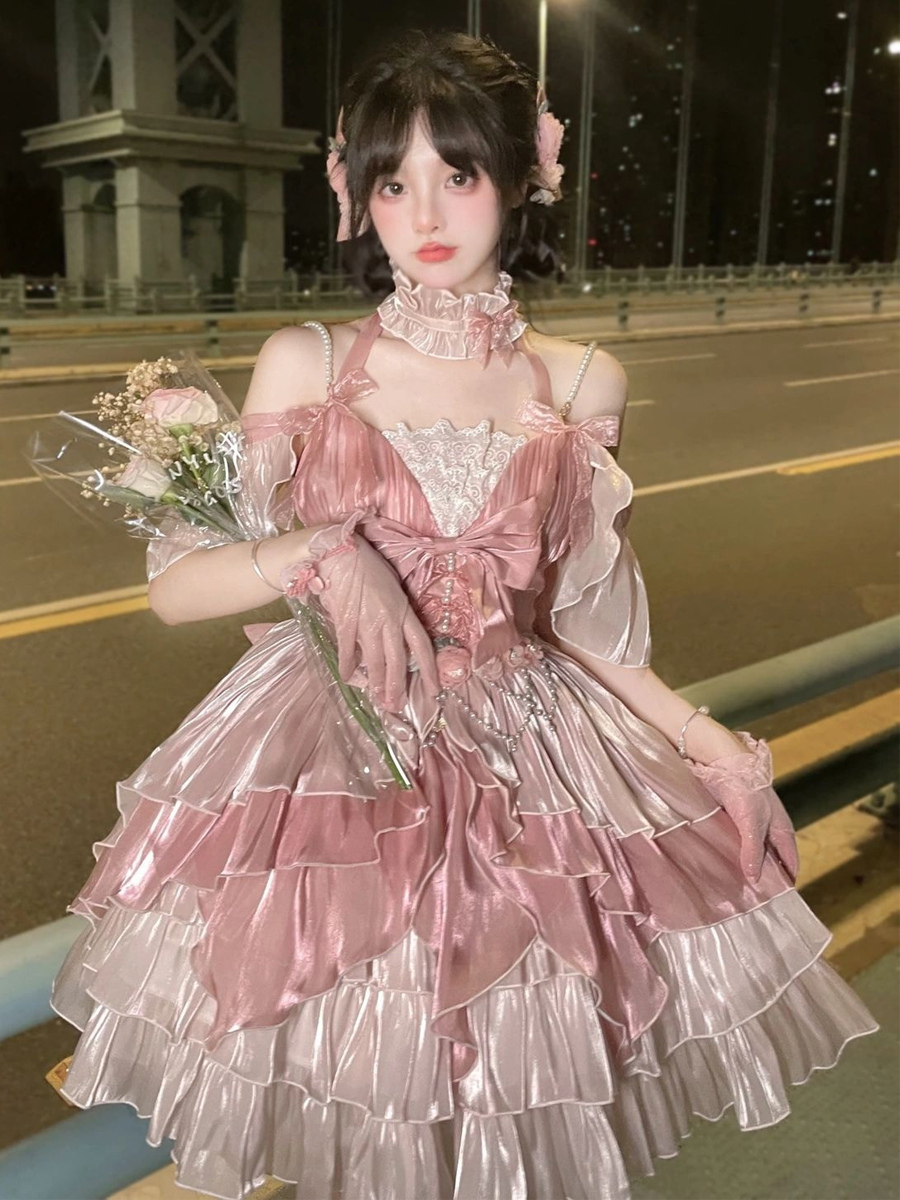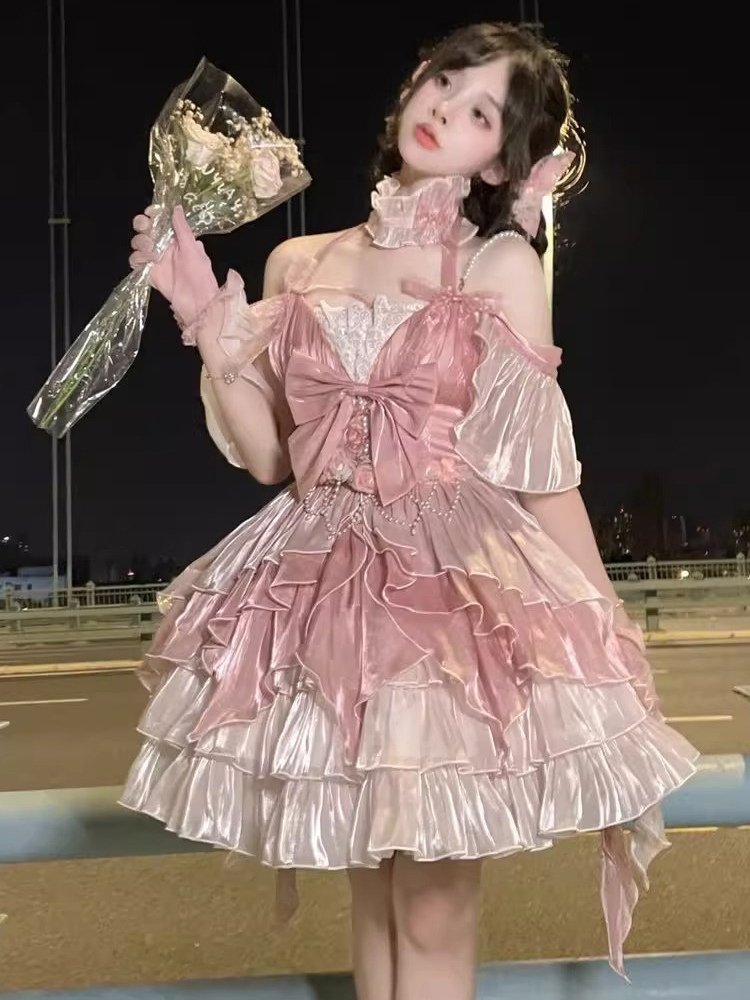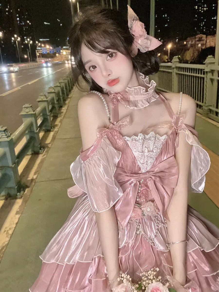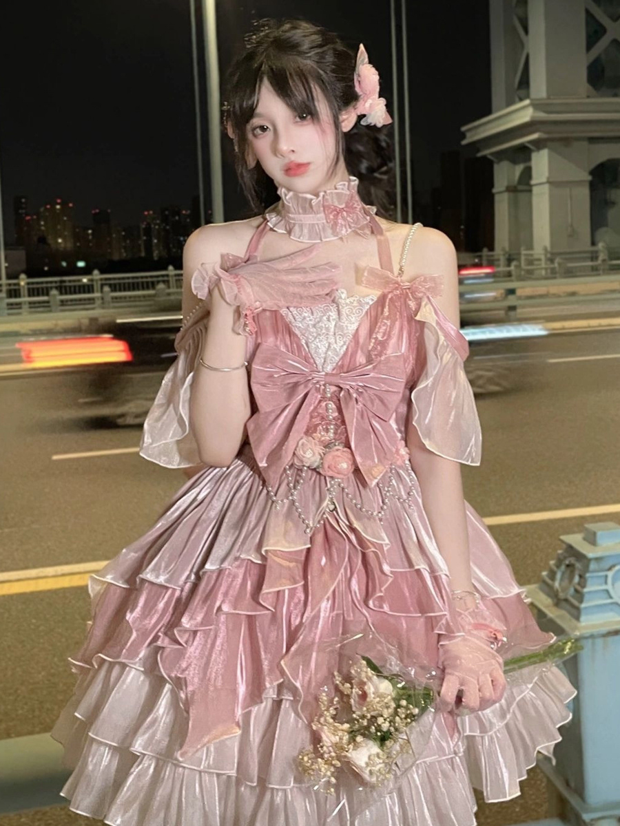 スイートロリータドレス リボンフリルドレス ピンクホルターネックロリータドレス