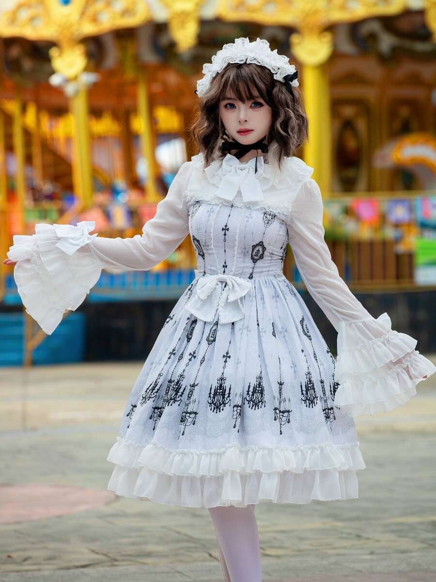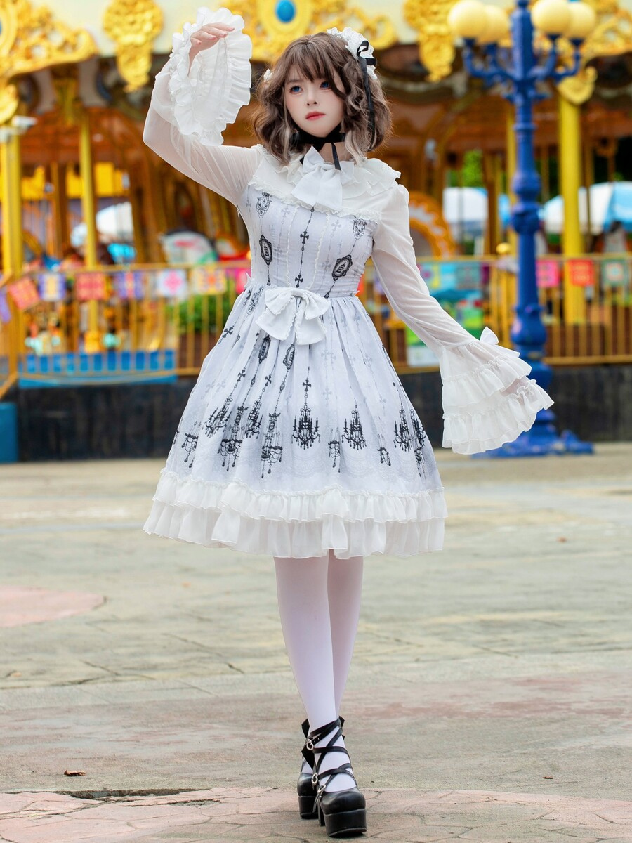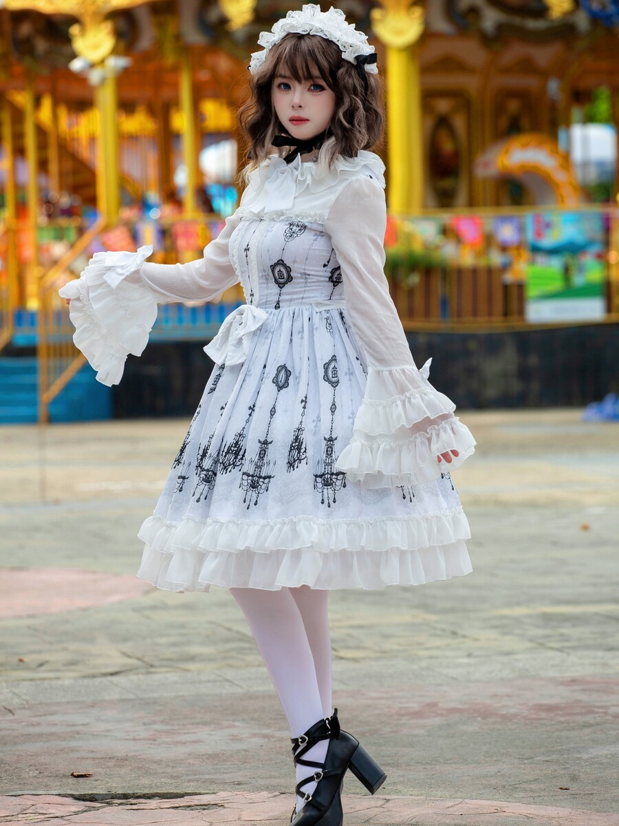 ロリータショー限定ゴシックロリータドレス 建築プリント ライトパターン ホワイト ロングスリーブ