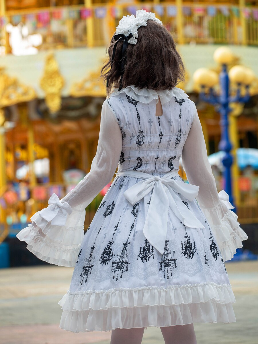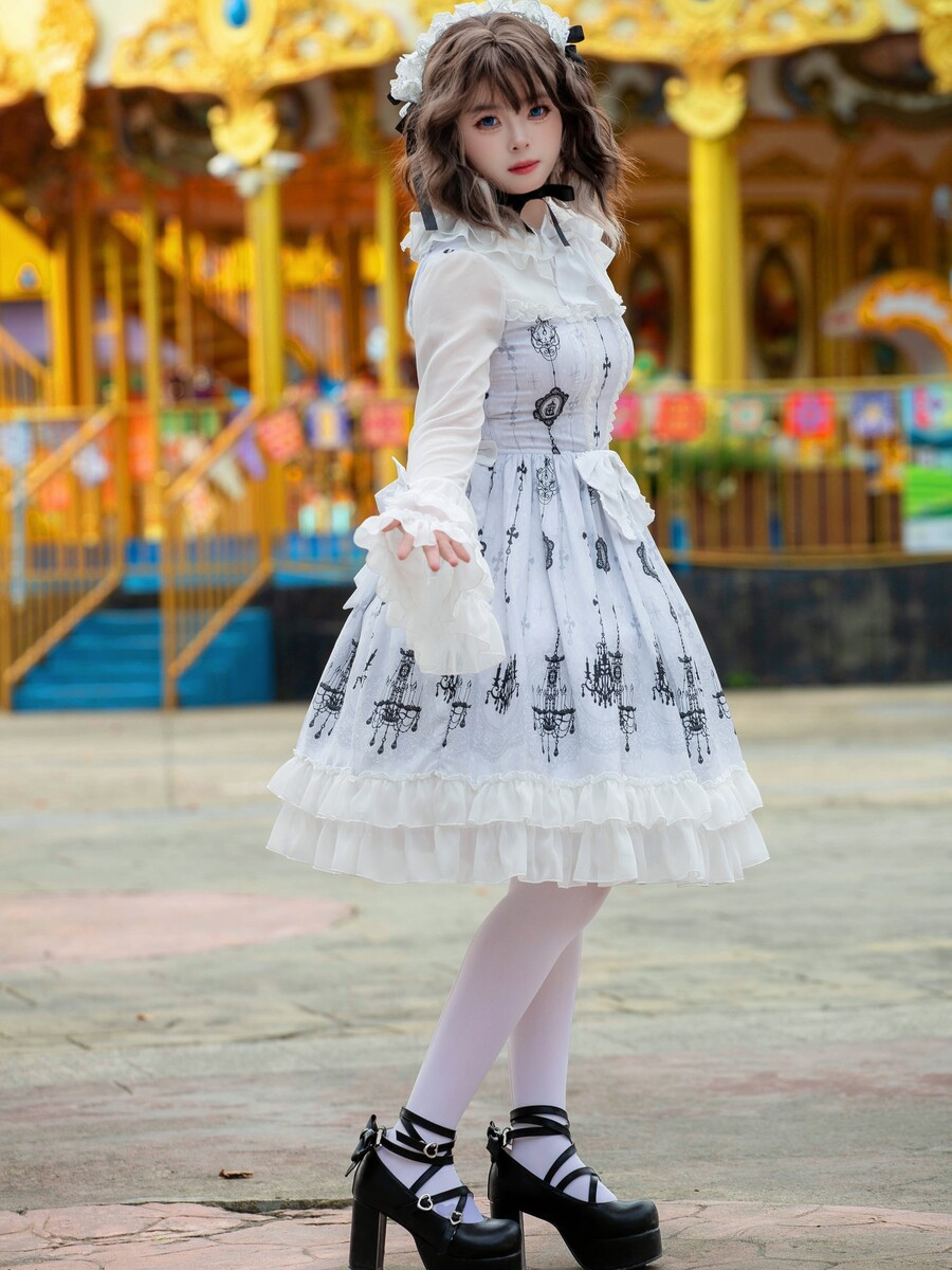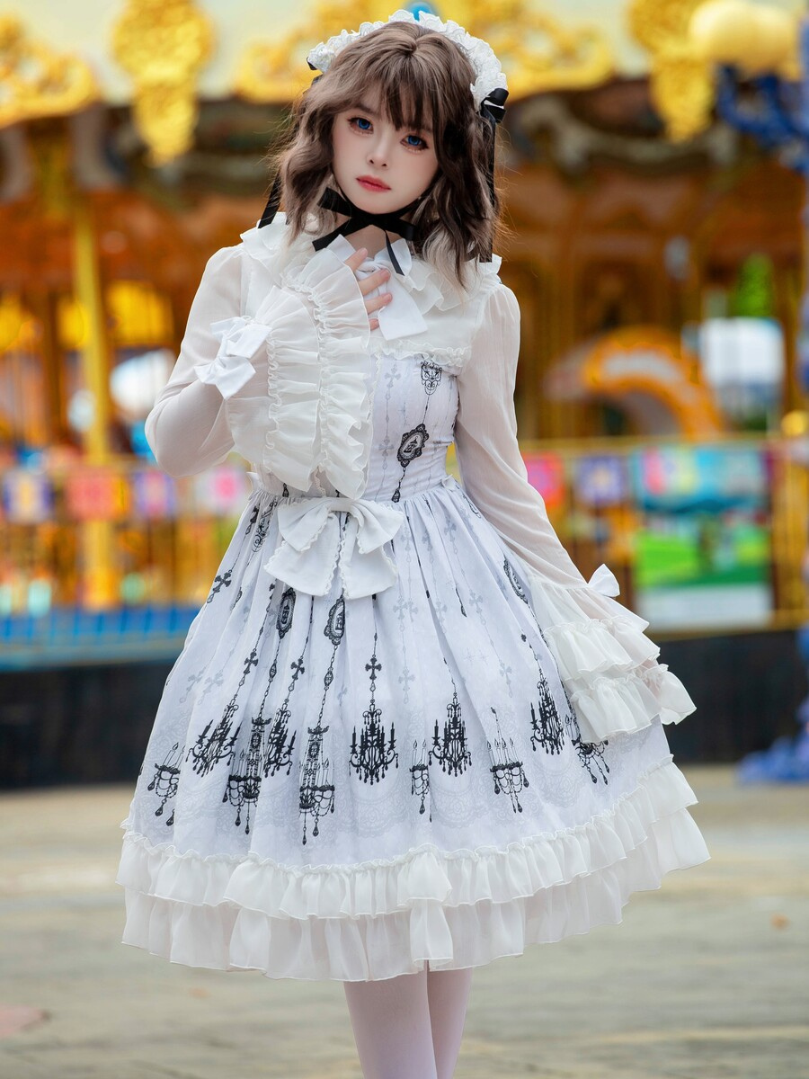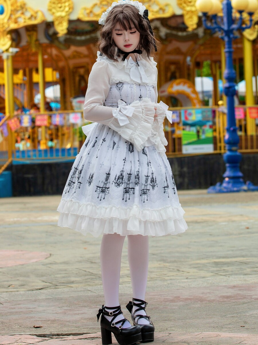 ロリータショー限定ゴシックロリータドレス 建築プリント ライトパターン ホワイト ロングスリーブ