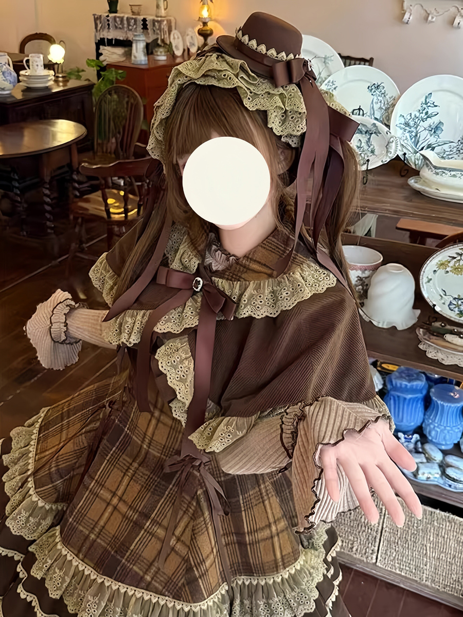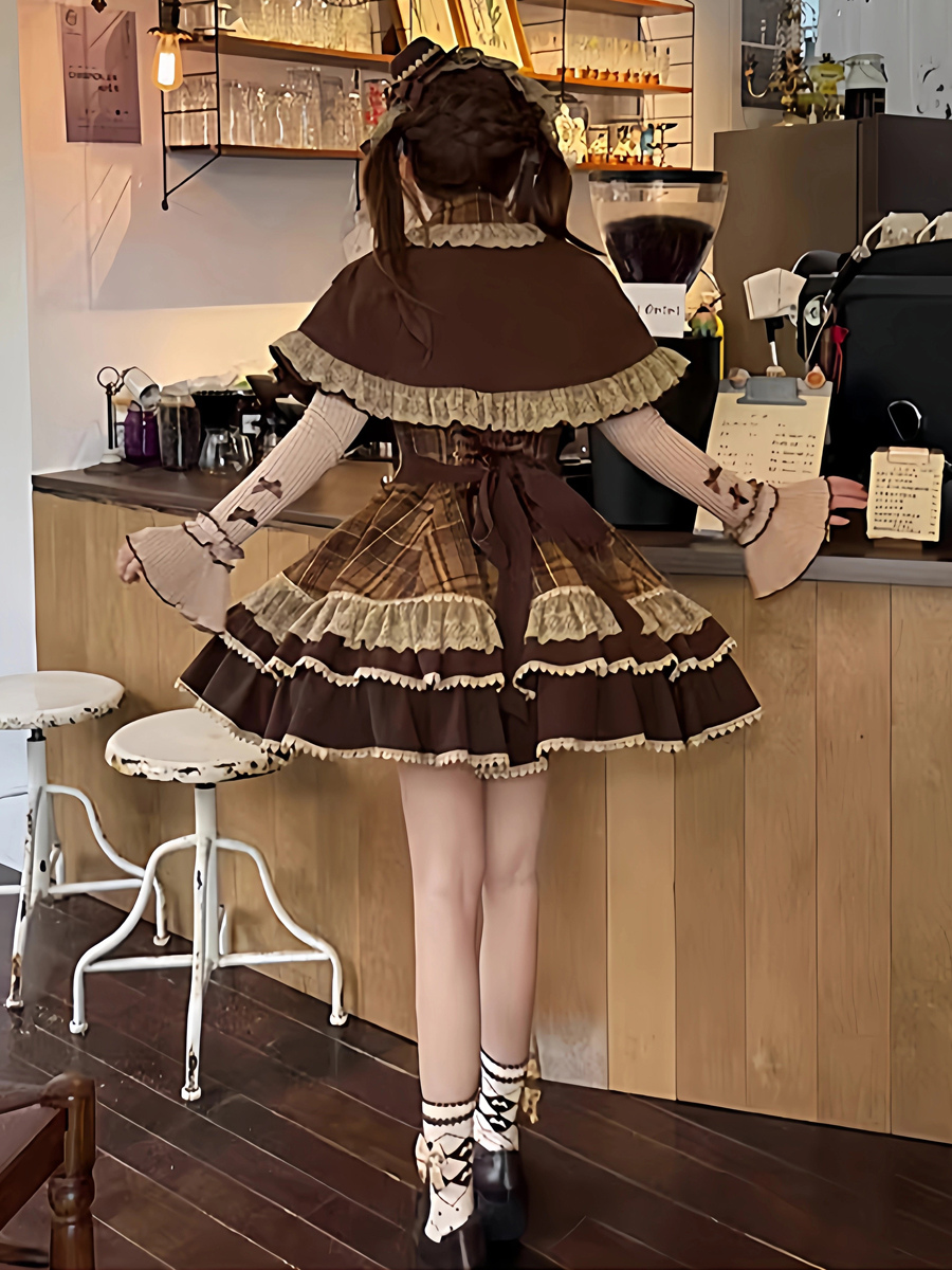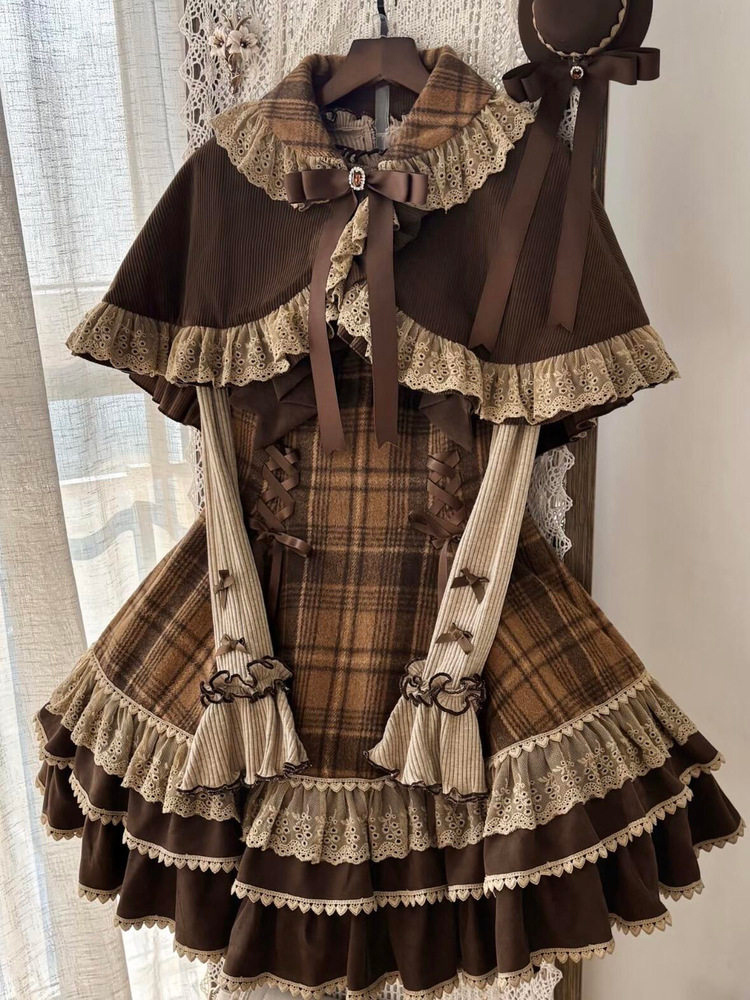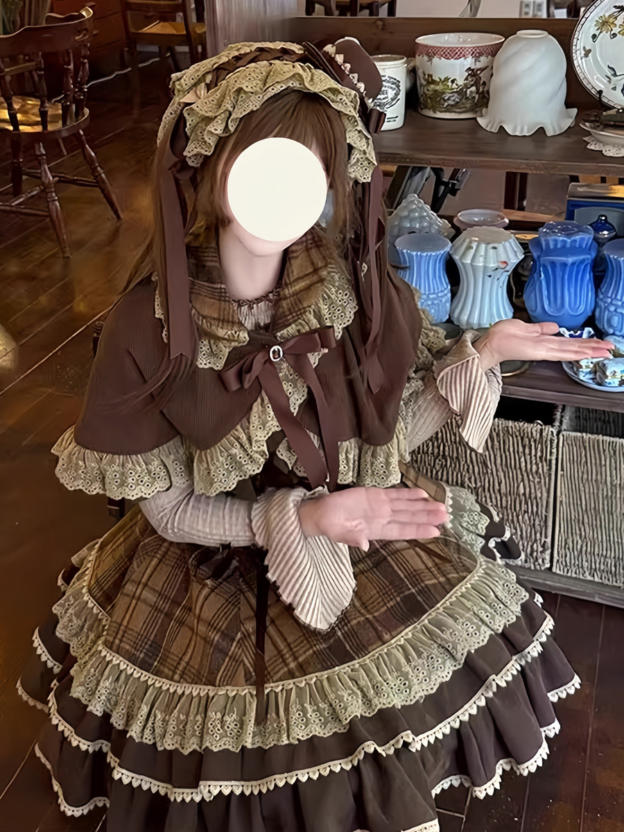 スイートロリータセット ブラウン フリル リボン チェック柄 長袖 マント ドレス トップスセット