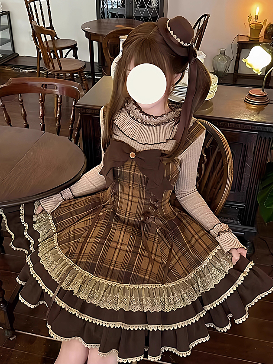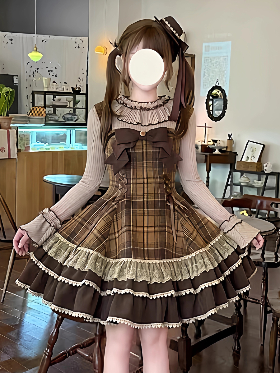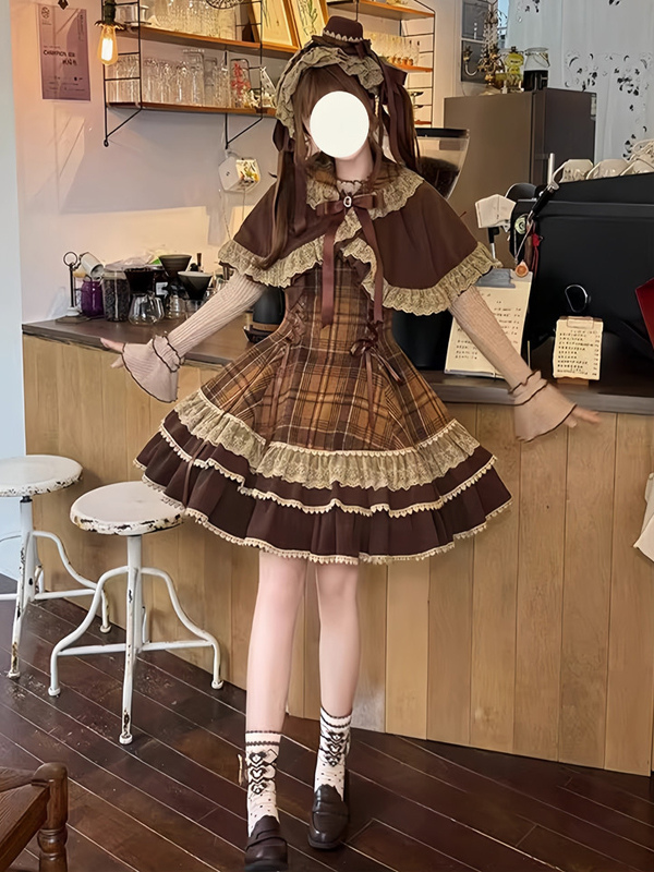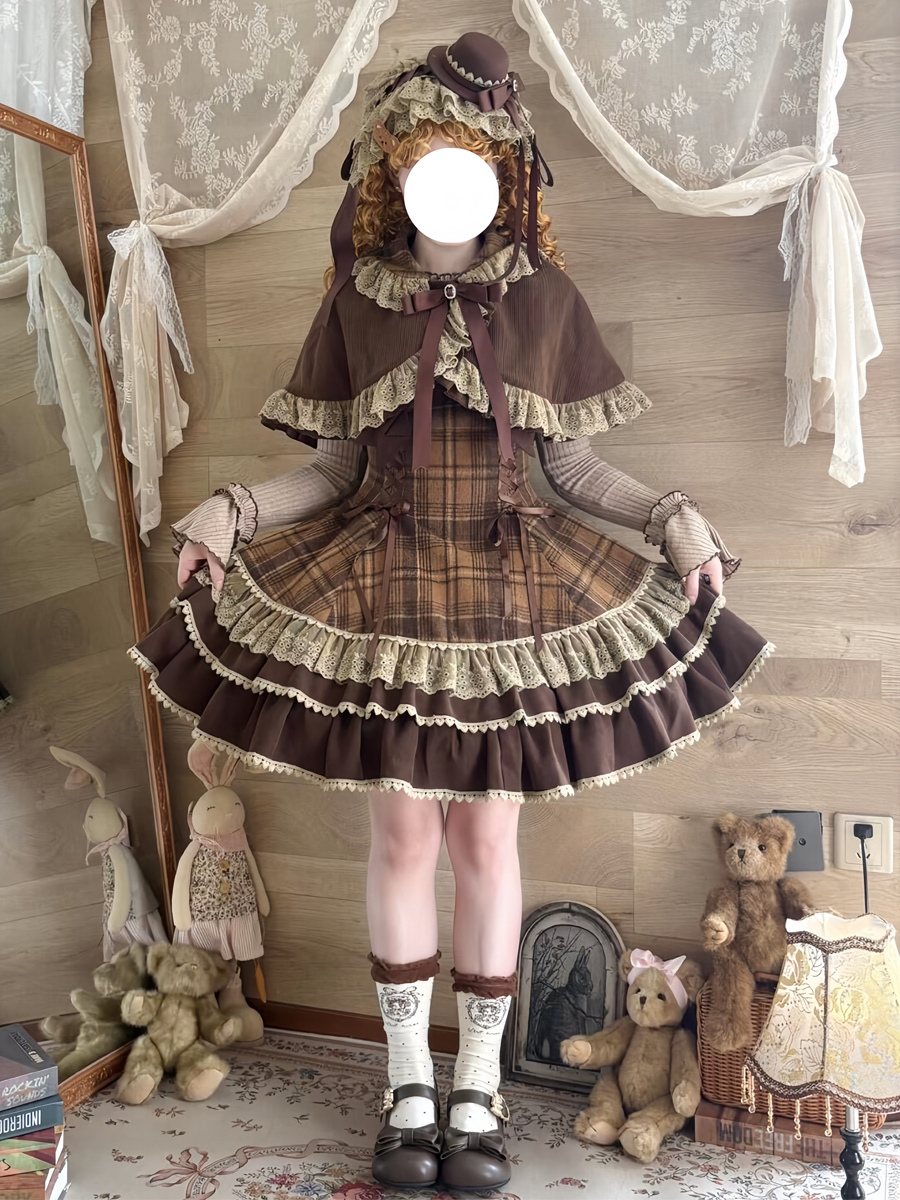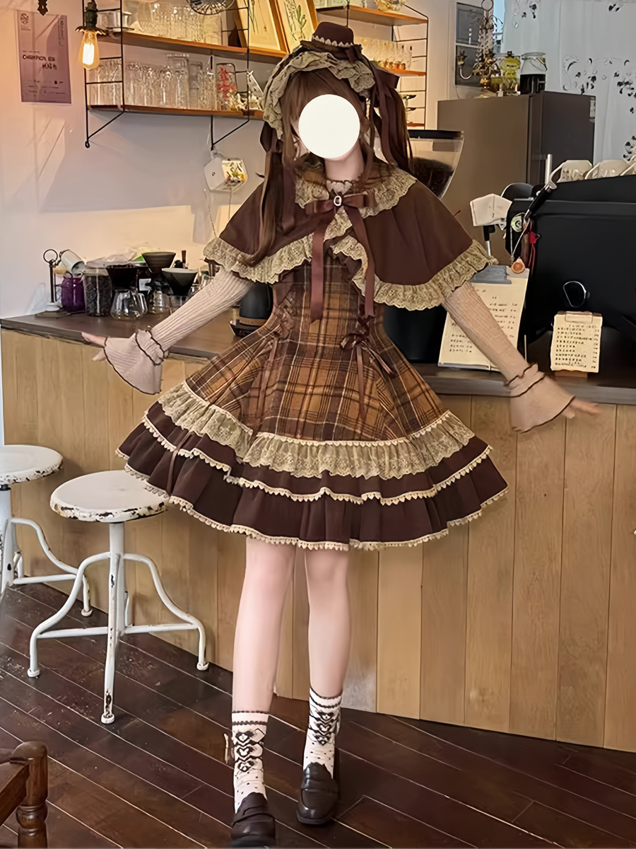 スイートロリータセット ブラウン フリル リボン チェック柄 長袖 マント ドレス トップスセット