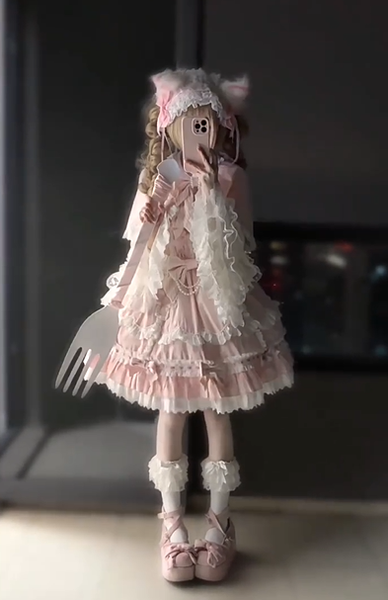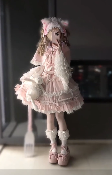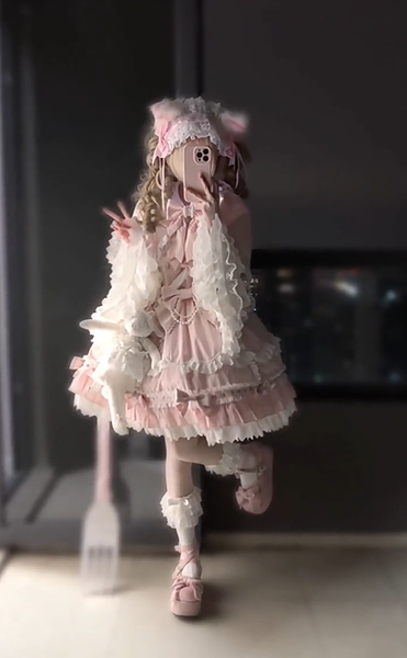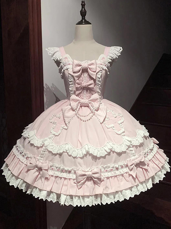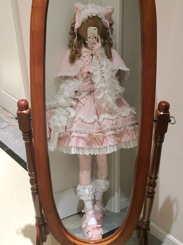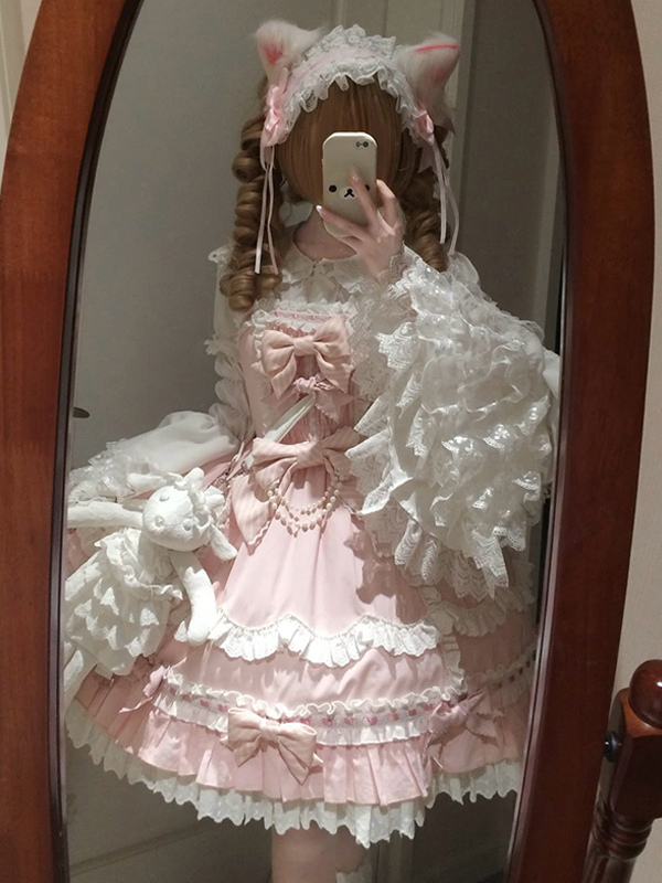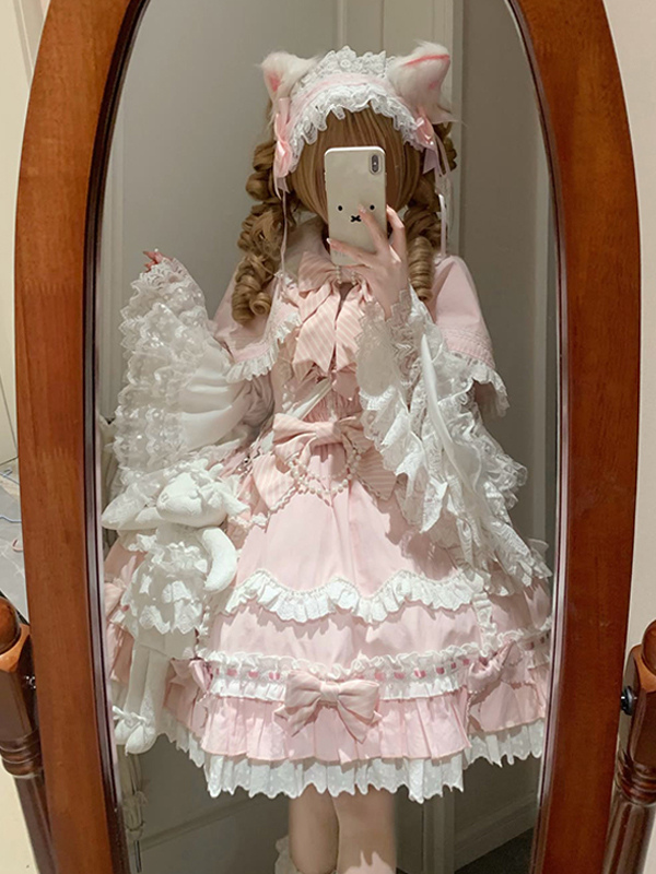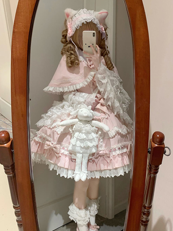 スイートロリータセット プリンセススタイル ピンク フリル リボン JSK ドレス 取り外し可能なケープセット