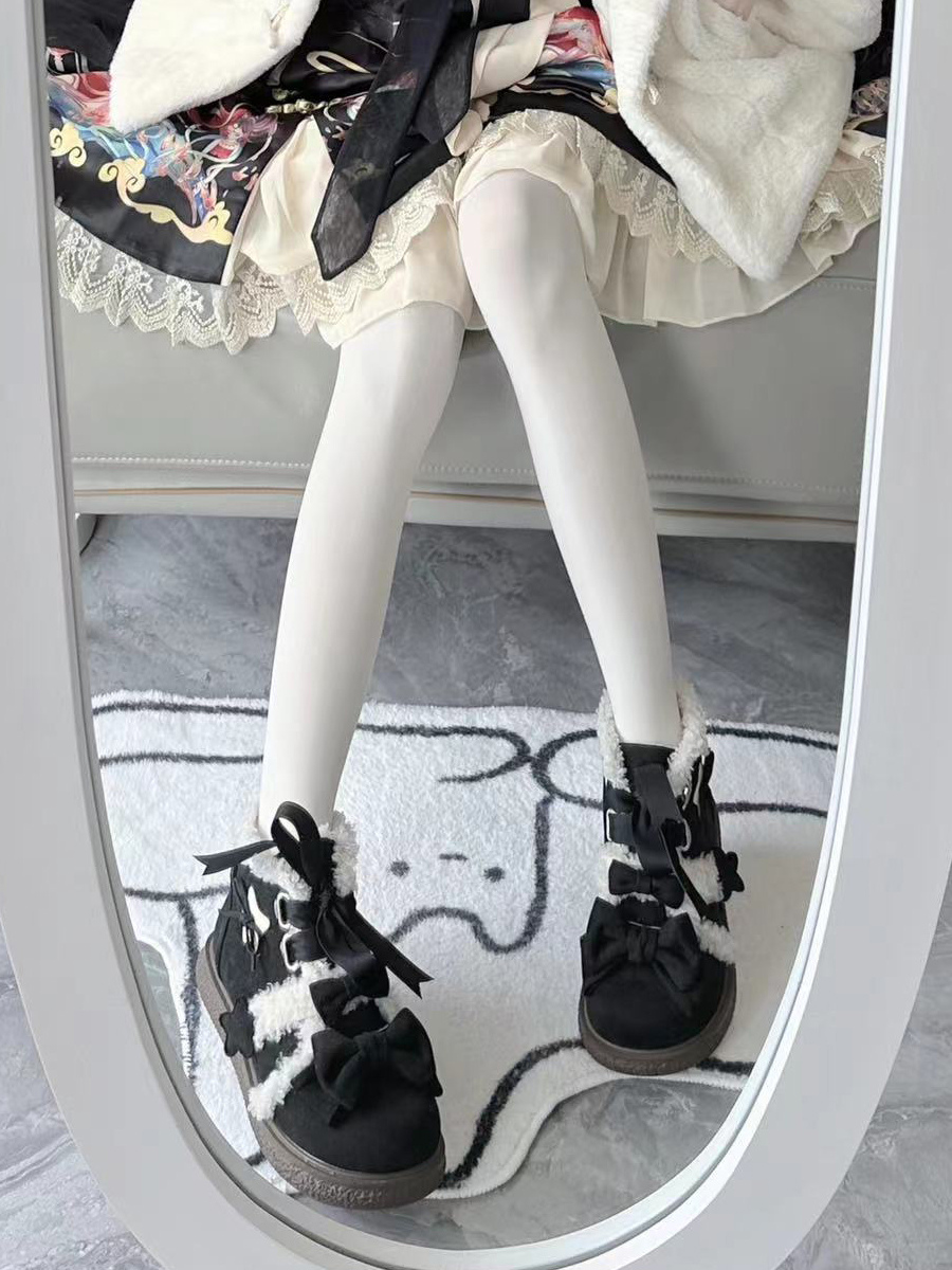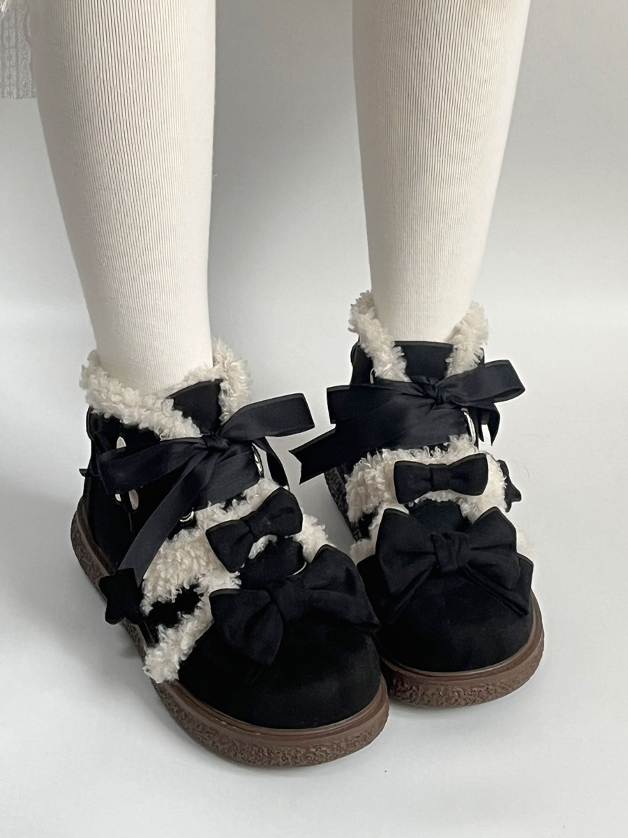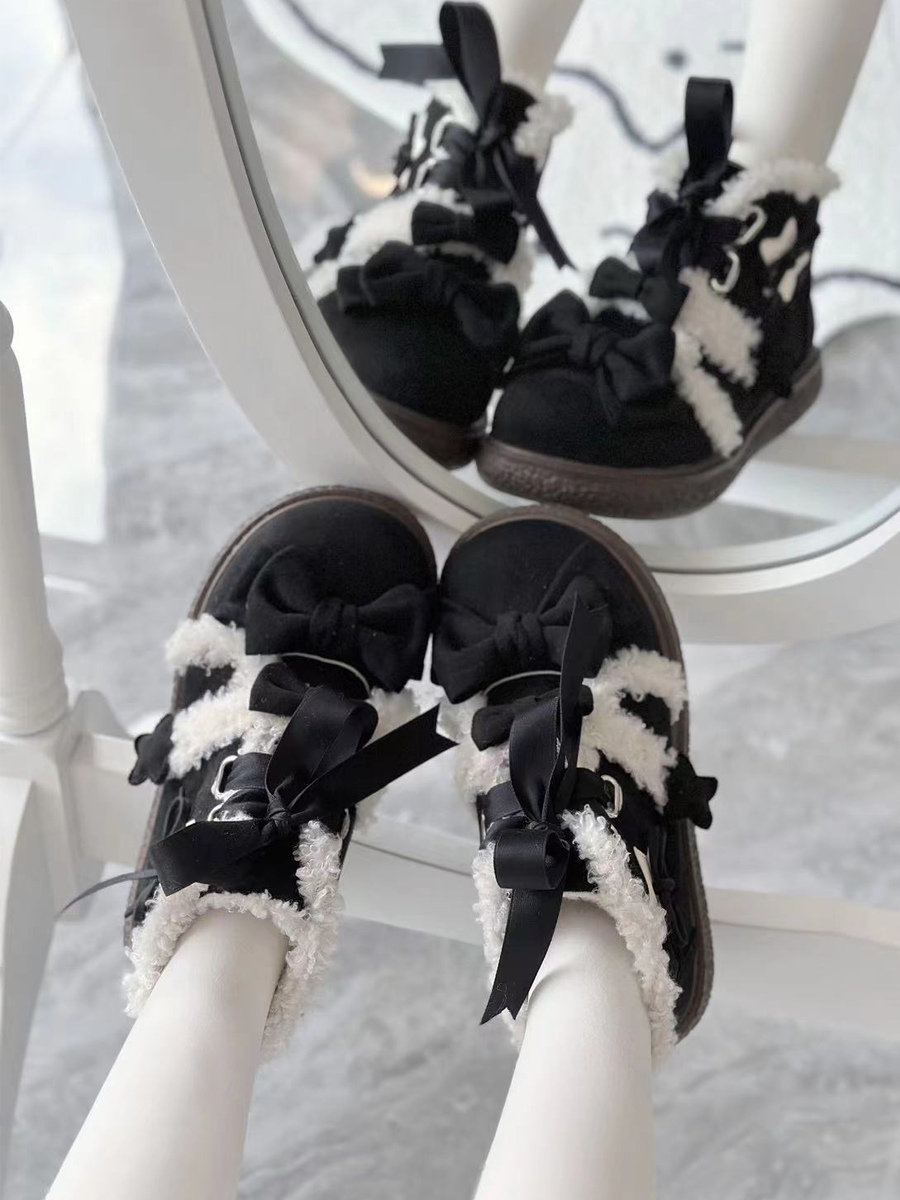 スイートロリータシューズ ブラックリボン マイクロスエードアッパー フラットロリータパンプス