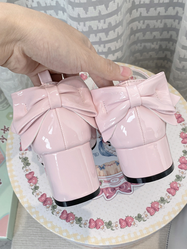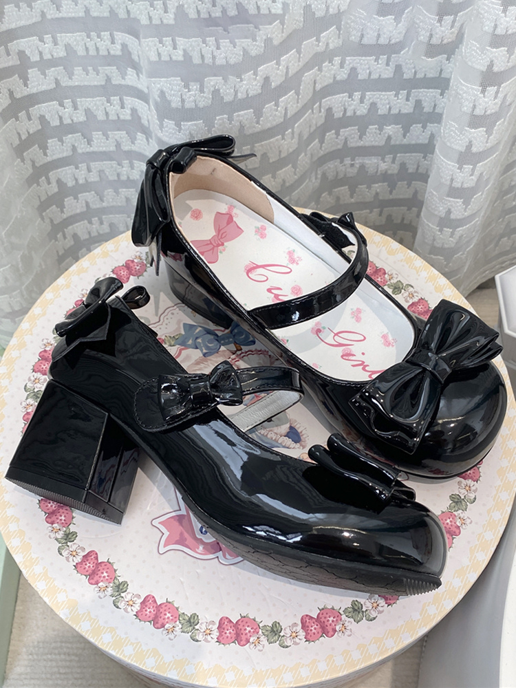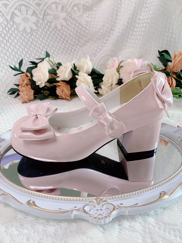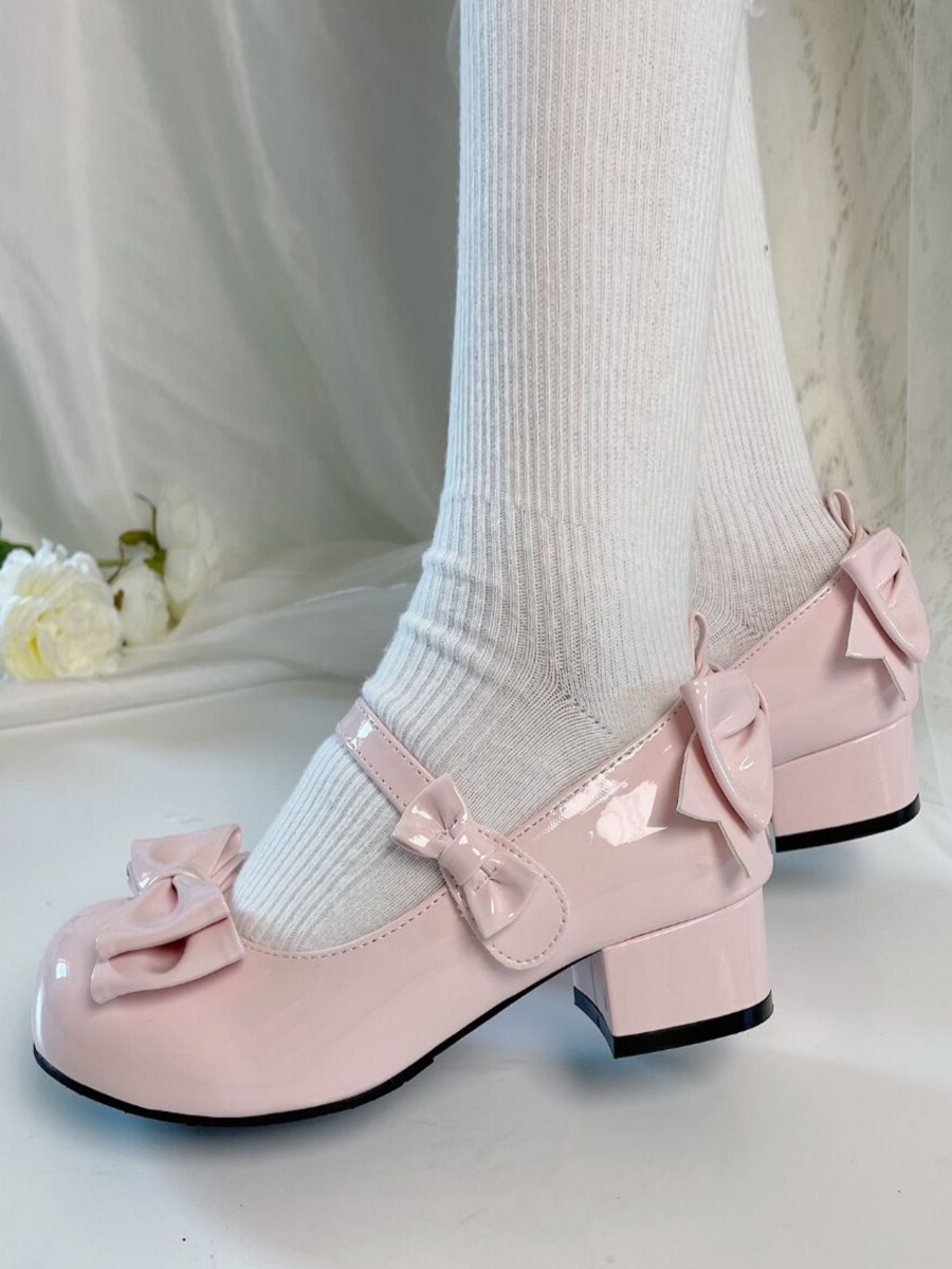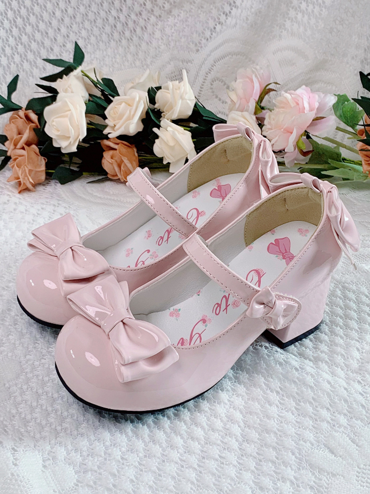 スイートロリータシューズ ピンクリボン ラウンドトゥ PUレザー パピーヒール ロリータパンプス